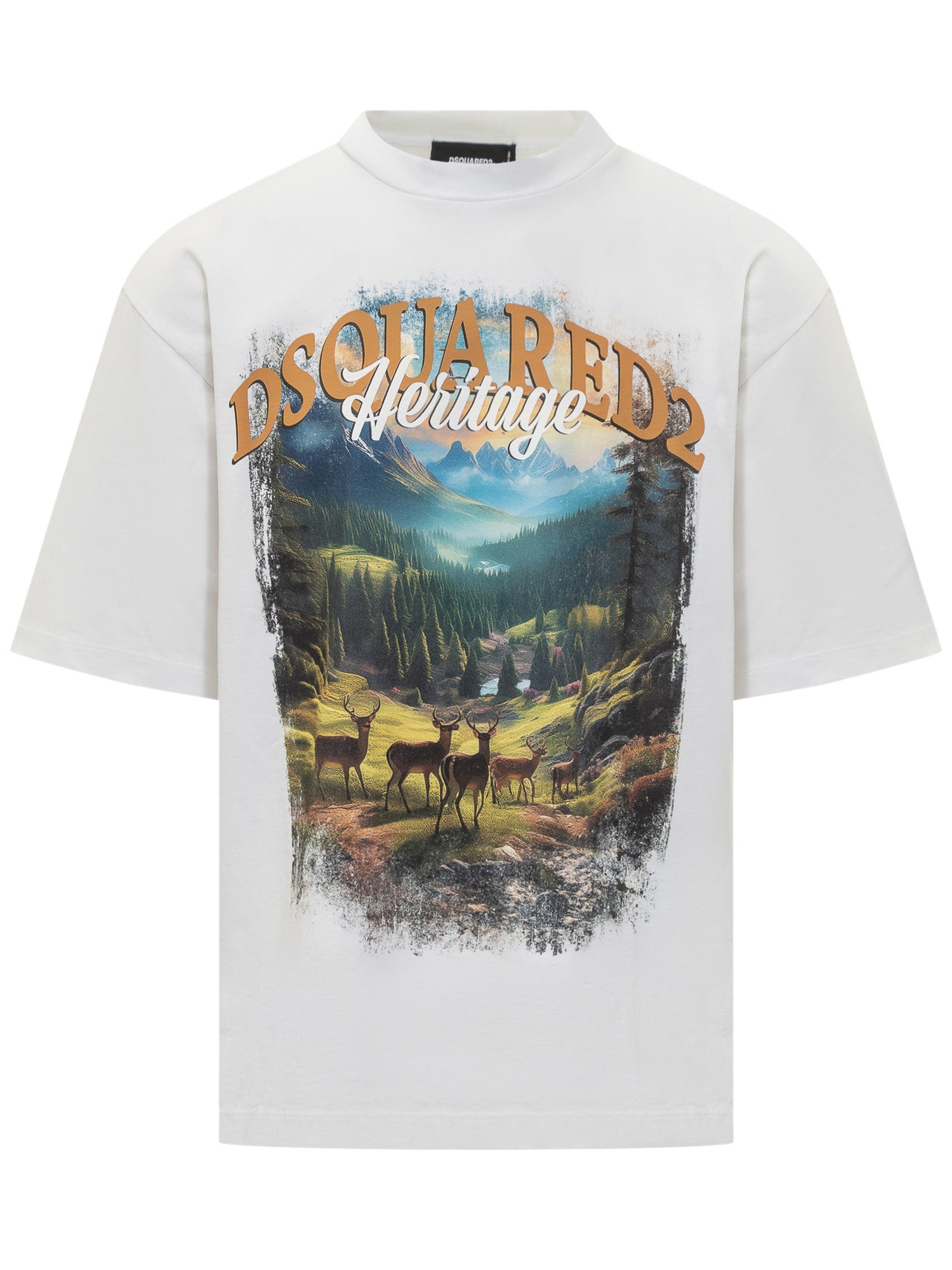 T-shirt bianca DSQUARED2 in cotone con stampa paesaggistica e logo.