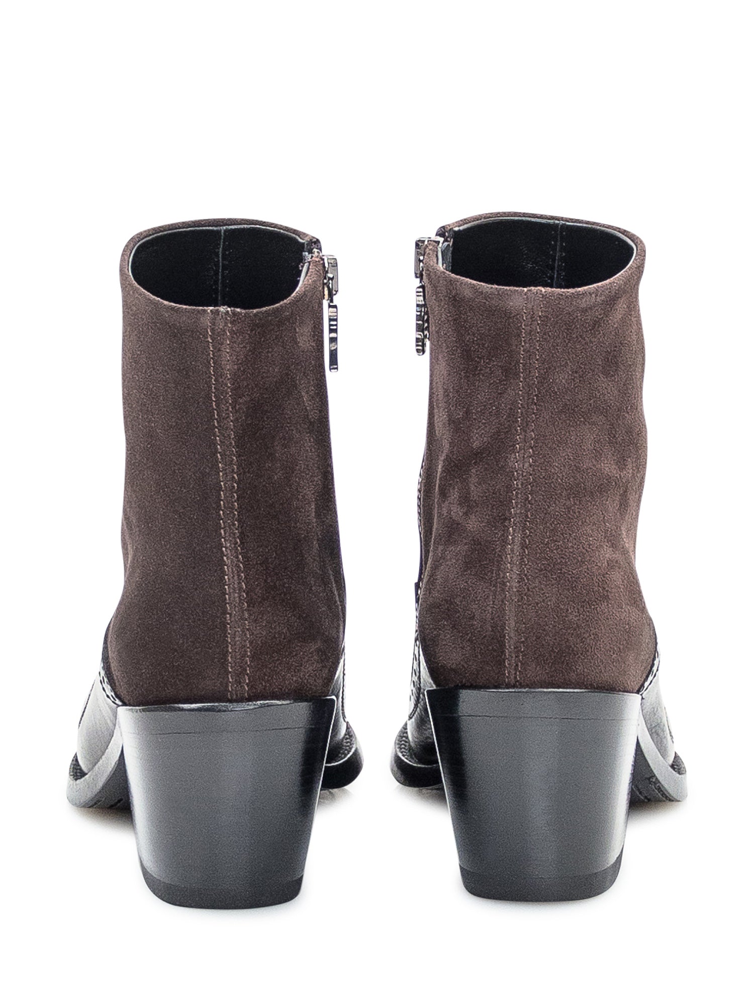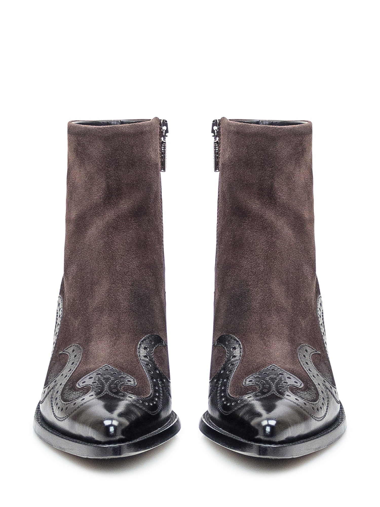 Stivaletti texani Duca Nero in camoscio marrone con punta e dettagli in pelle nera traforata. Tacco medio e design western.