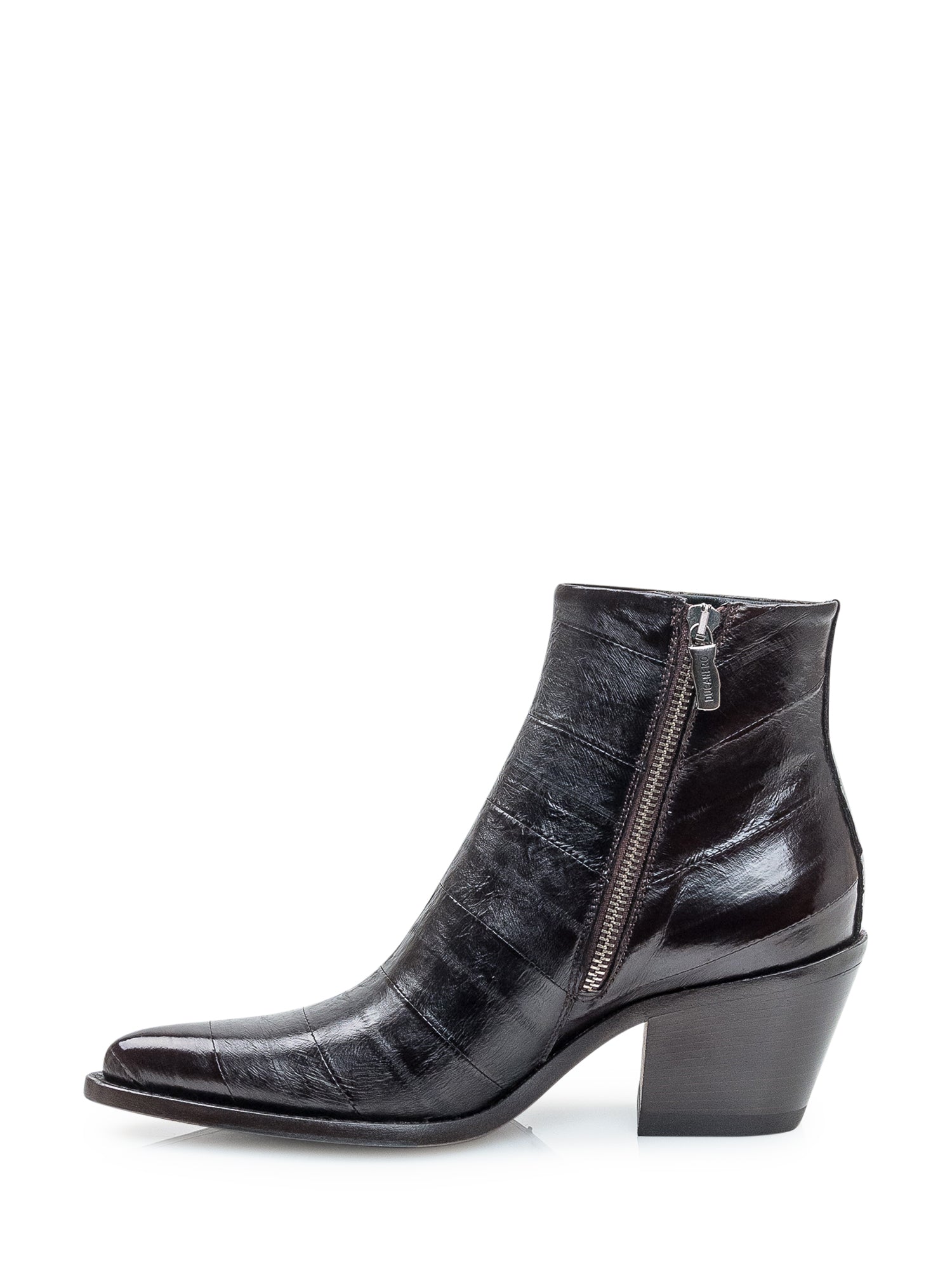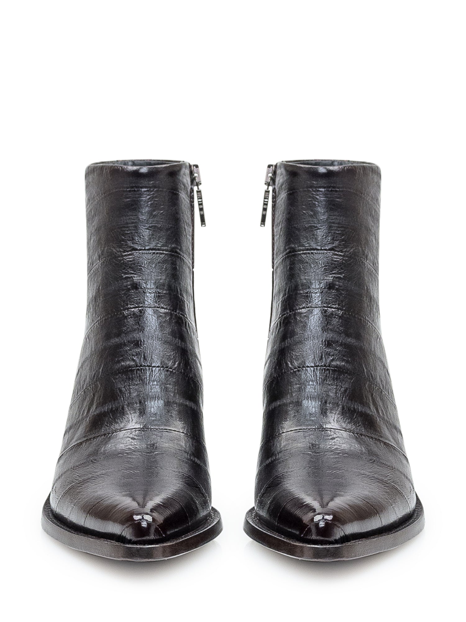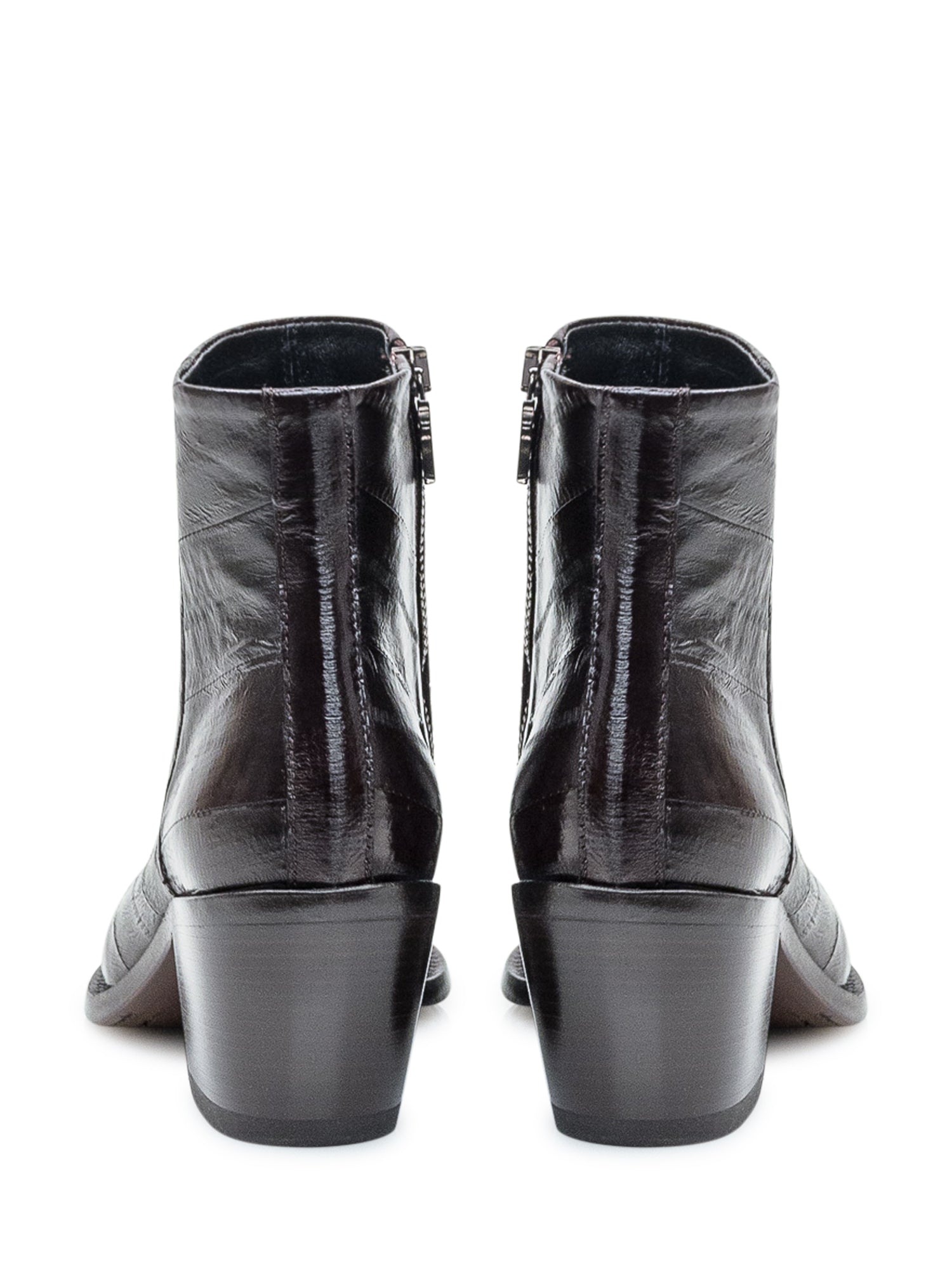 Stivaletti Ducanero in pelle nera con finitura lucida e punta affusolata. Il tacco medio e la zip laterale assicurano comfort e stile.