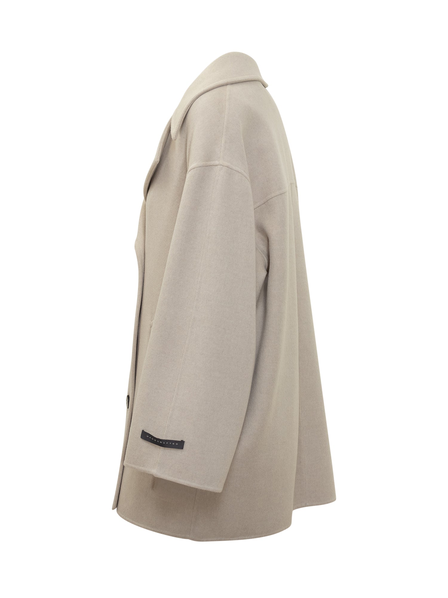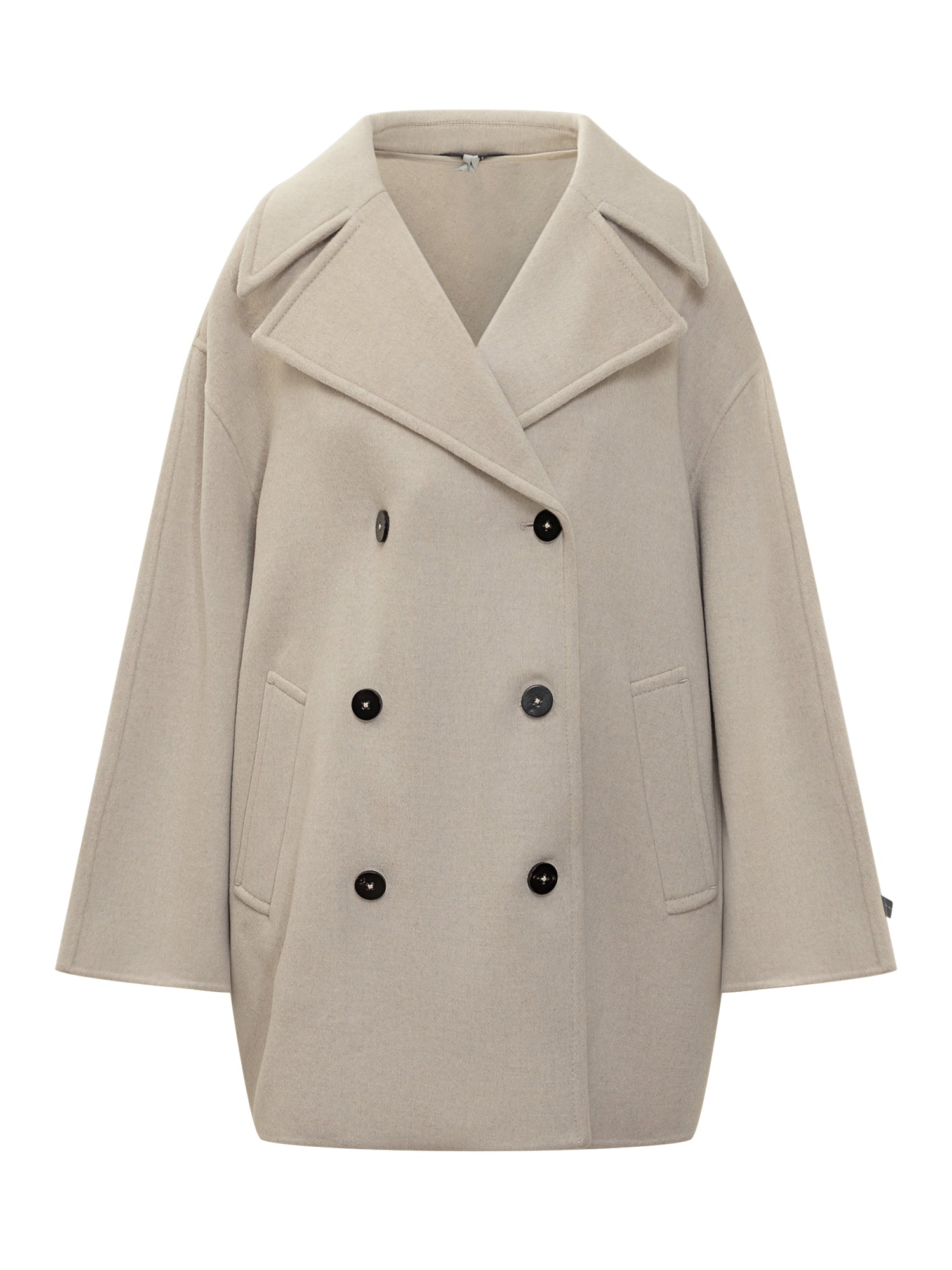 Cappotto Duno doppiopetto oversize in lana beige, con revers ampi e bottoni a contrasto.