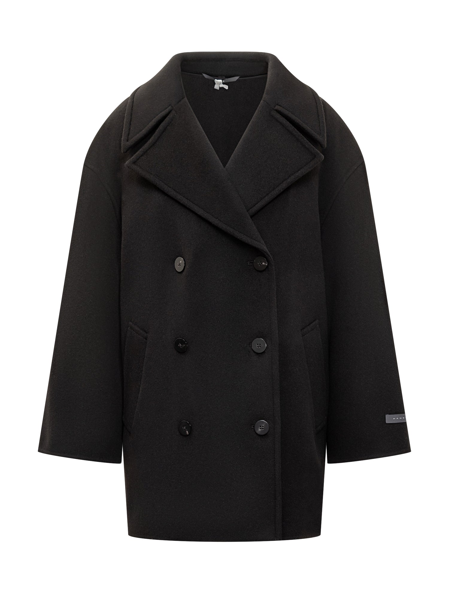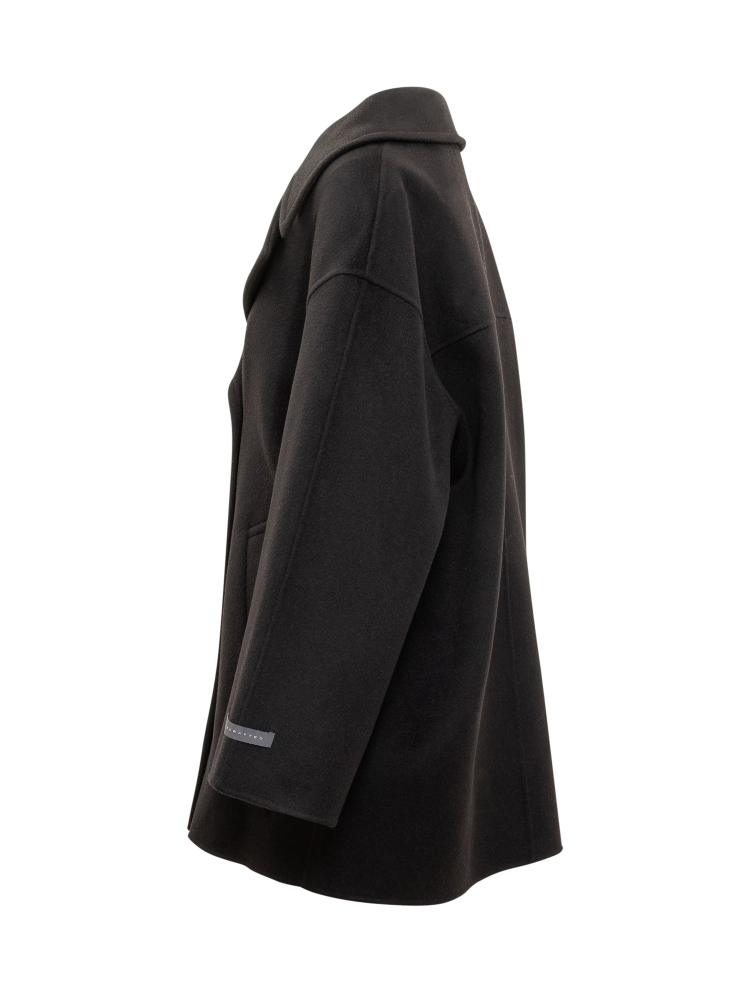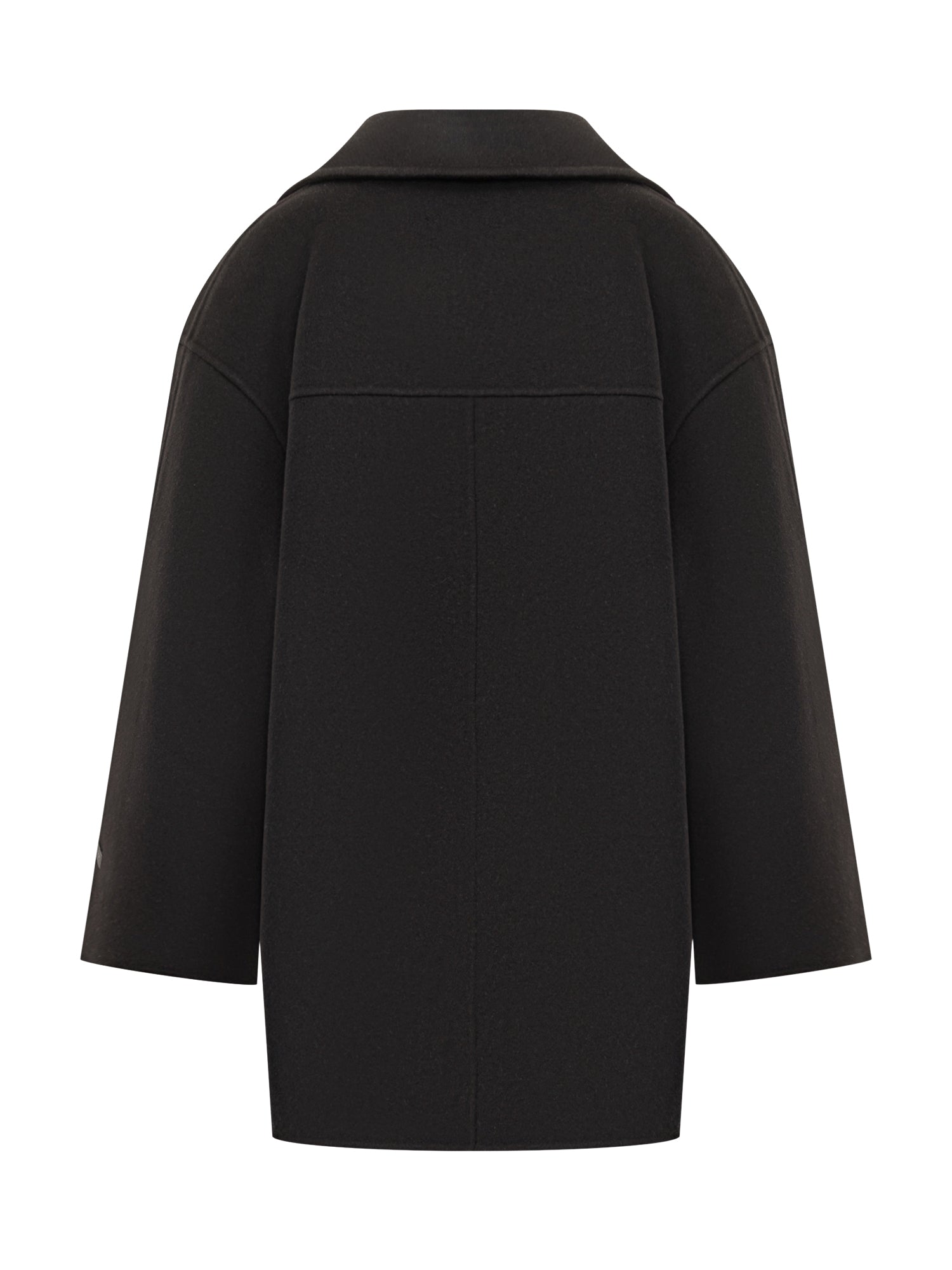Cappotto Duno doppiopetto oversize in lana nera, con ampi revers e chiusura a bottoni tono su tono.