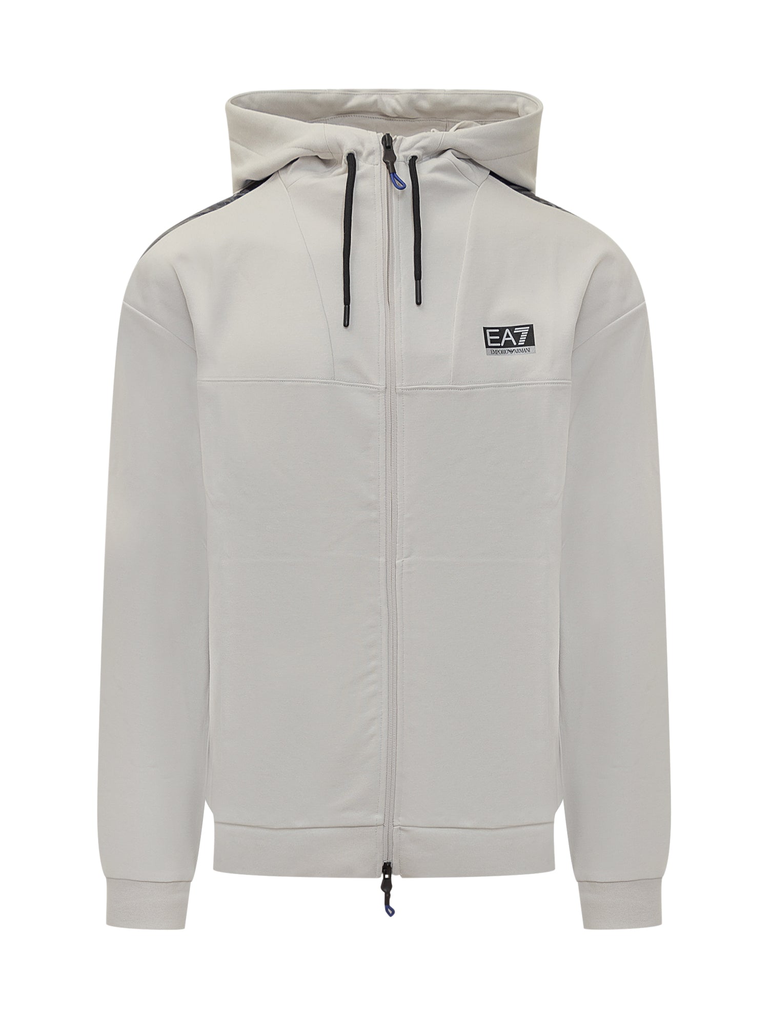 Felpa con cappuccio e coulisse. Chiusura con zip. Orli elasticizzati. Due tasche. Logo sul davanti.