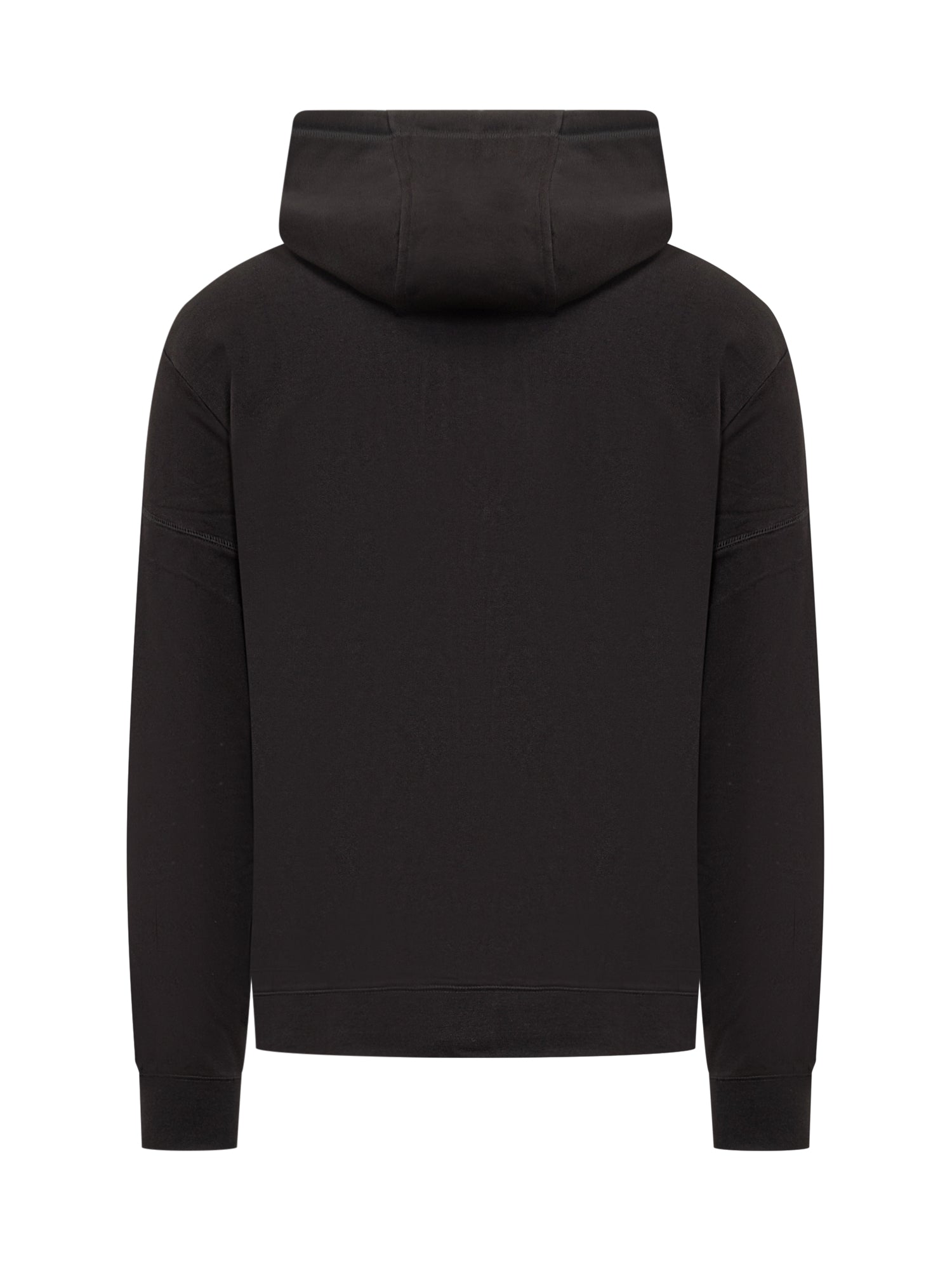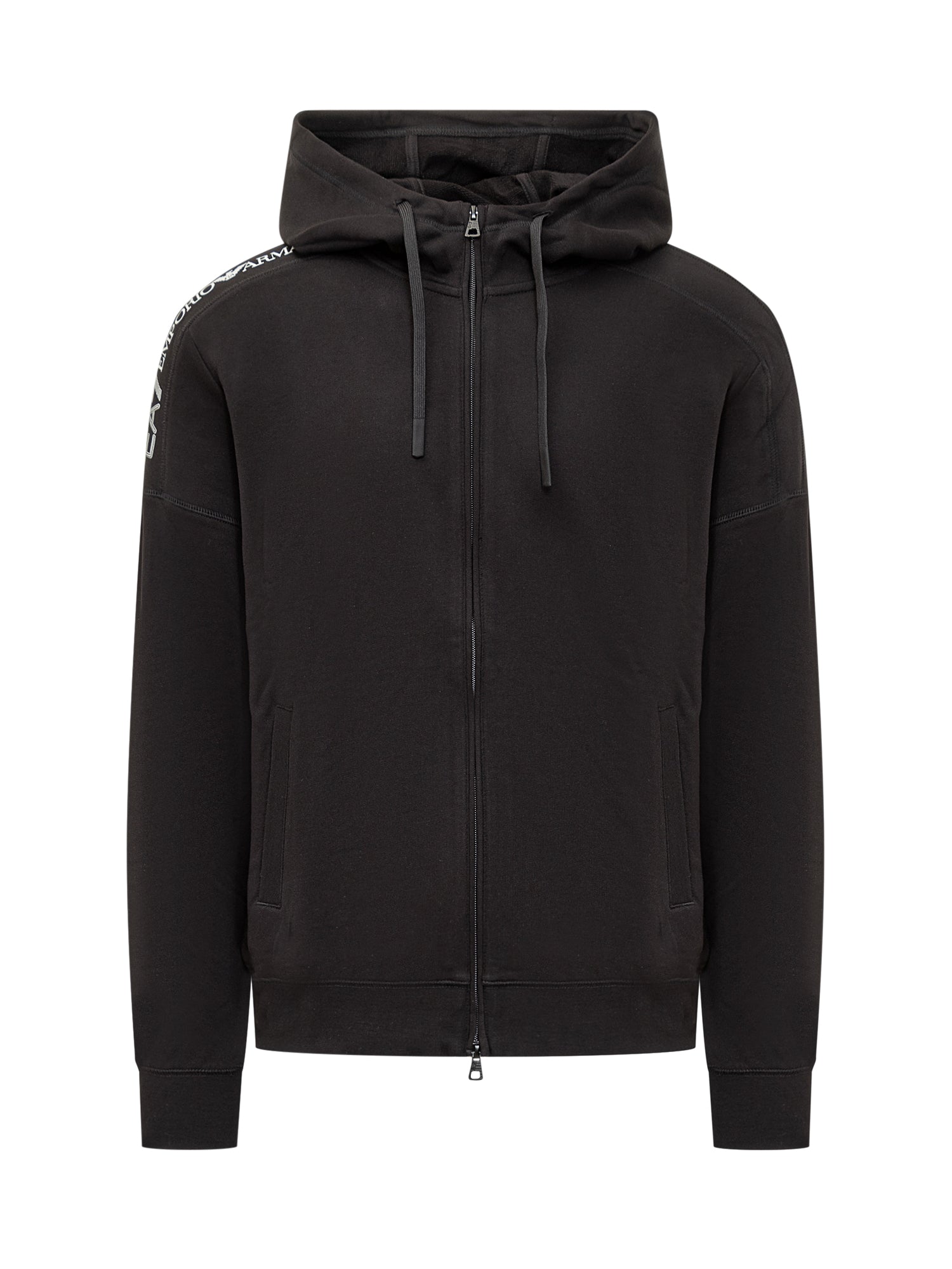 Felpa con cappuccio e coulisse. Chiusura con zip. Orli a costine. Due tasche.