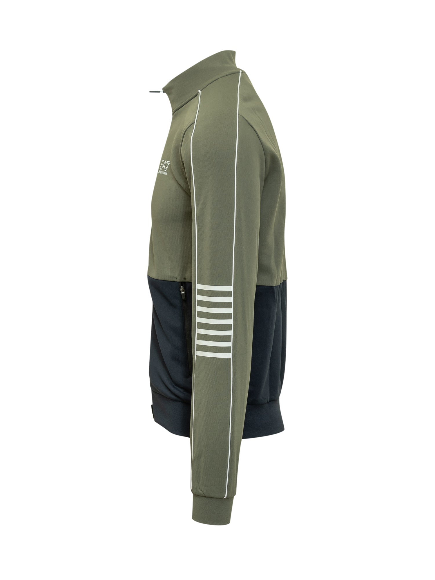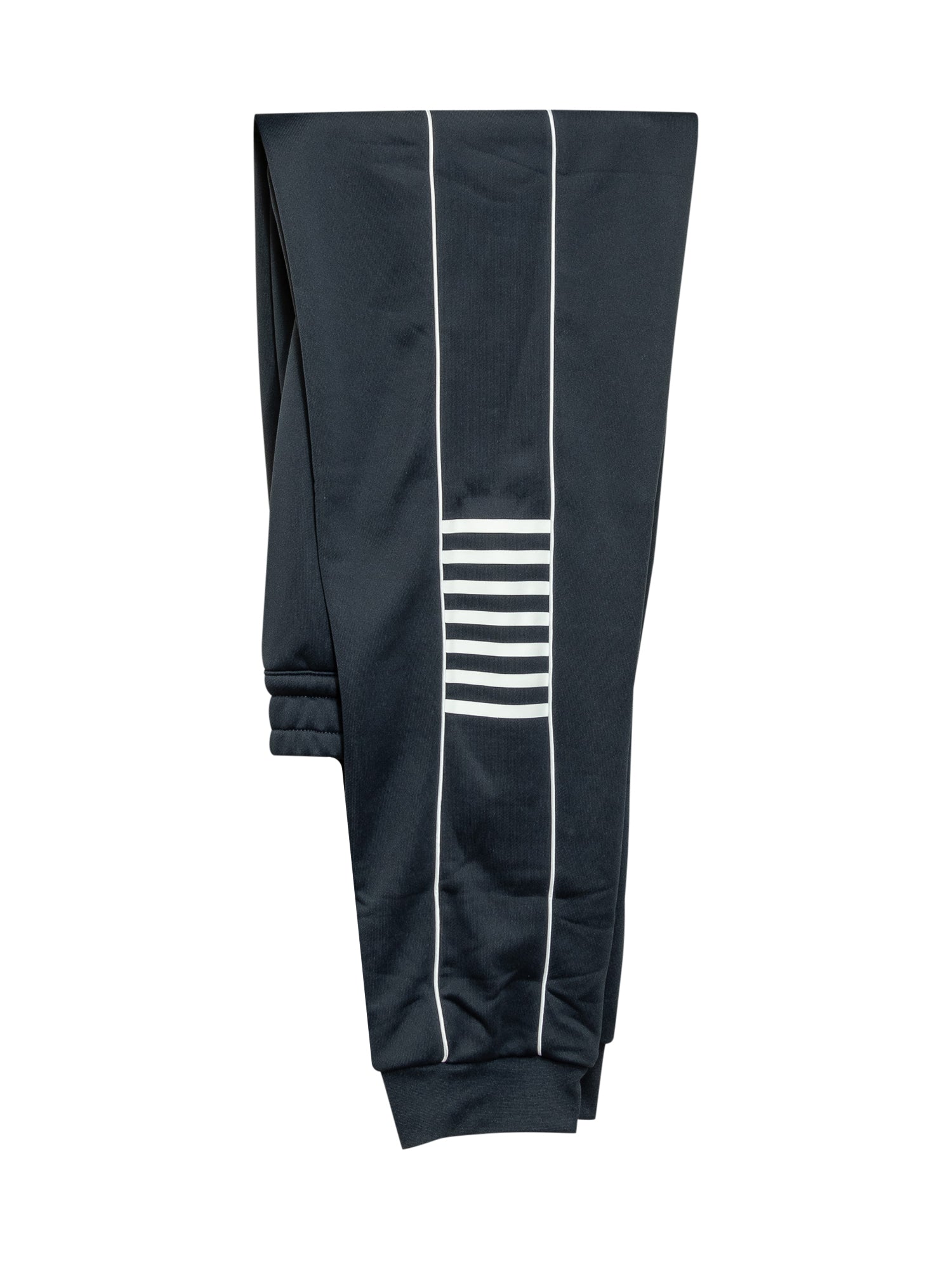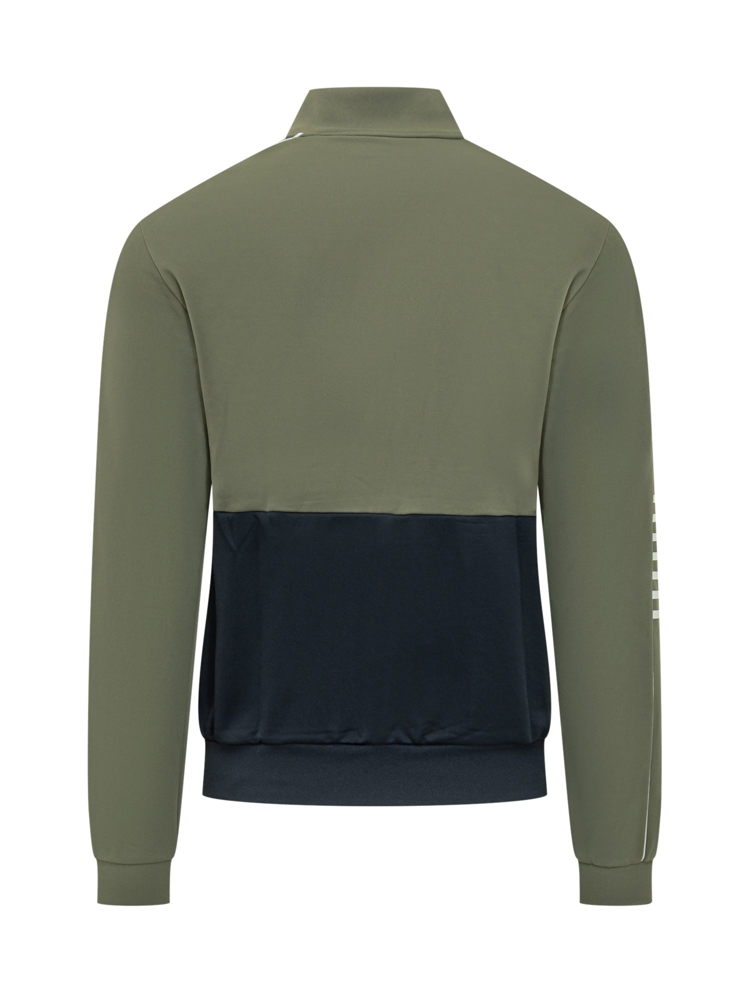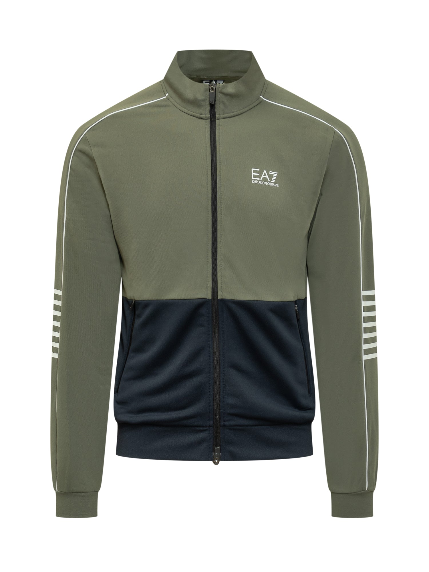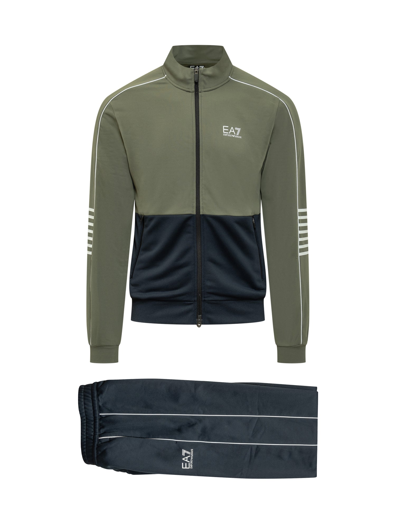 Completo tuta felpa e pantalone. Felpa con collo alto. Chiusura con zip. Felpa e pantalone con orli a costine. Due tasche. Logo sul davanti.