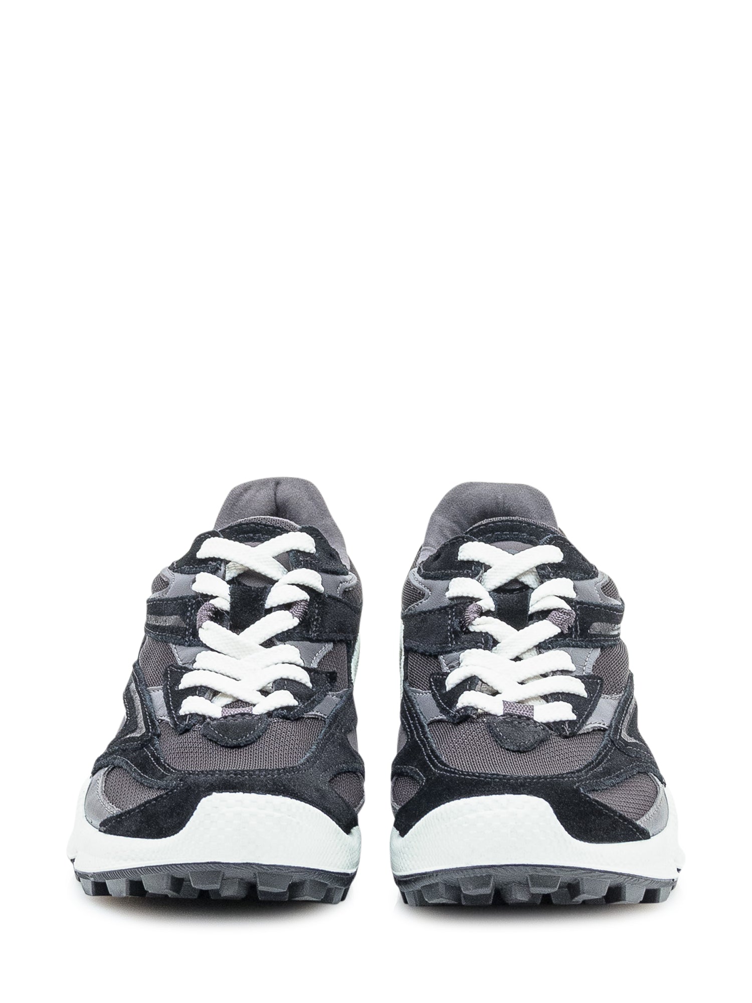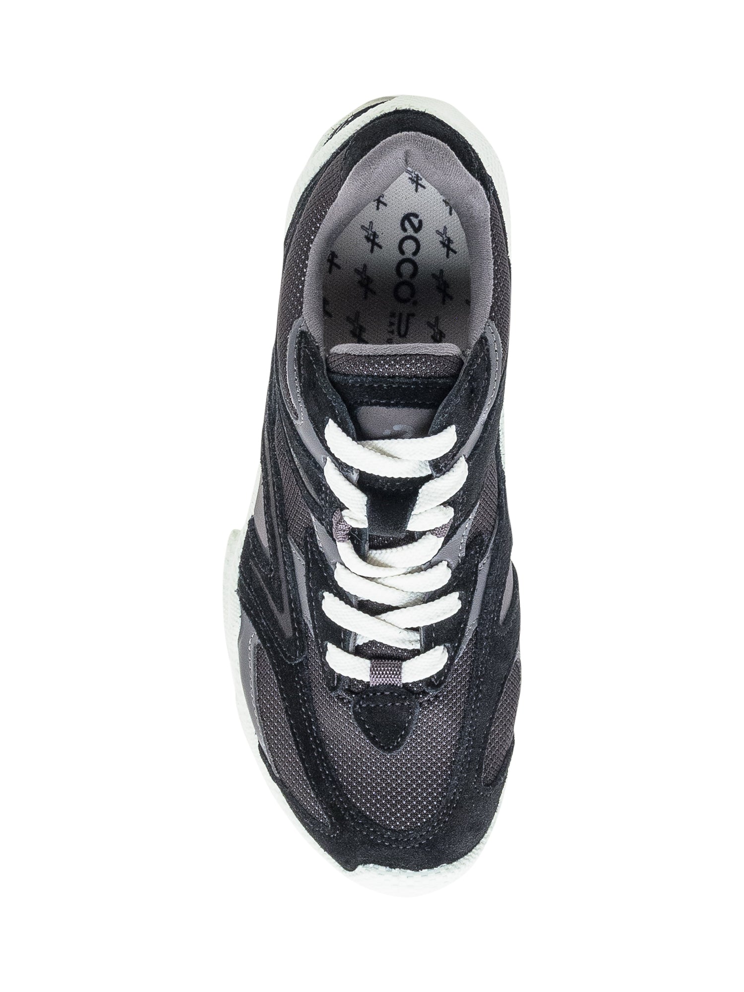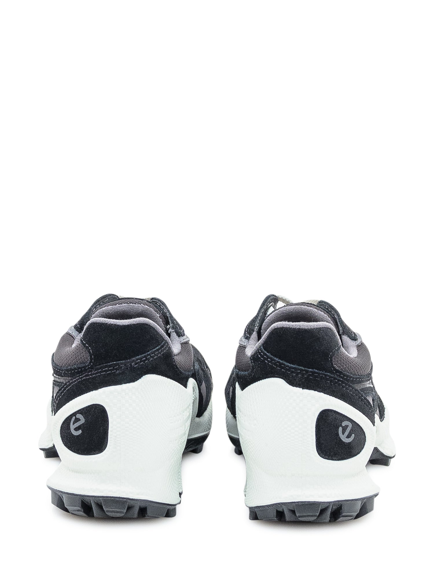 Sneakers Ecco Biom C-Trail in tessuto tecnico e pelle scamosciata nere e grigie. Suola robusta e design sportivo.