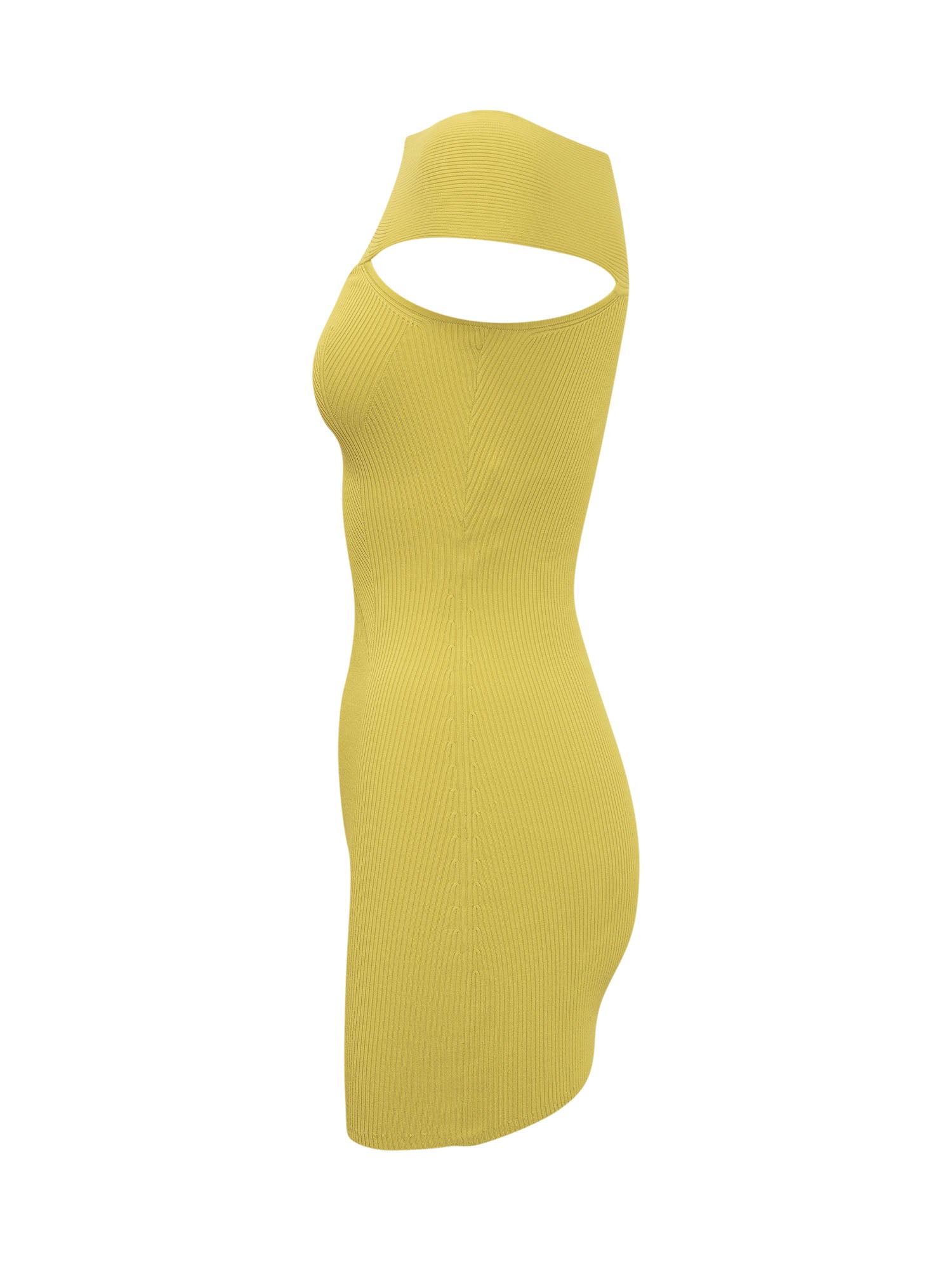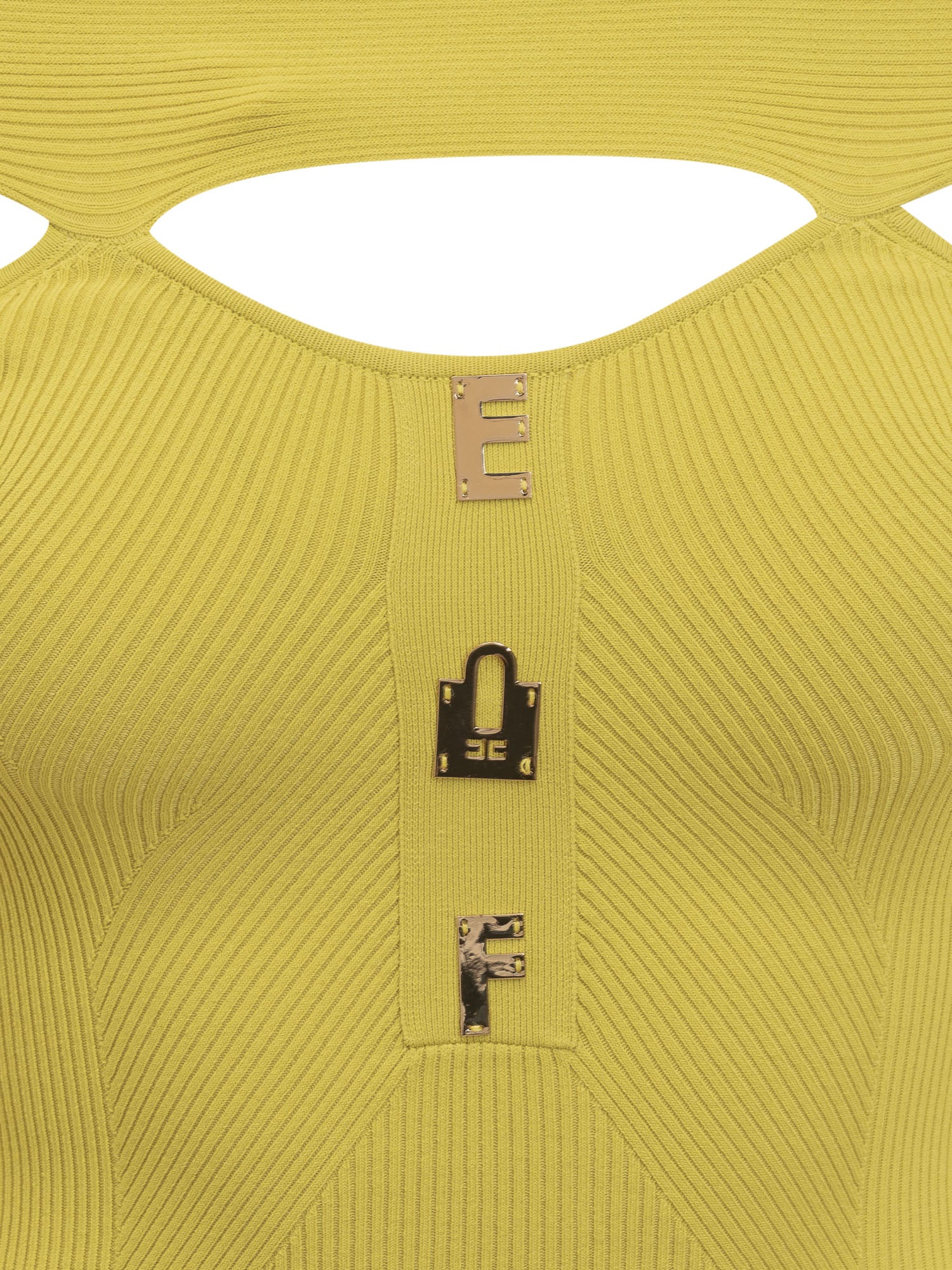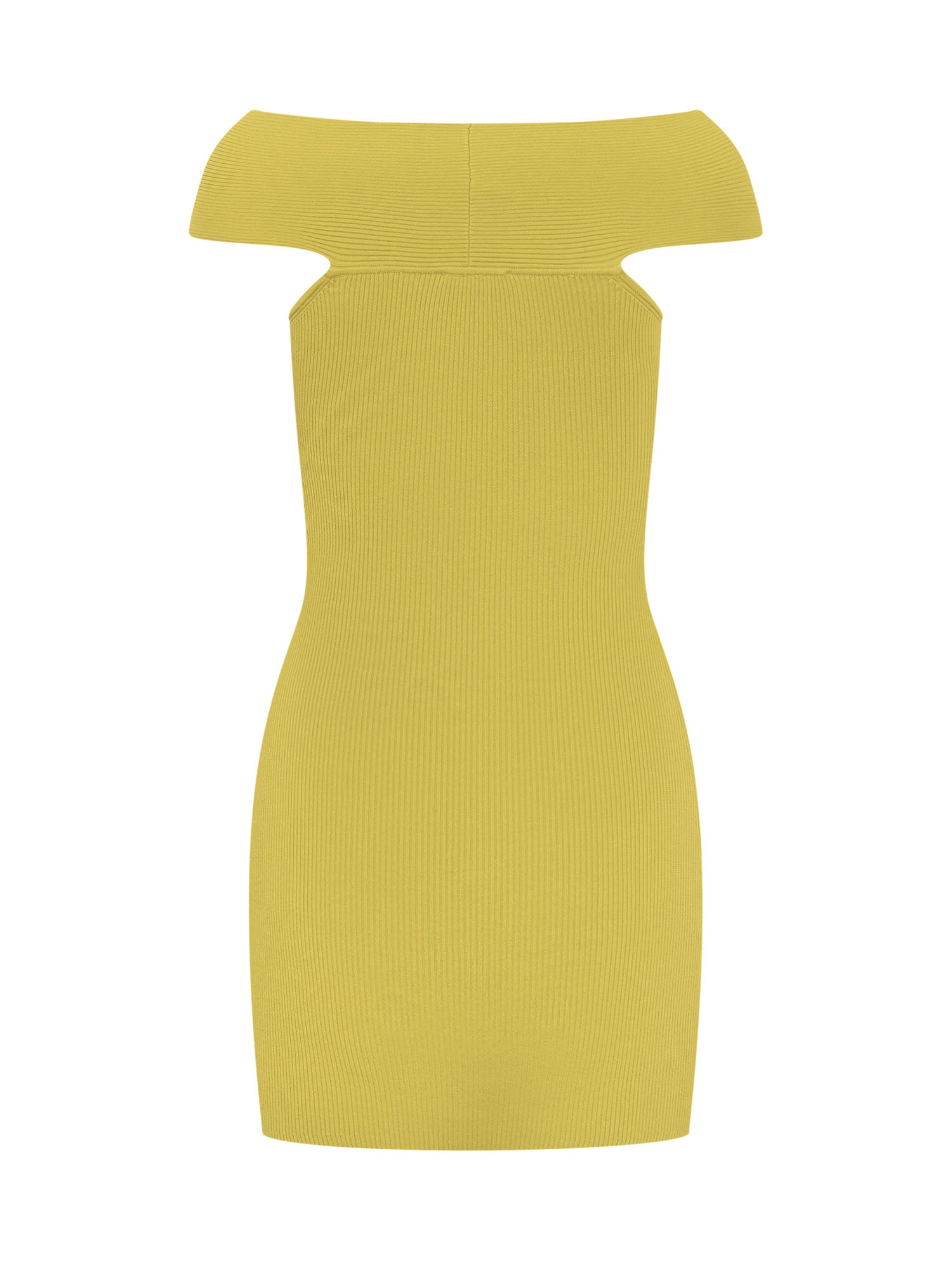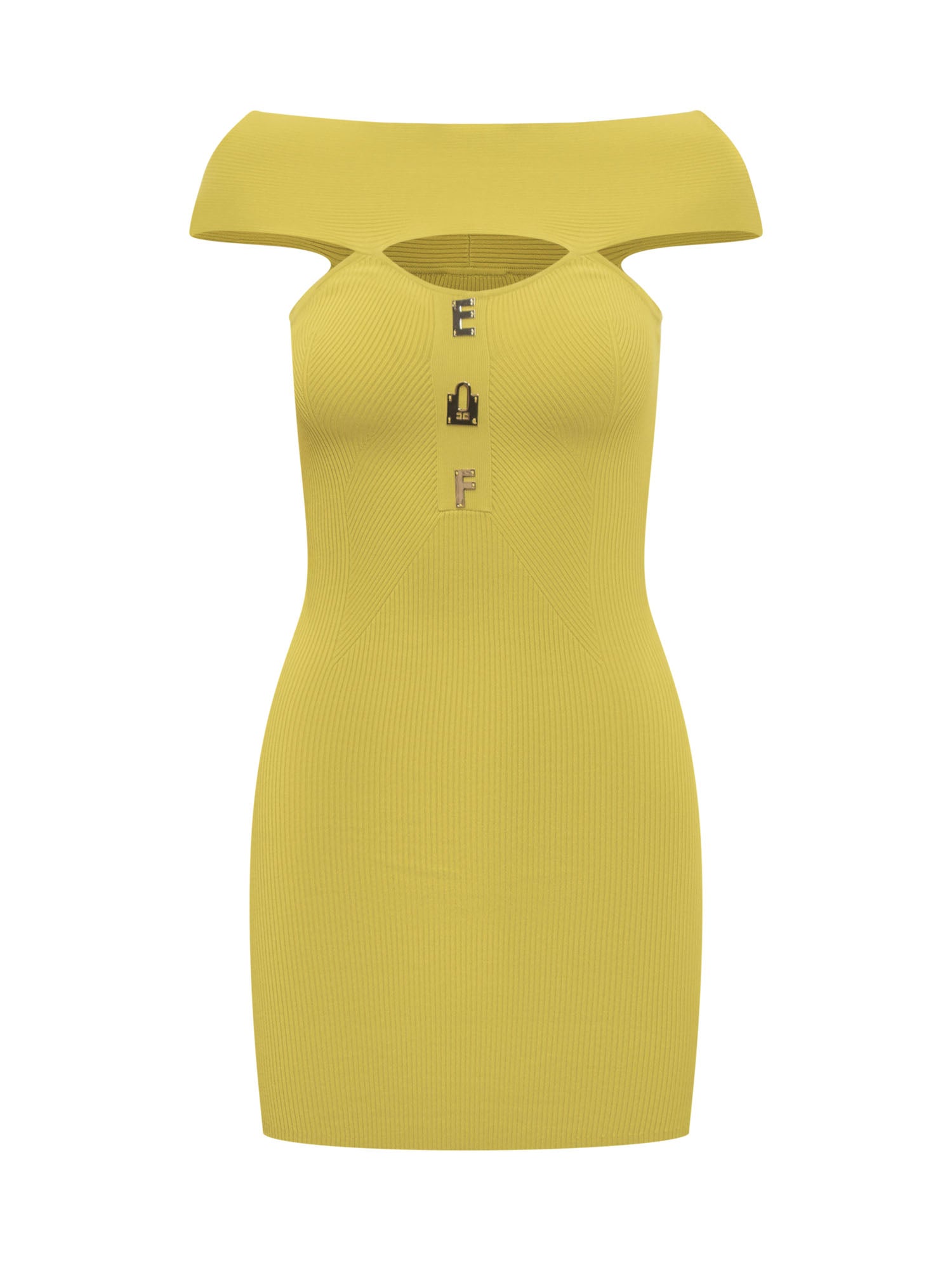 Abito mini in viscosa con lavorazione a costine. Scollo bardot a spalle scoperte. Applicazione di accessori lettering in metallo dorato sullo scollo.