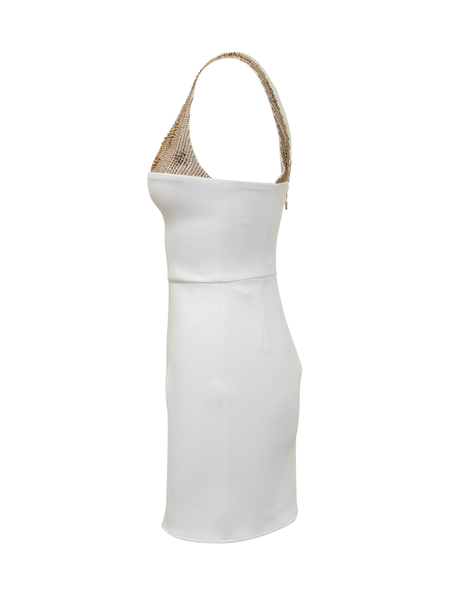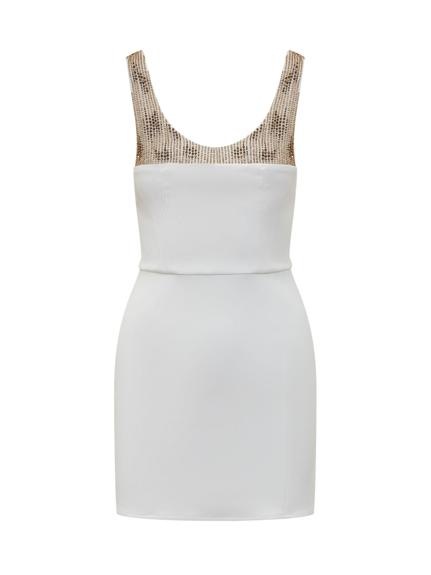 Abito mini smanicato in crêpe stretch. Scollo a U. Chiusura con zip sul retro. Spalline con strass. Linea aderente.