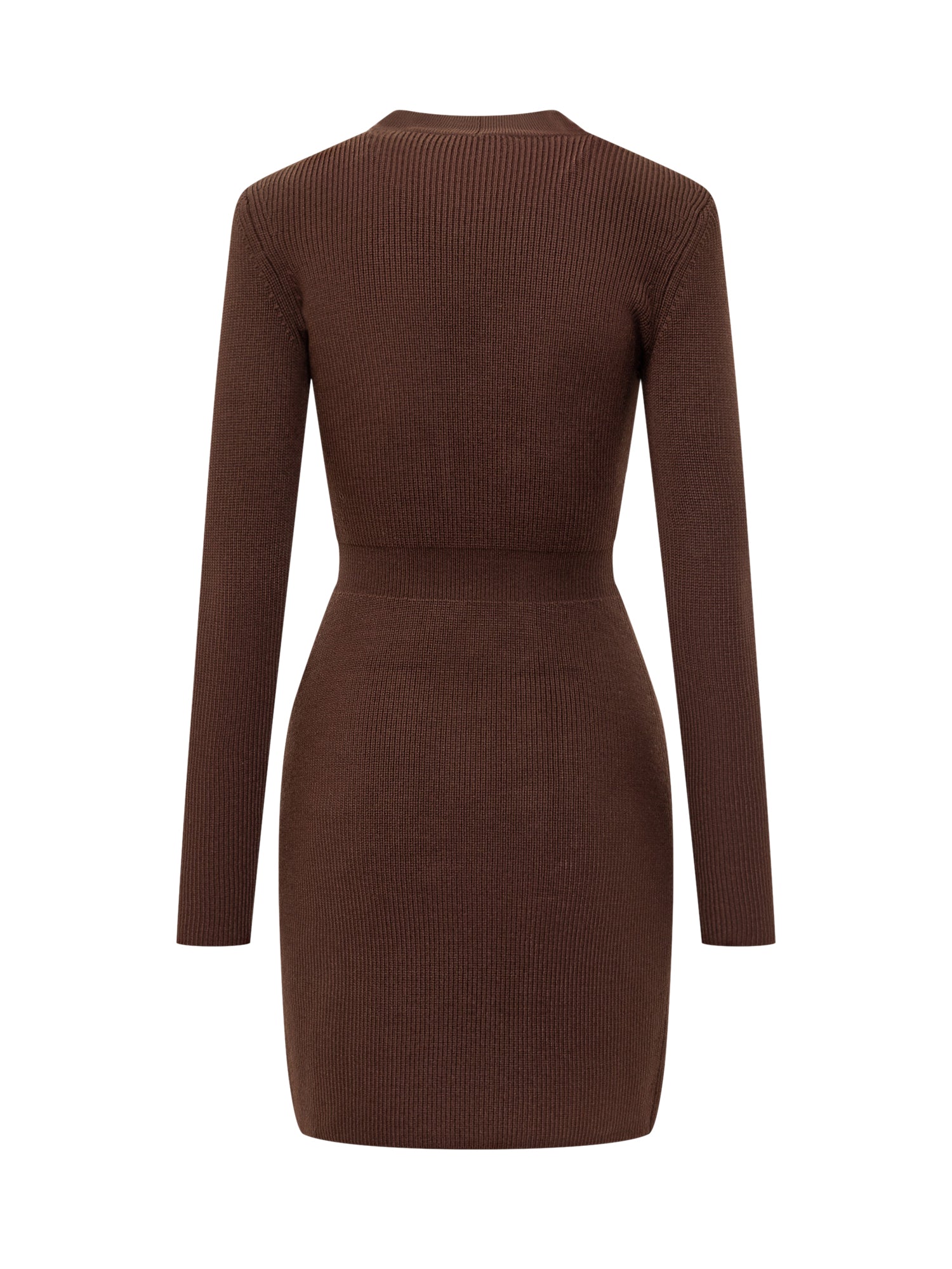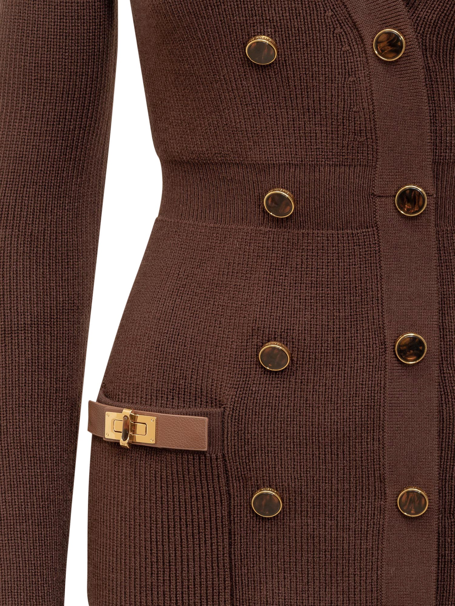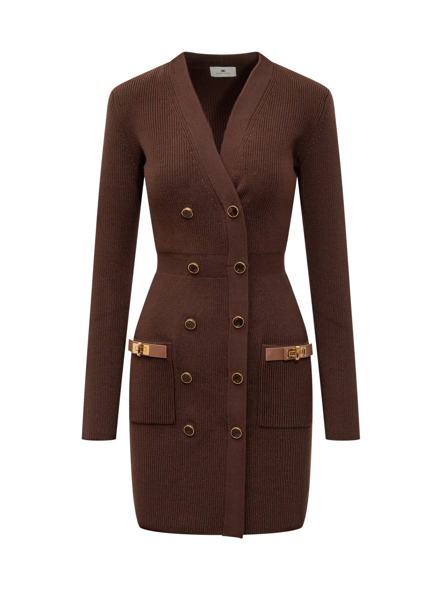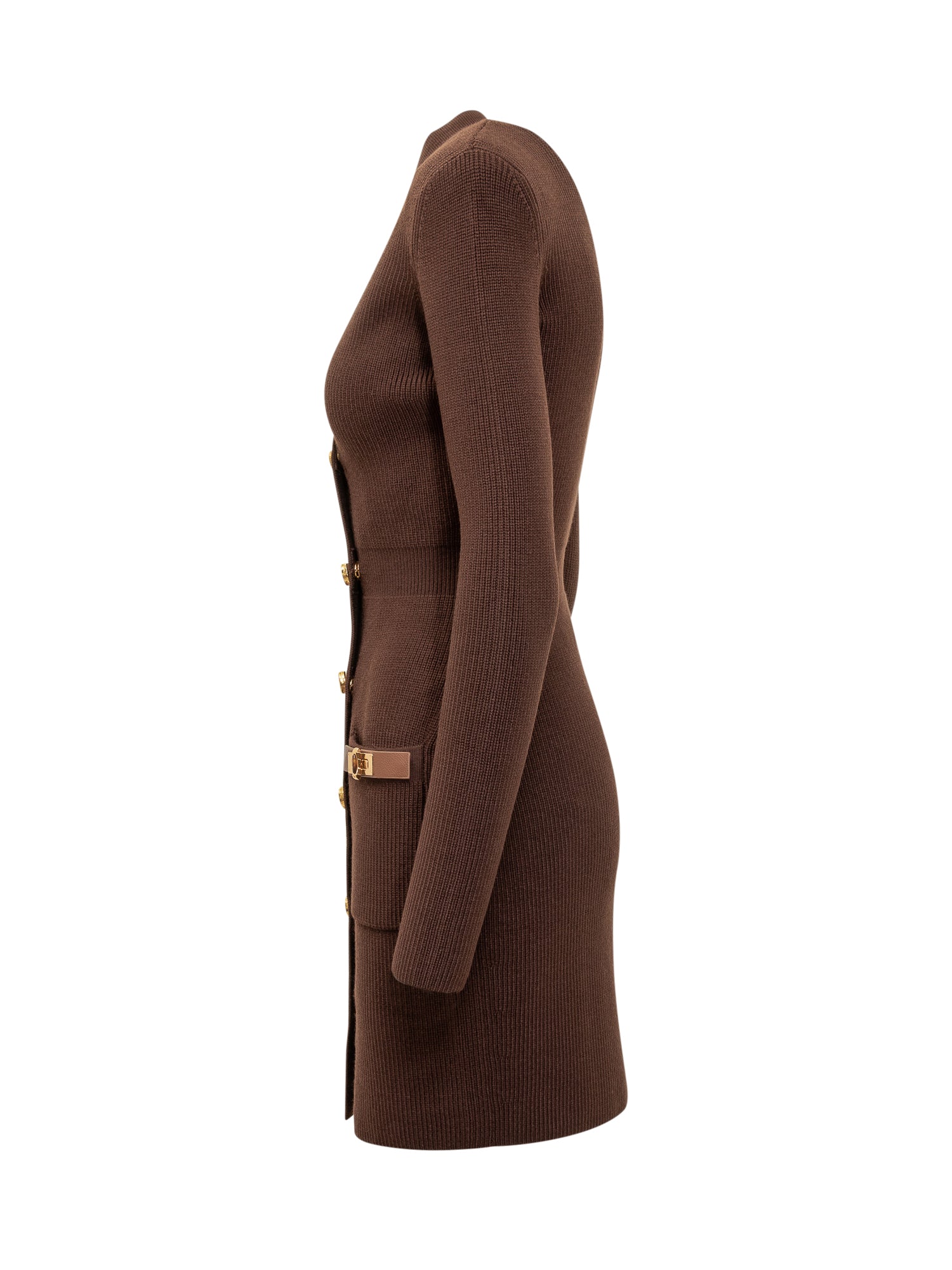 Abito corto Elisabetta Franchi in maglia marrone con bottoni dorati e cinturini decorativi.