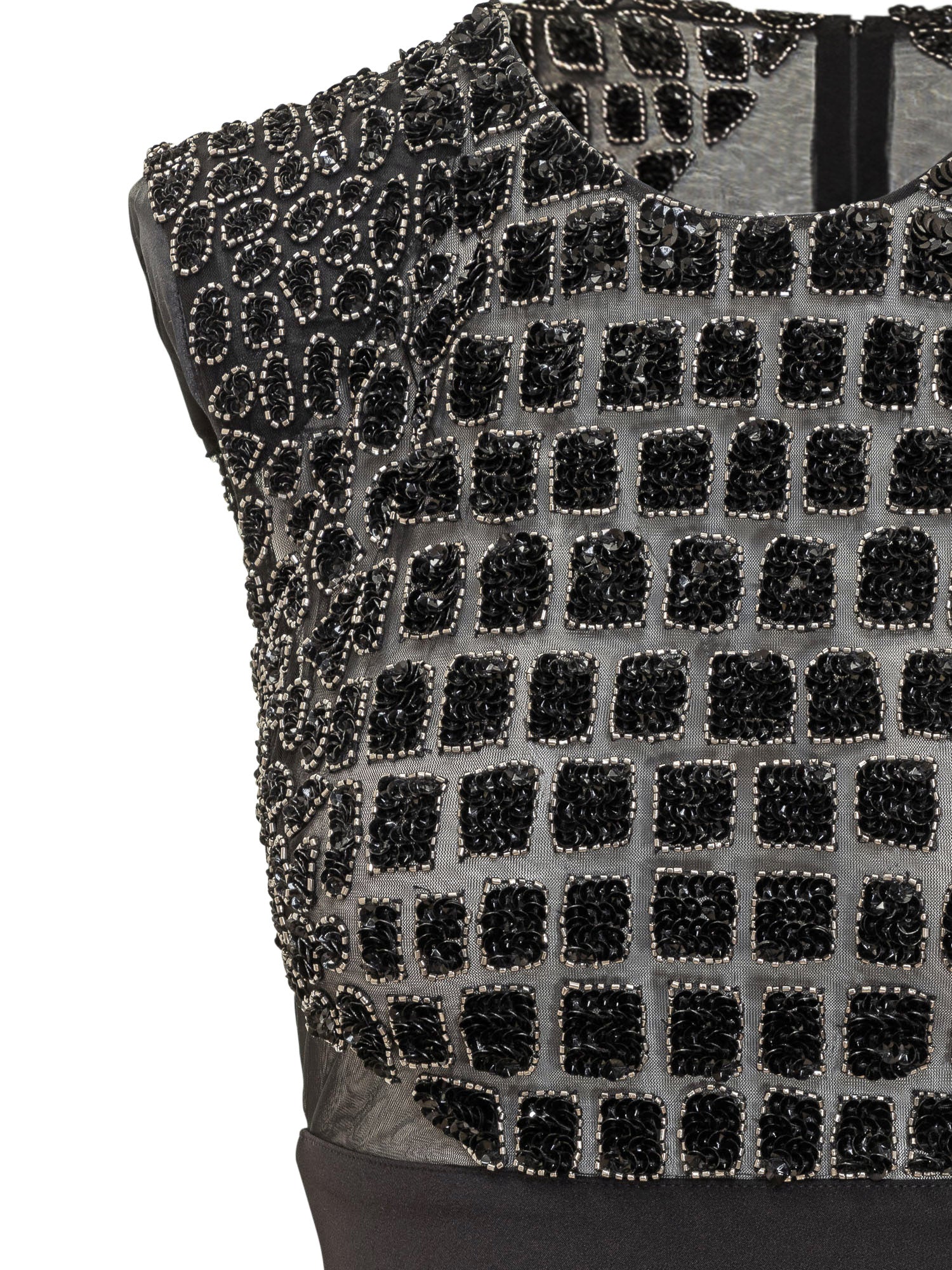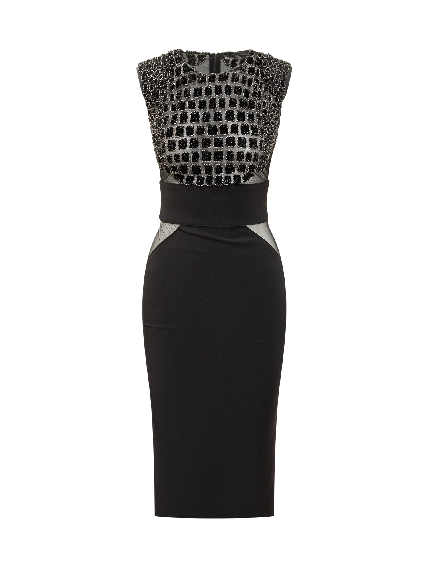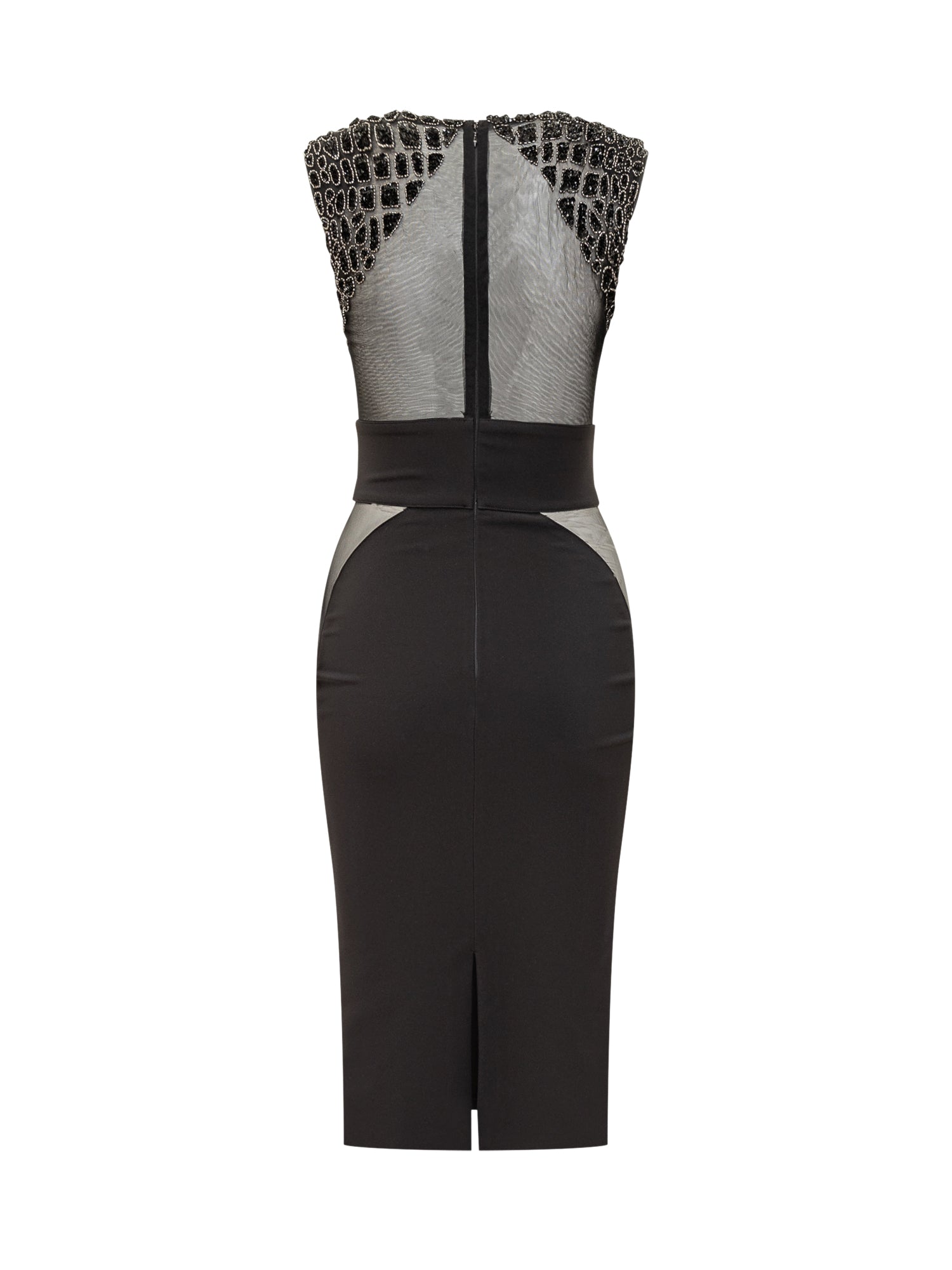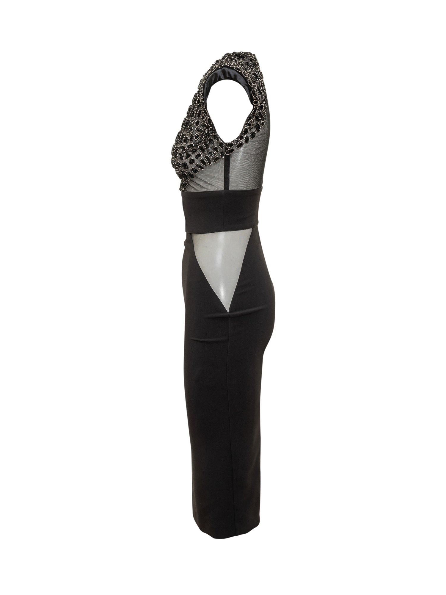 Abito midi nero con top ricamato effetto rete e dettagli gioiello, vita fasciata e inserti laterali trasparenti.