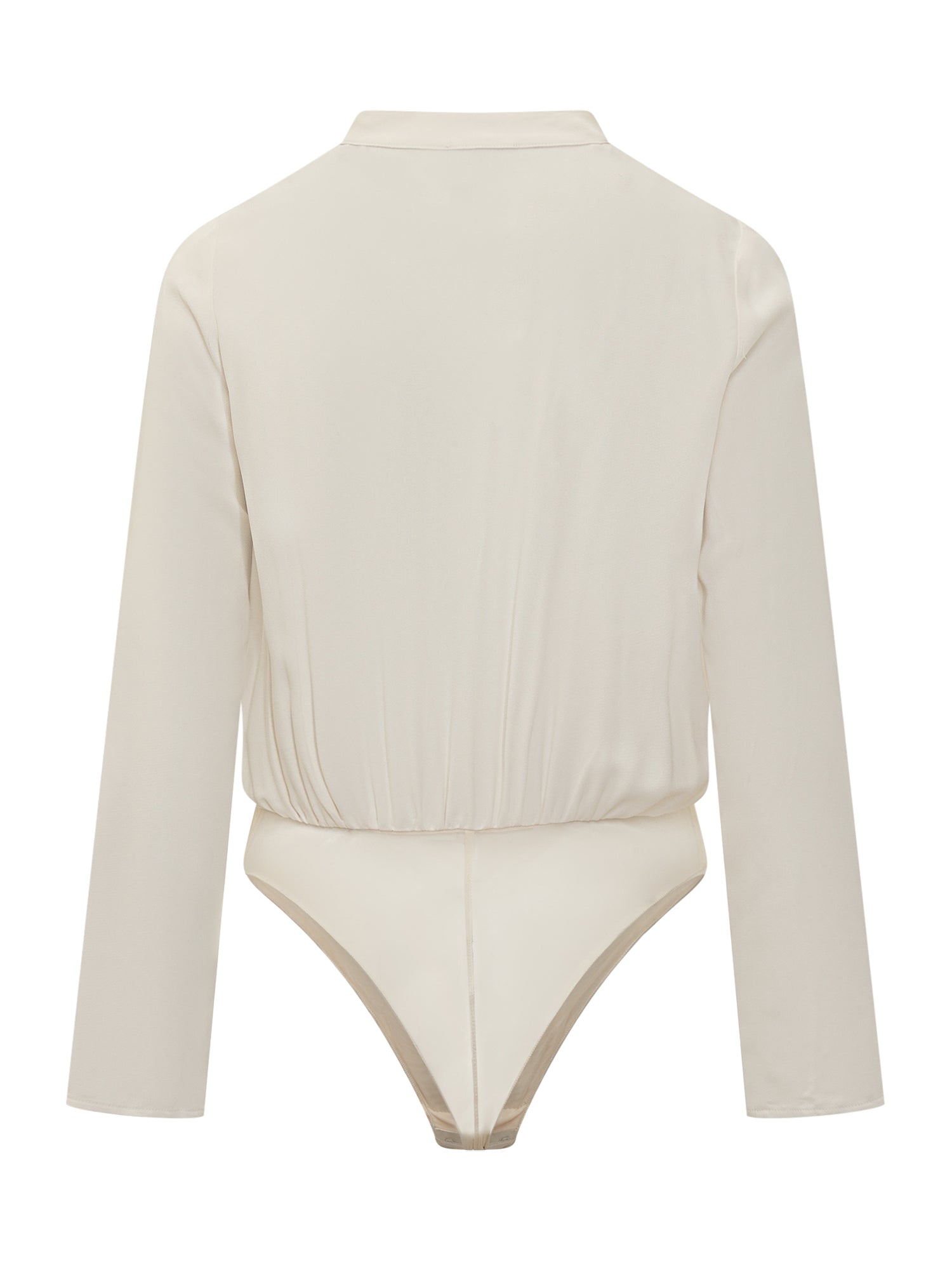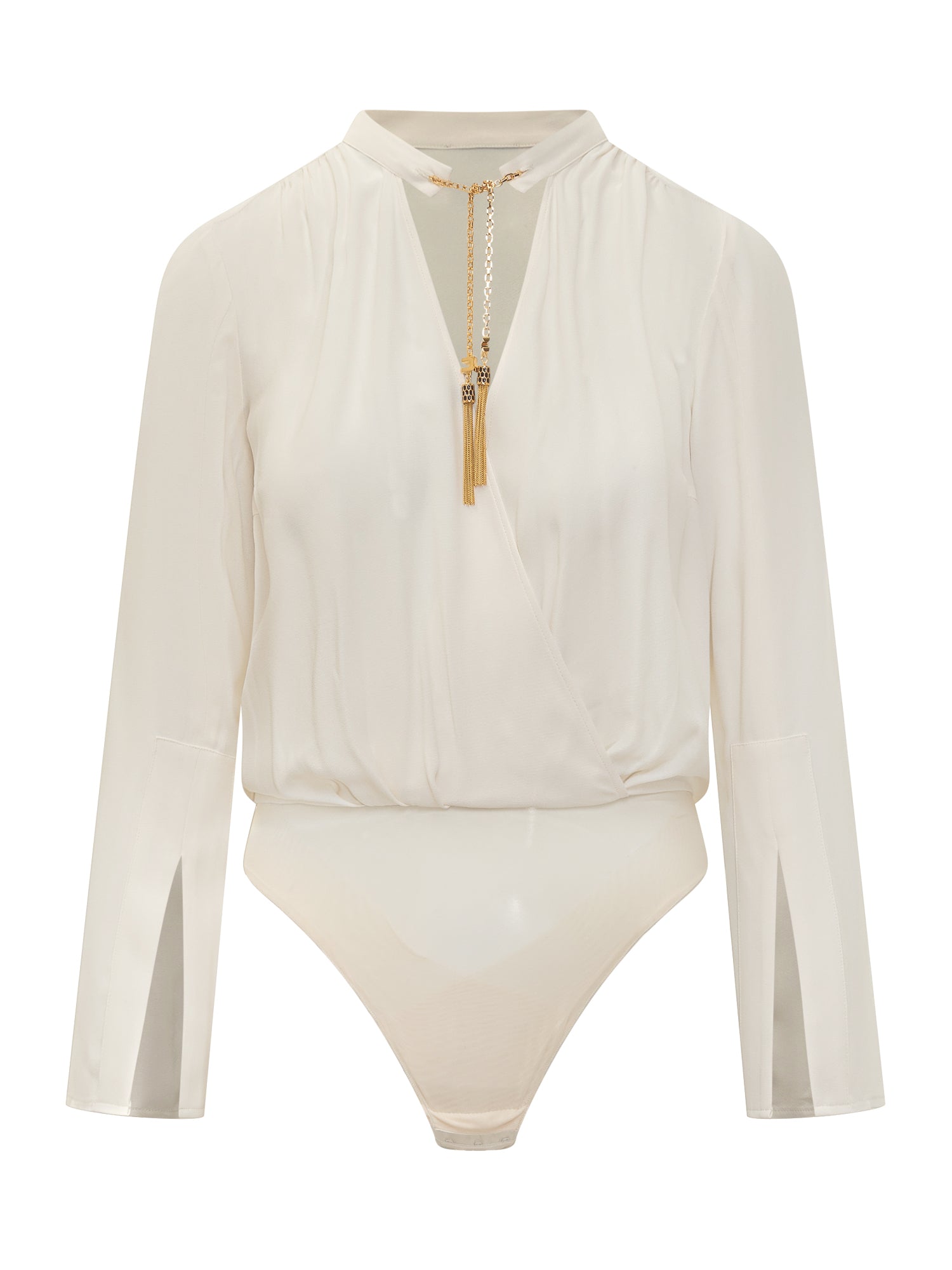 Body bianco con scollo a V incrociato, maniche lunghe e dettaglio catena dorata con logo.