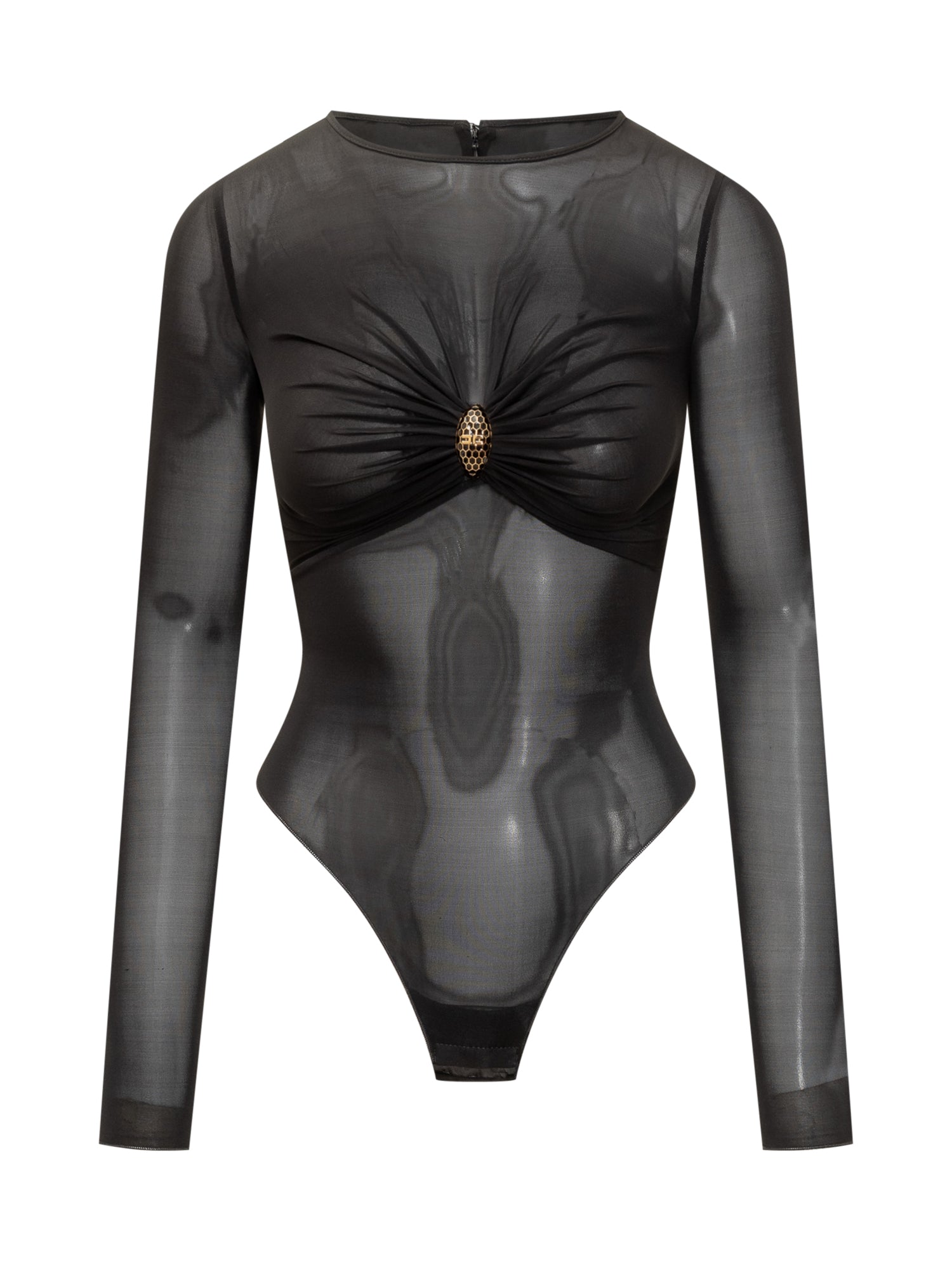Body nero a maniche lunghe in tulle trasparente, con drappeggio sul seno e dettaglio gioiello dorato.