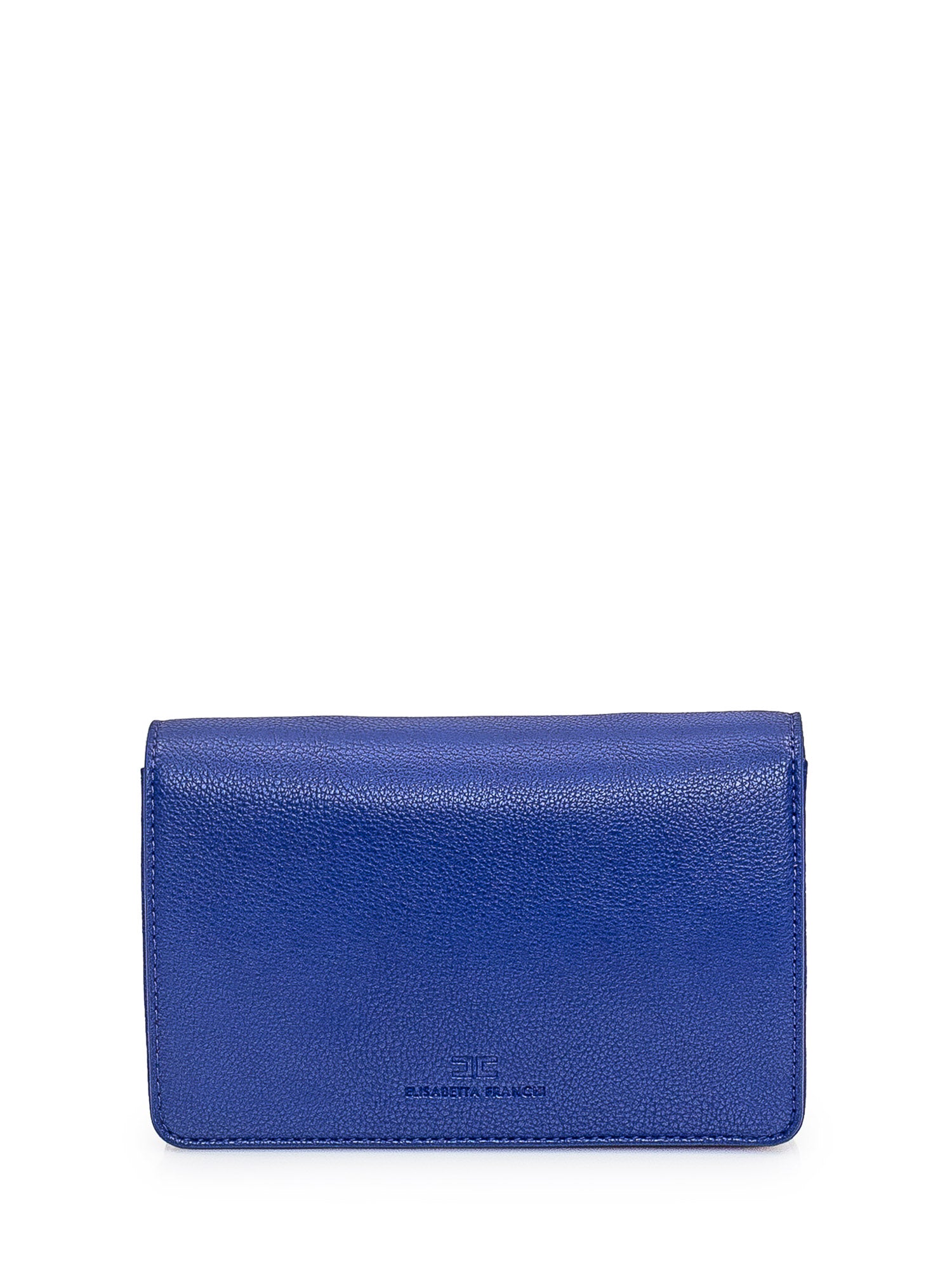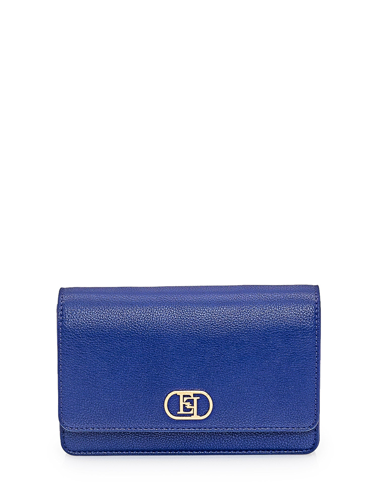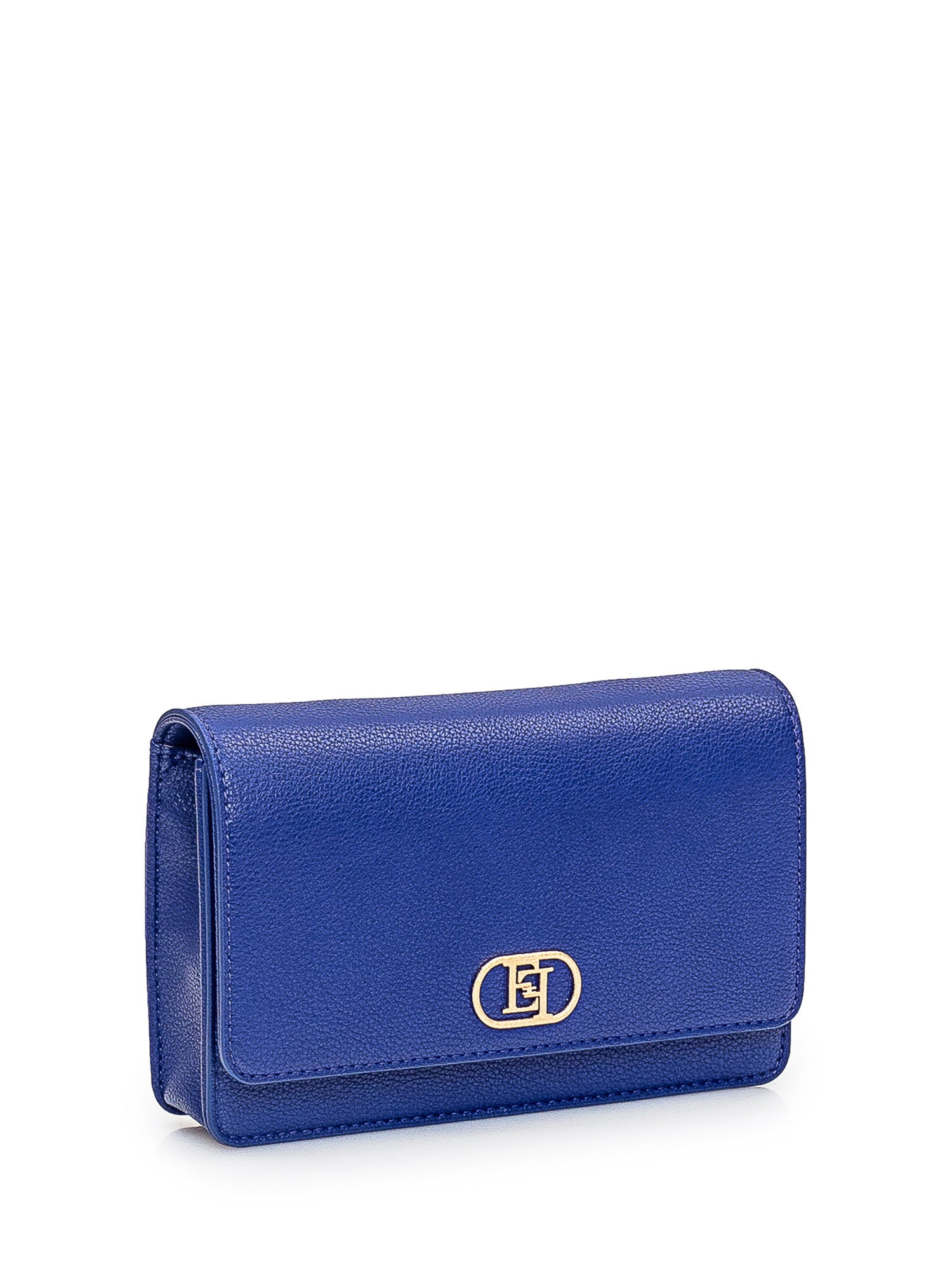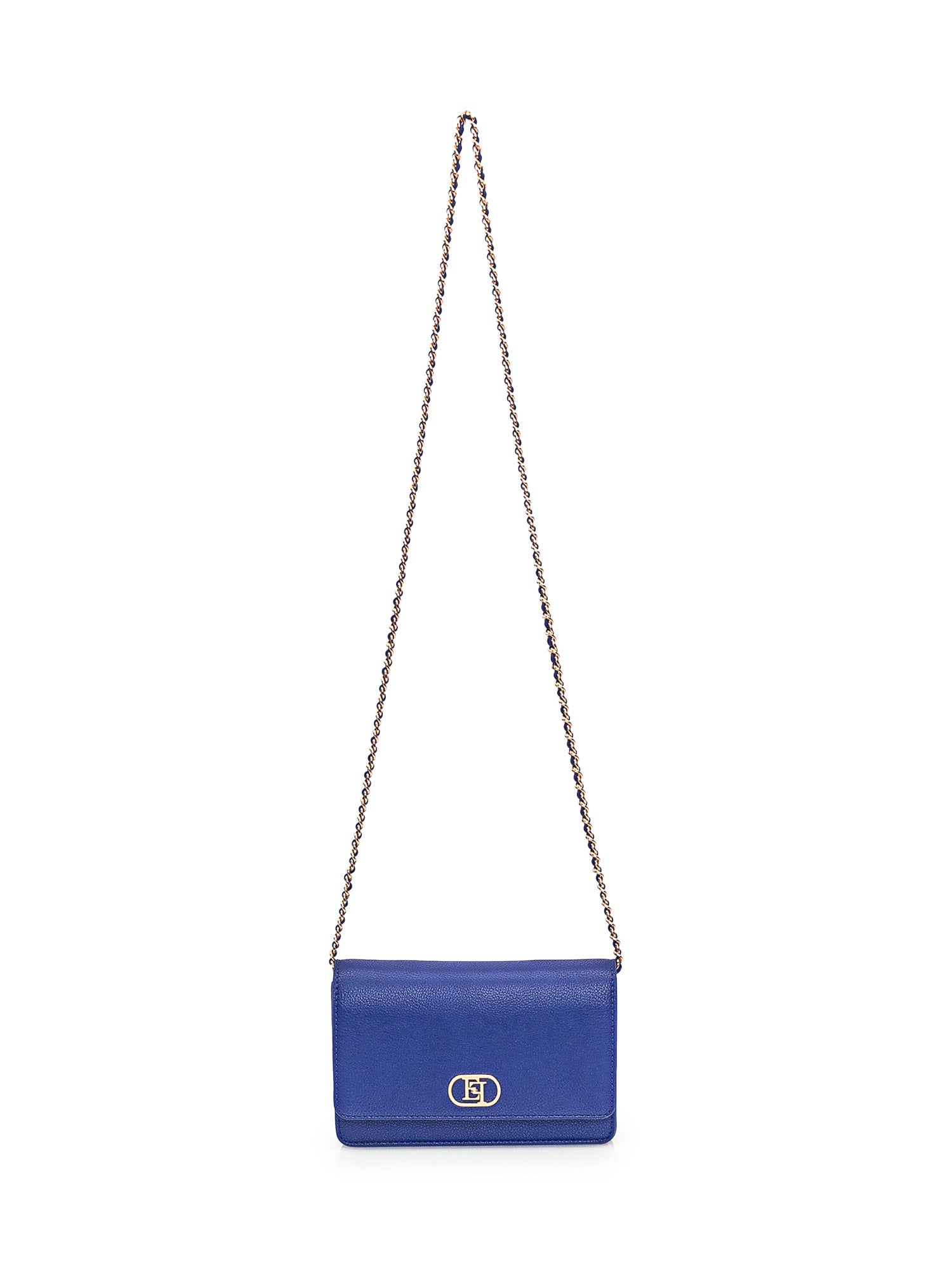 Borsa a tracolla blu in materiale sintetico effetto pelle. Tracolla a catena rimovibile. Scomparti interni per carte di credito e banconote. Tasca interna con zip. Chiusura con patta con bottone. Logo dorato sul davanti.