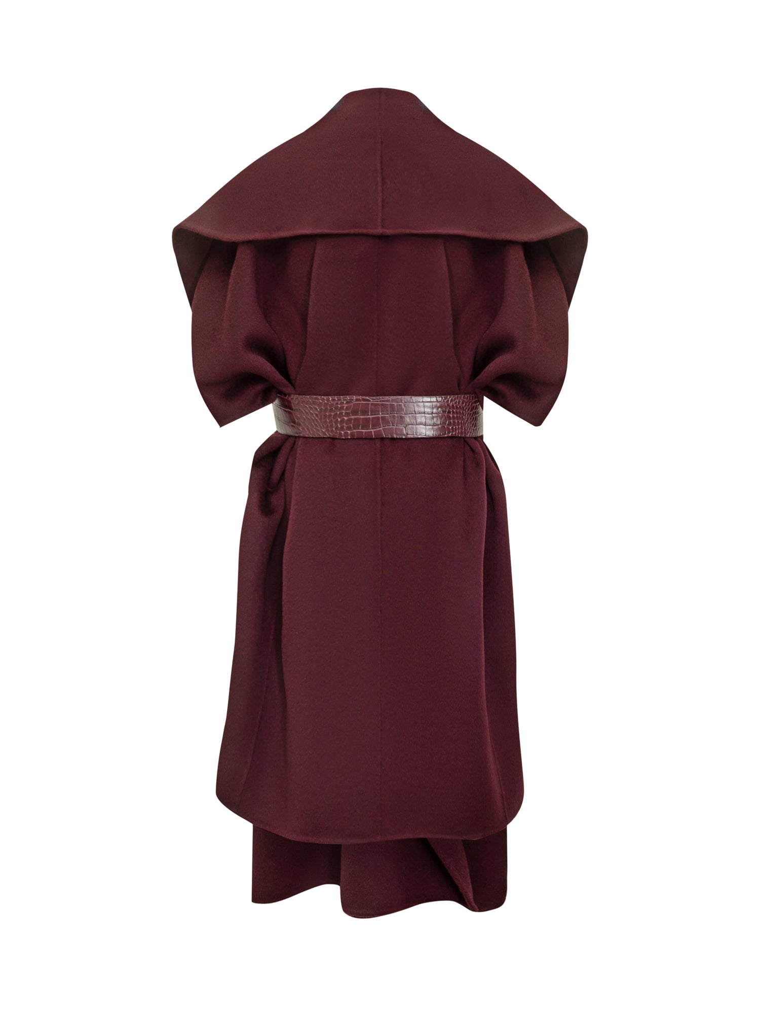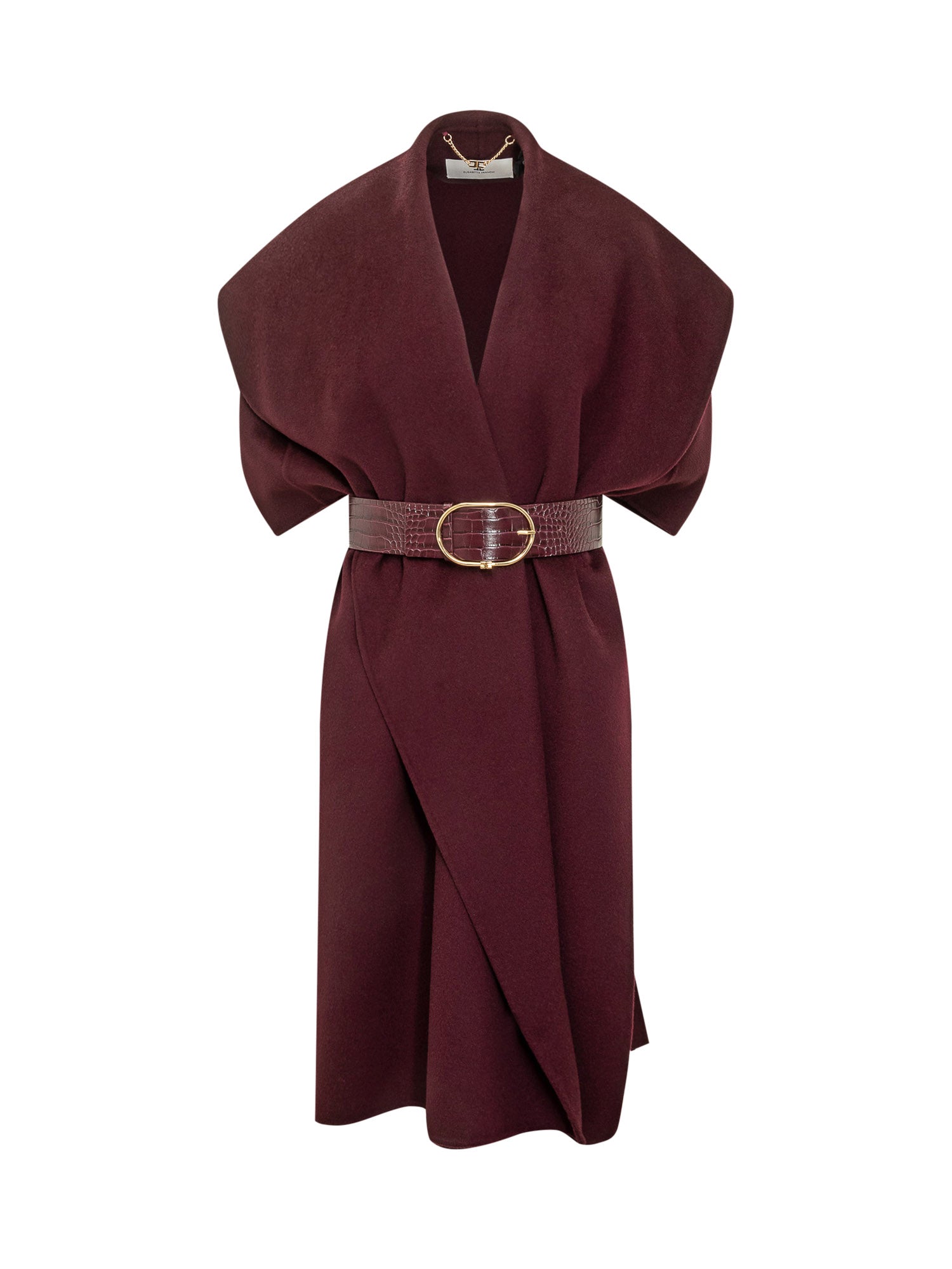 Cappotto lungo Elisabetta Franchi in tessuto bordeaux senza maniche, con cintura in ecopelle effetto coccodrillo e fibbia dorata.