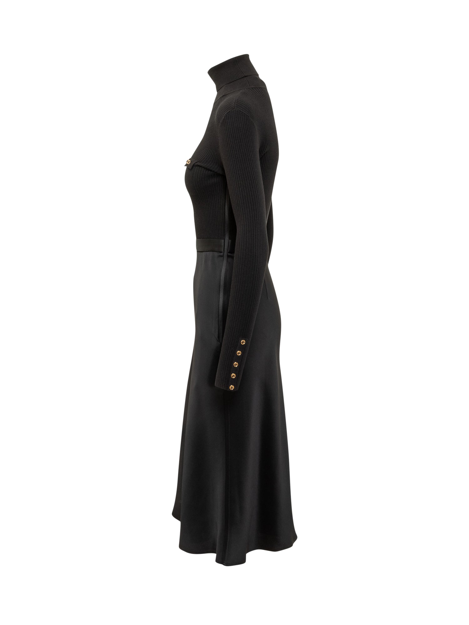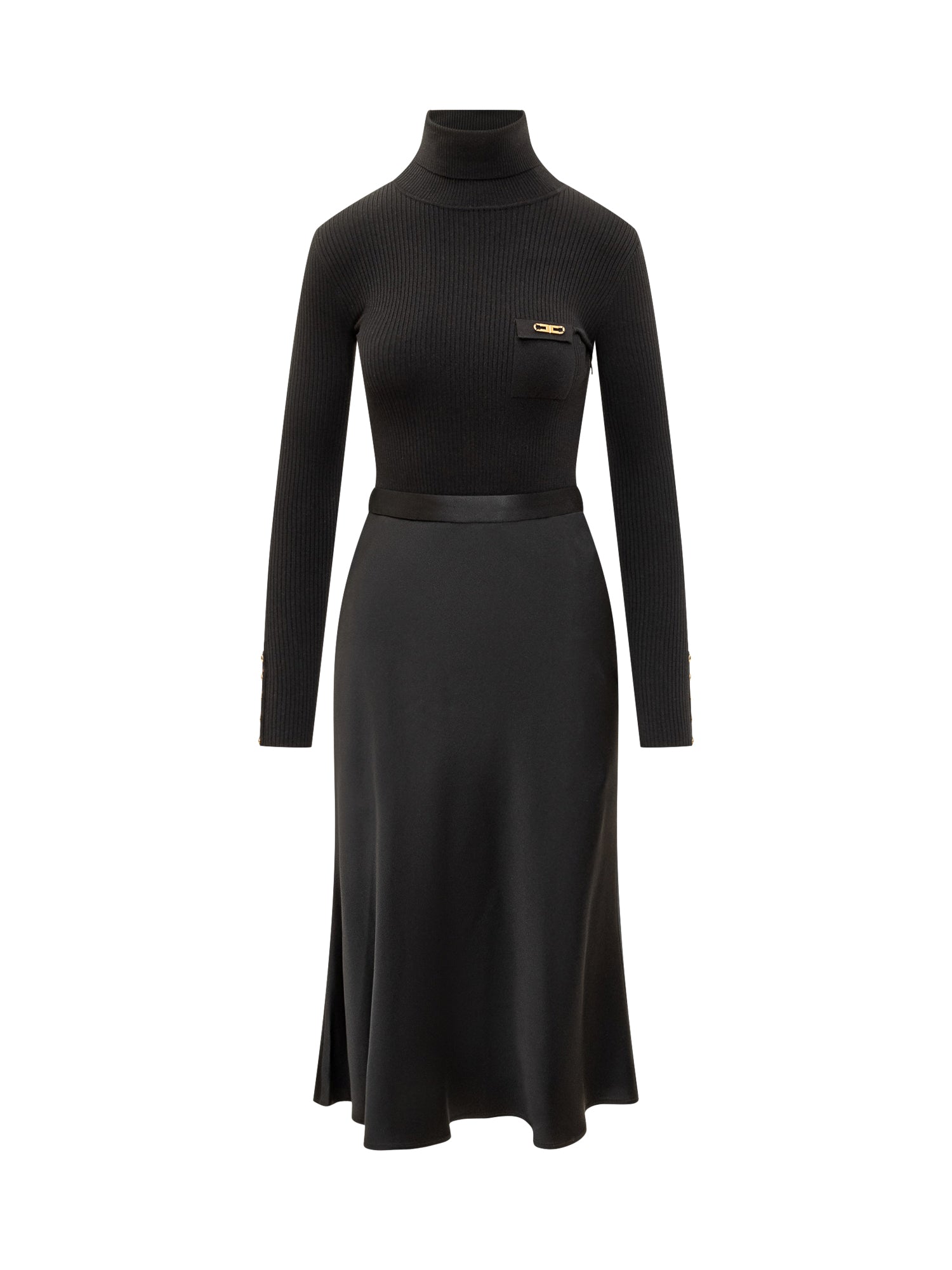 Abito Elisabetta Franchi in maglia nera con collo alto, taschino frontale con dettaglio dorato e cintura in vita.