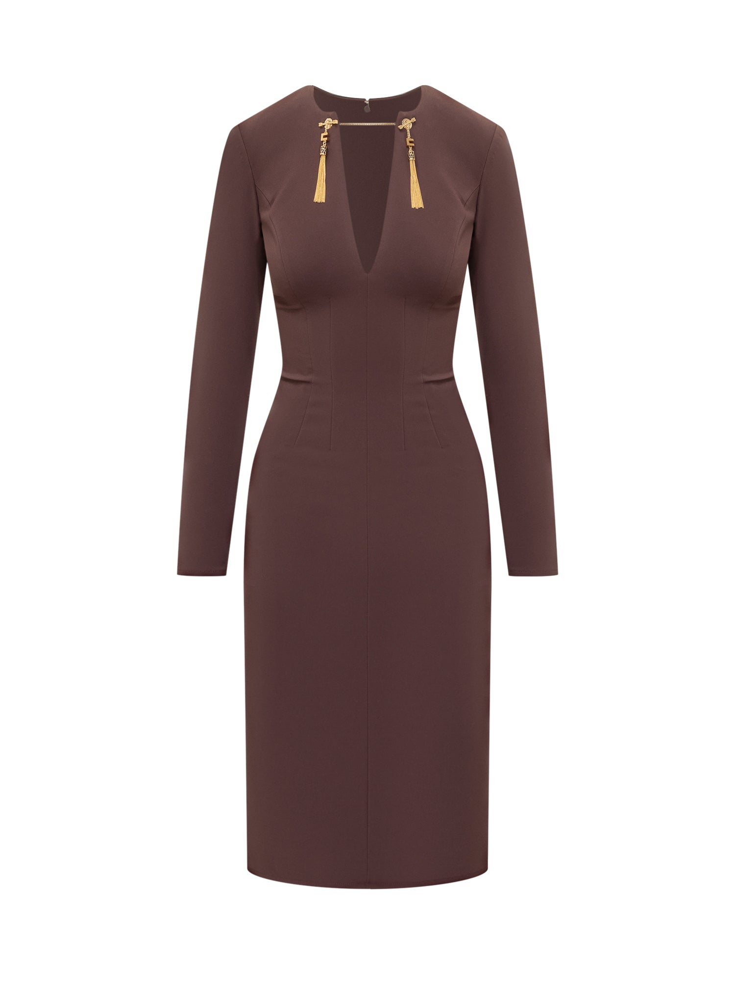Abito marrone Elisabetta Franchi a maniche lunghe con scollo profondo impreziosito da dettagli gioiello dorati.