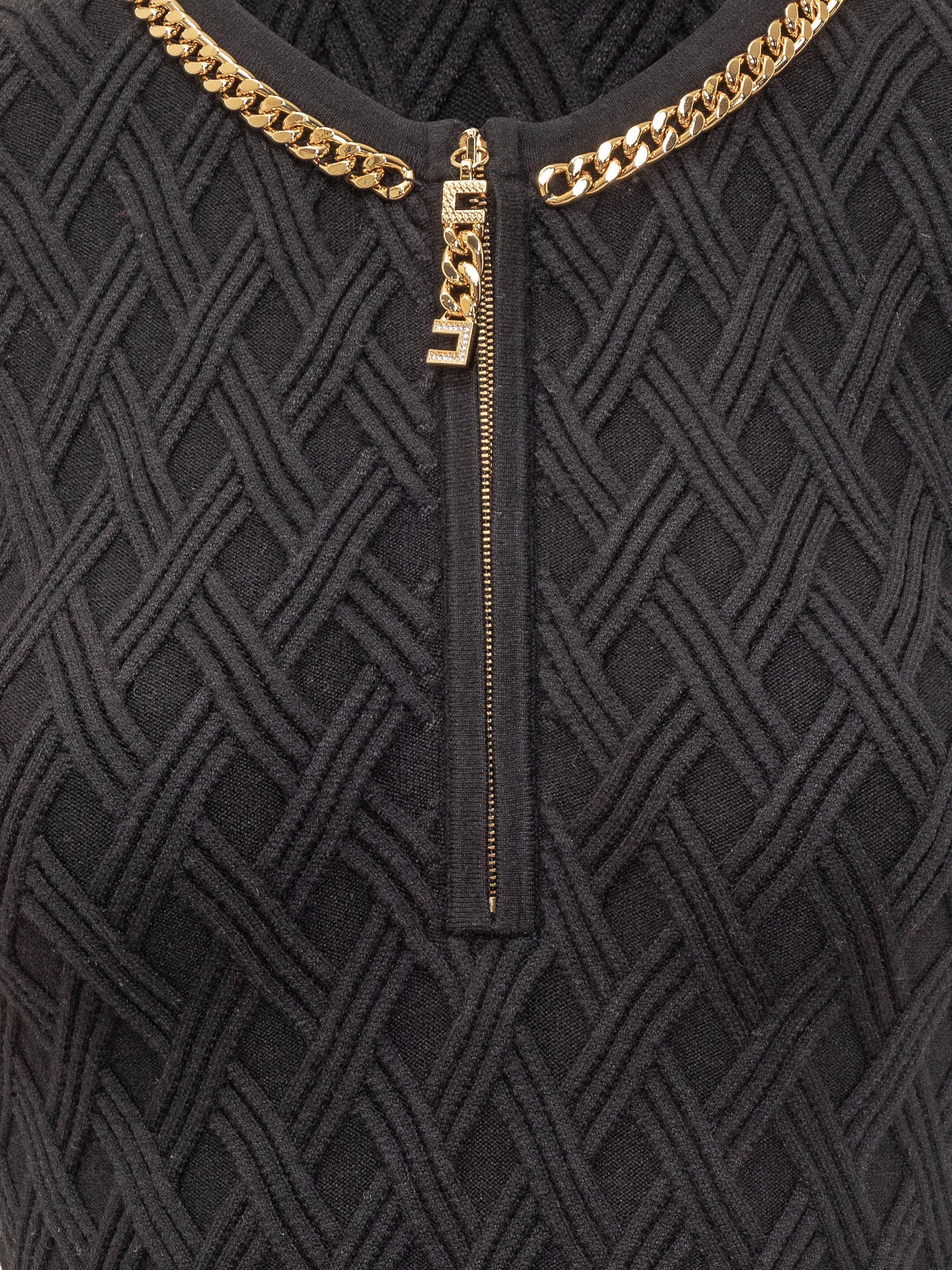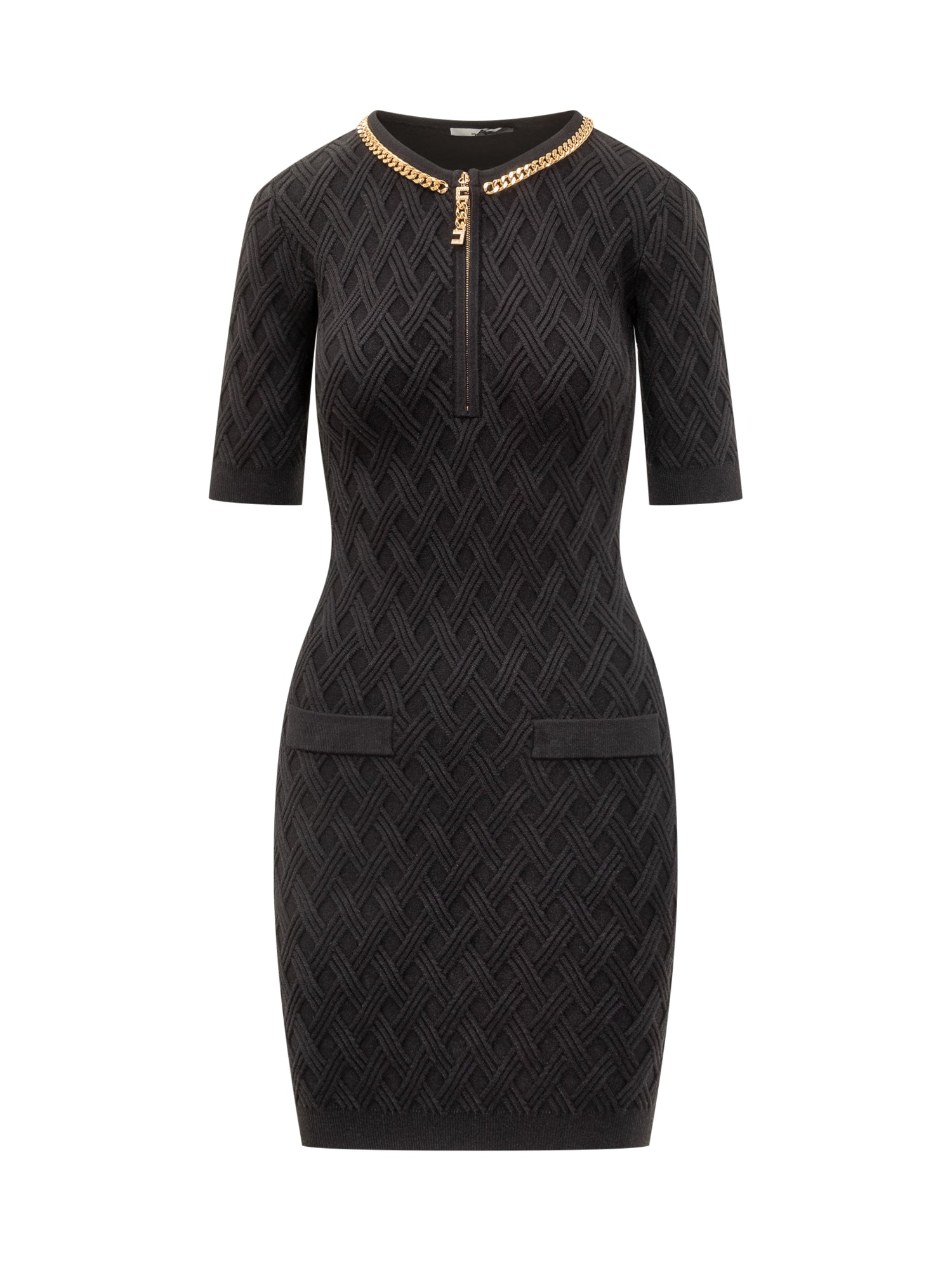 Abito nero Elisabetta Franchi in maglia jacquard con motivo geometrico, maniche corte e catena oro con logo sullo scollo.