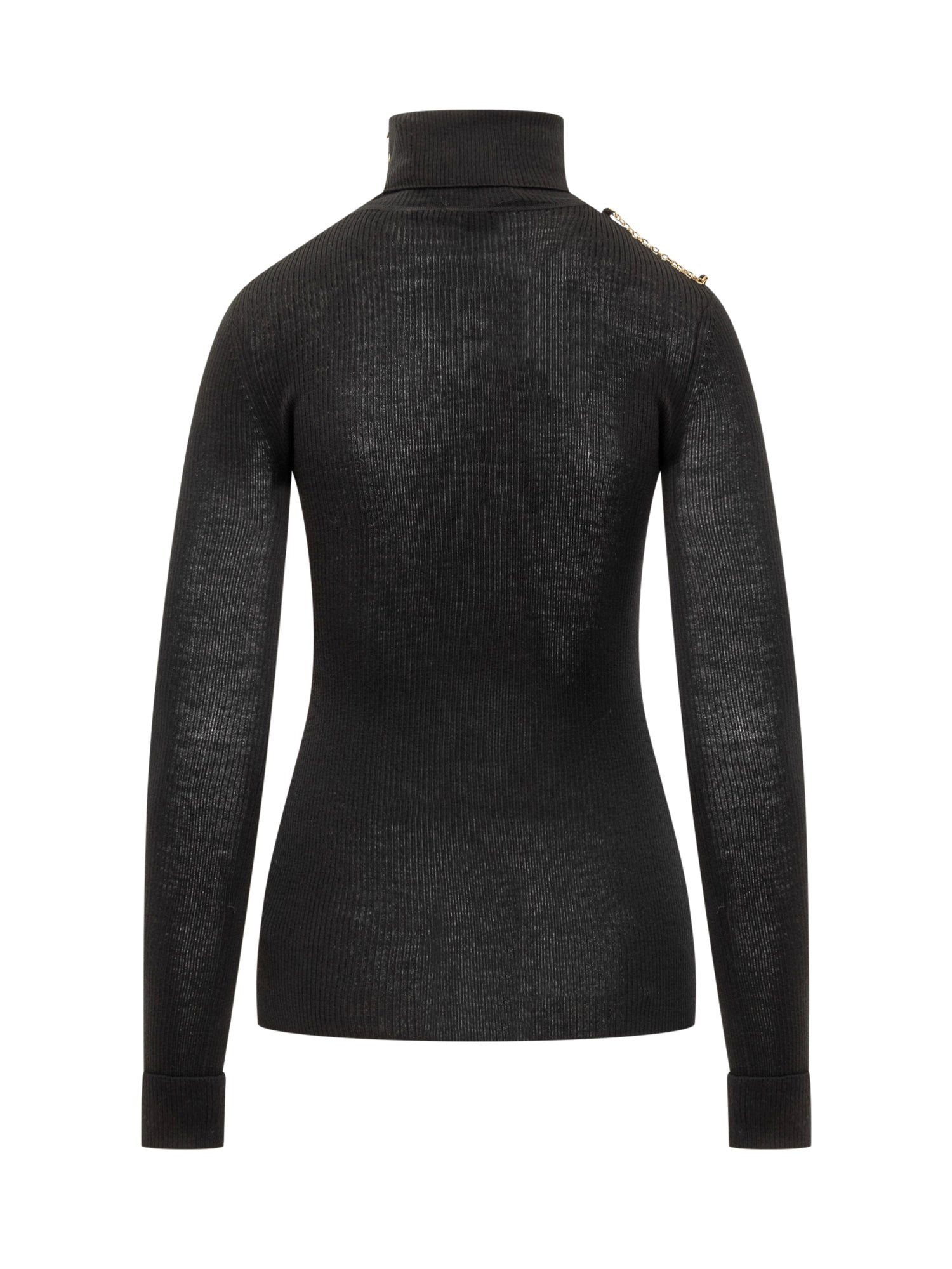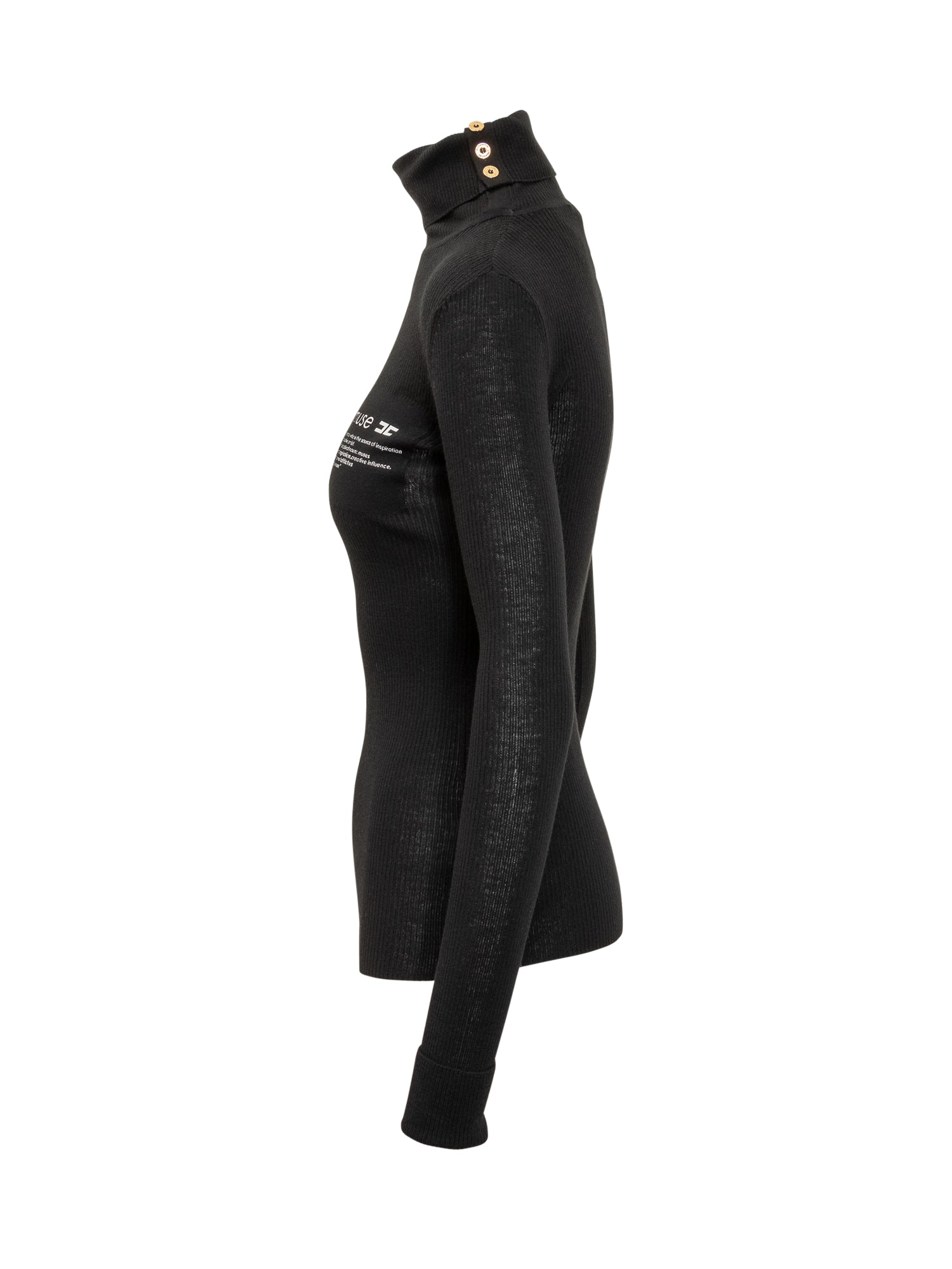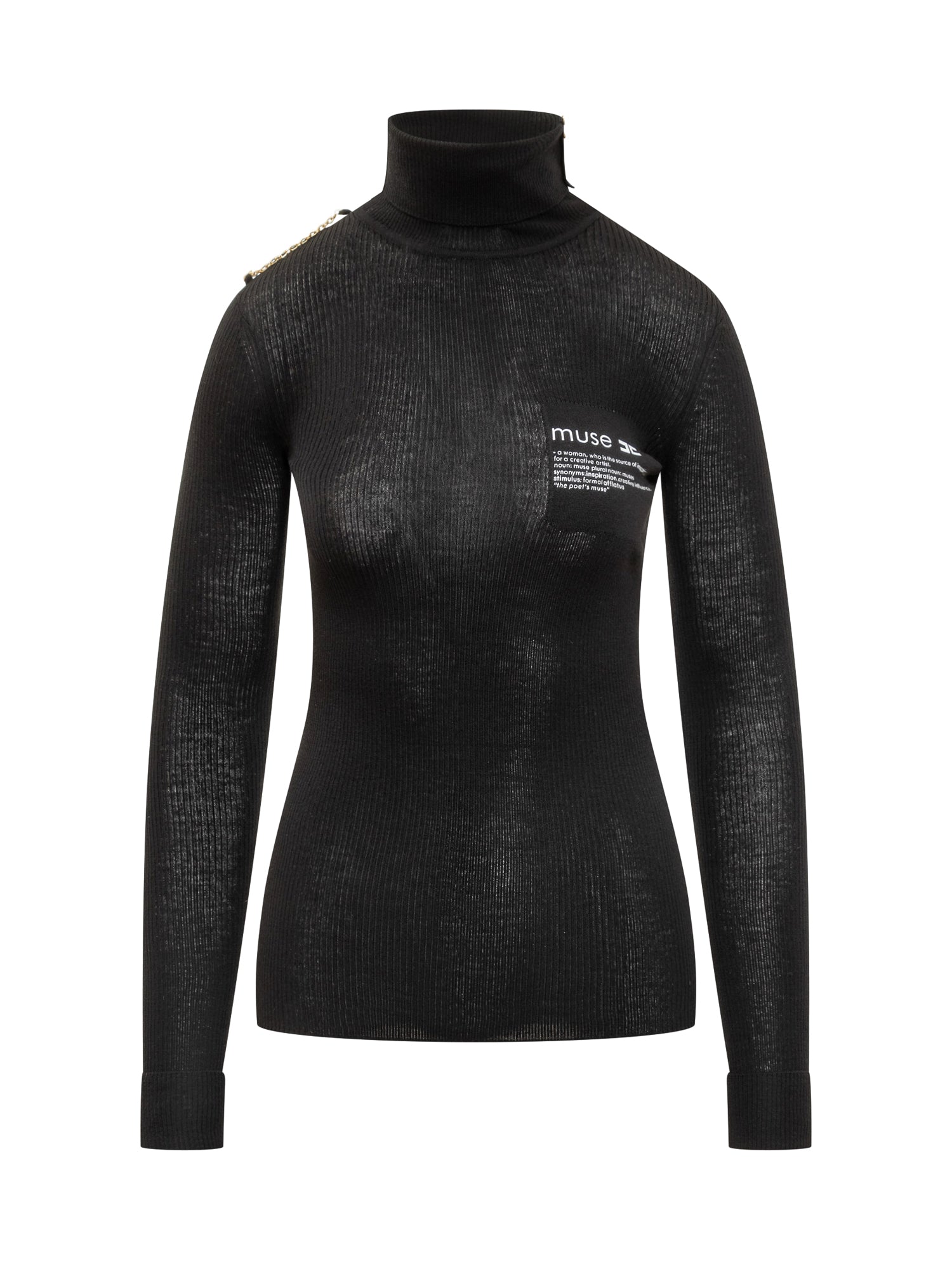 Dolcevita nero Elisabetta Franchi a coste sottili con dettaglio logo stampato sul petto e catena dorata sulla spalla.