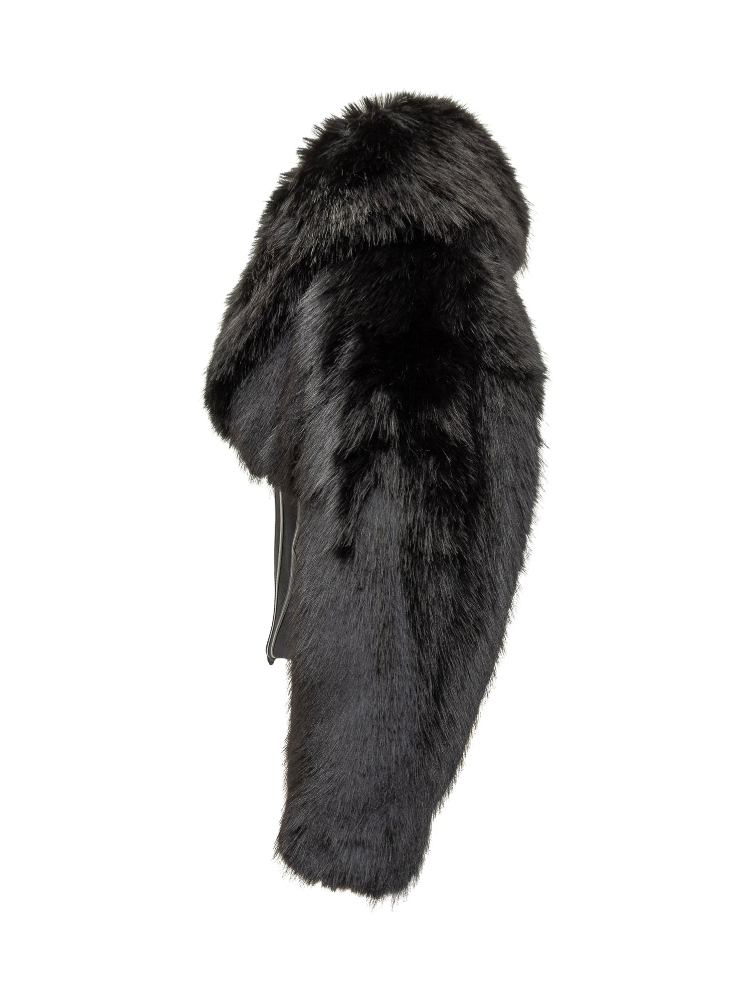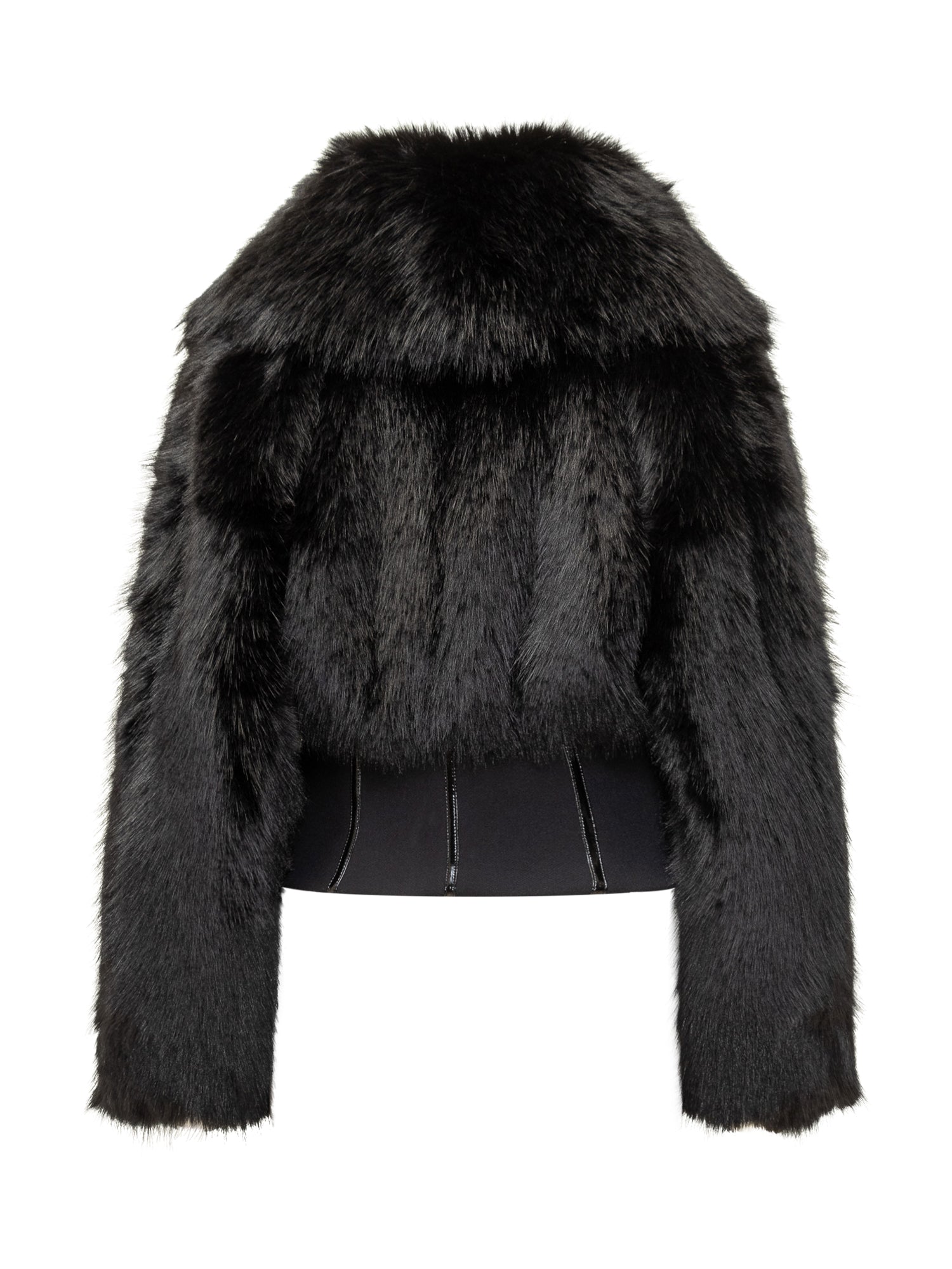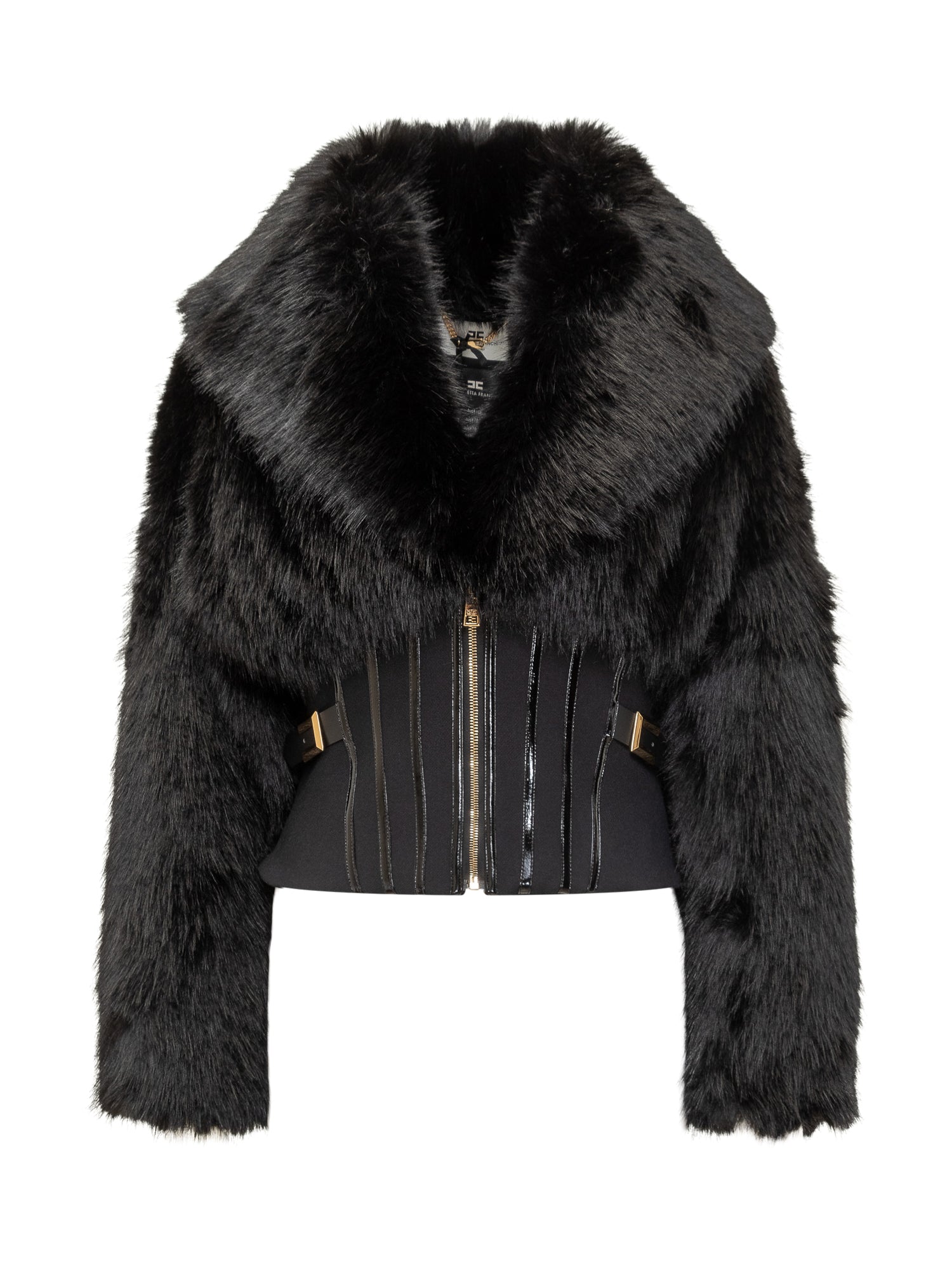 Giacca corta Elisabetta Franchi in eco pelliccia nera con zip frontale e inserti lucidi in vita.