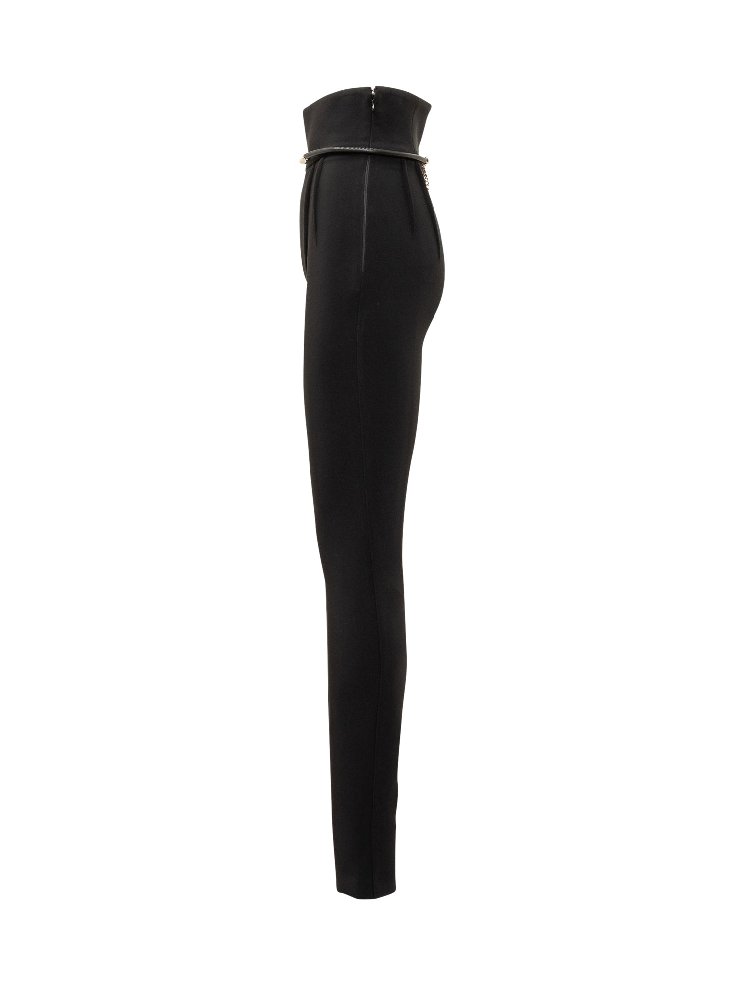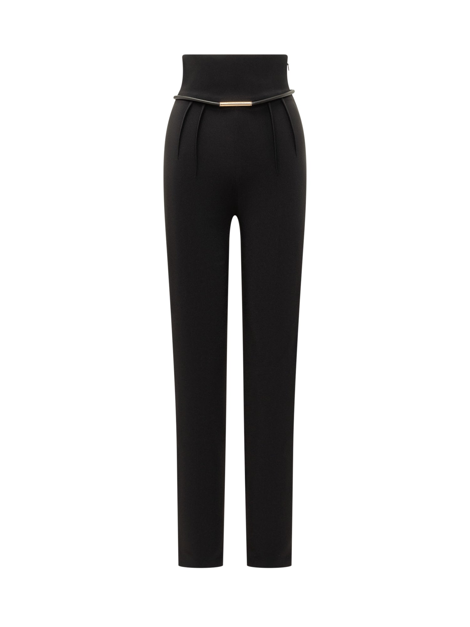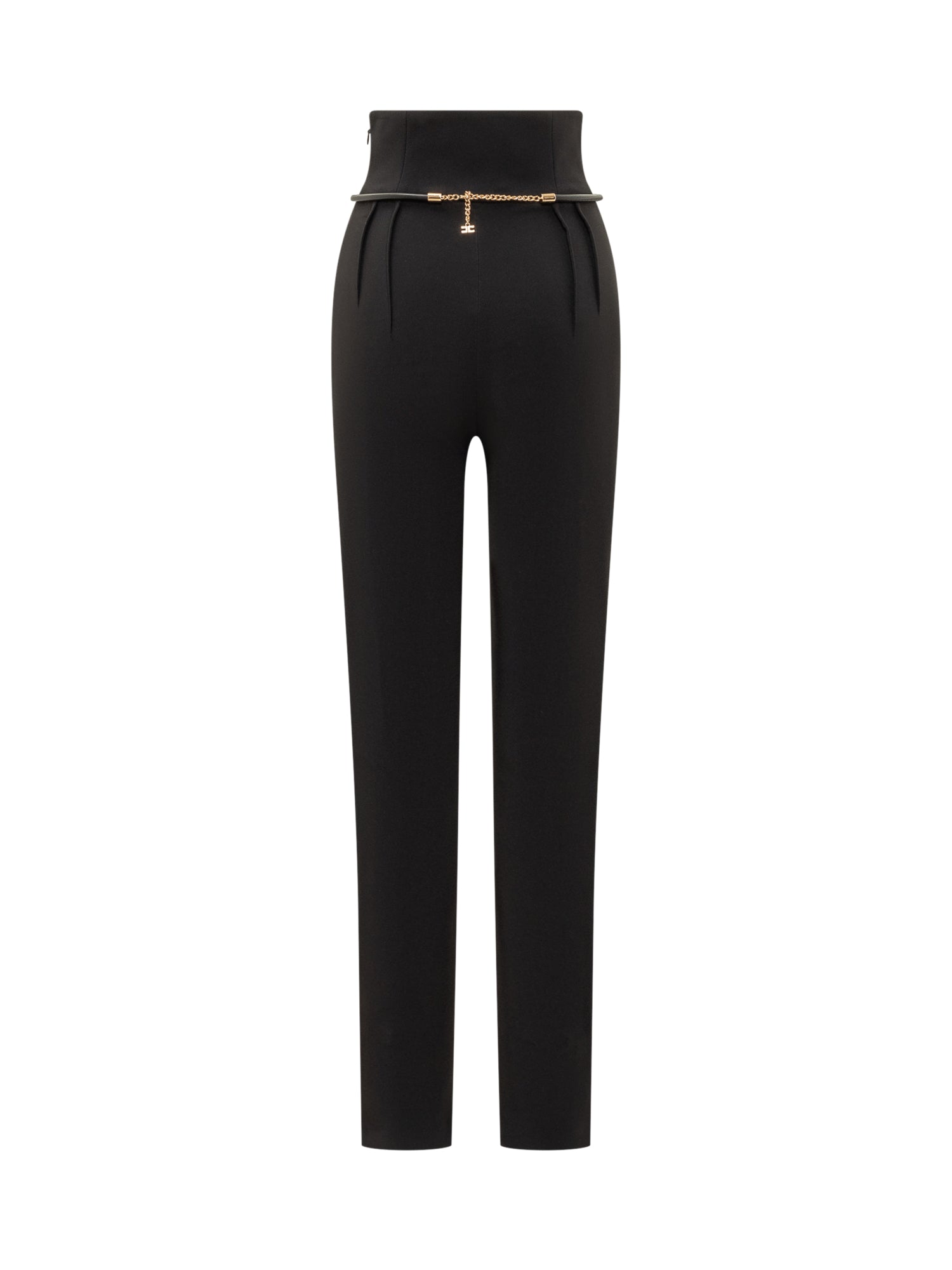 Pantaloni neri a vita alta Elisabetta Franchi con cinturino decorativo e dettaglio gioiello dorato.