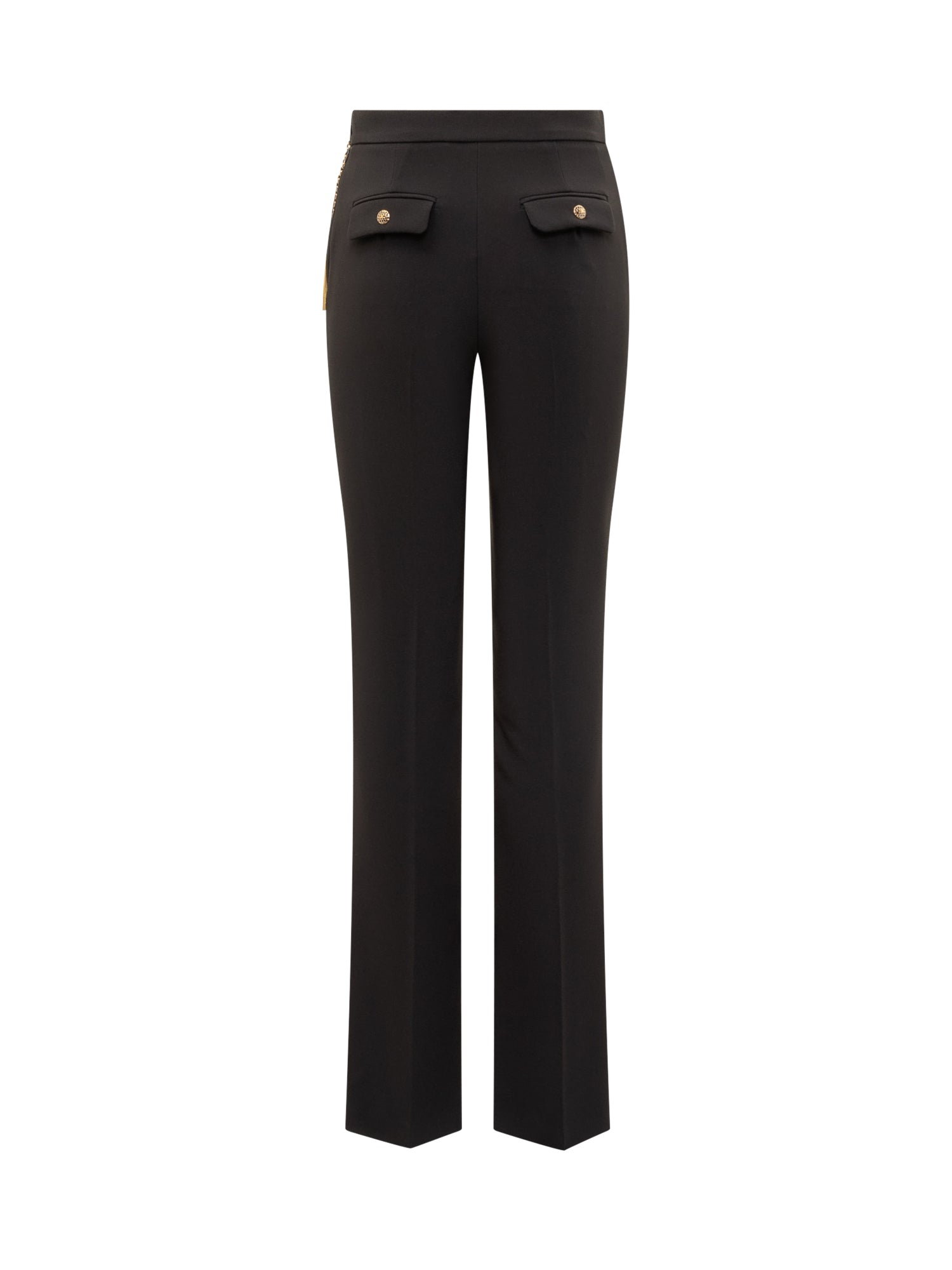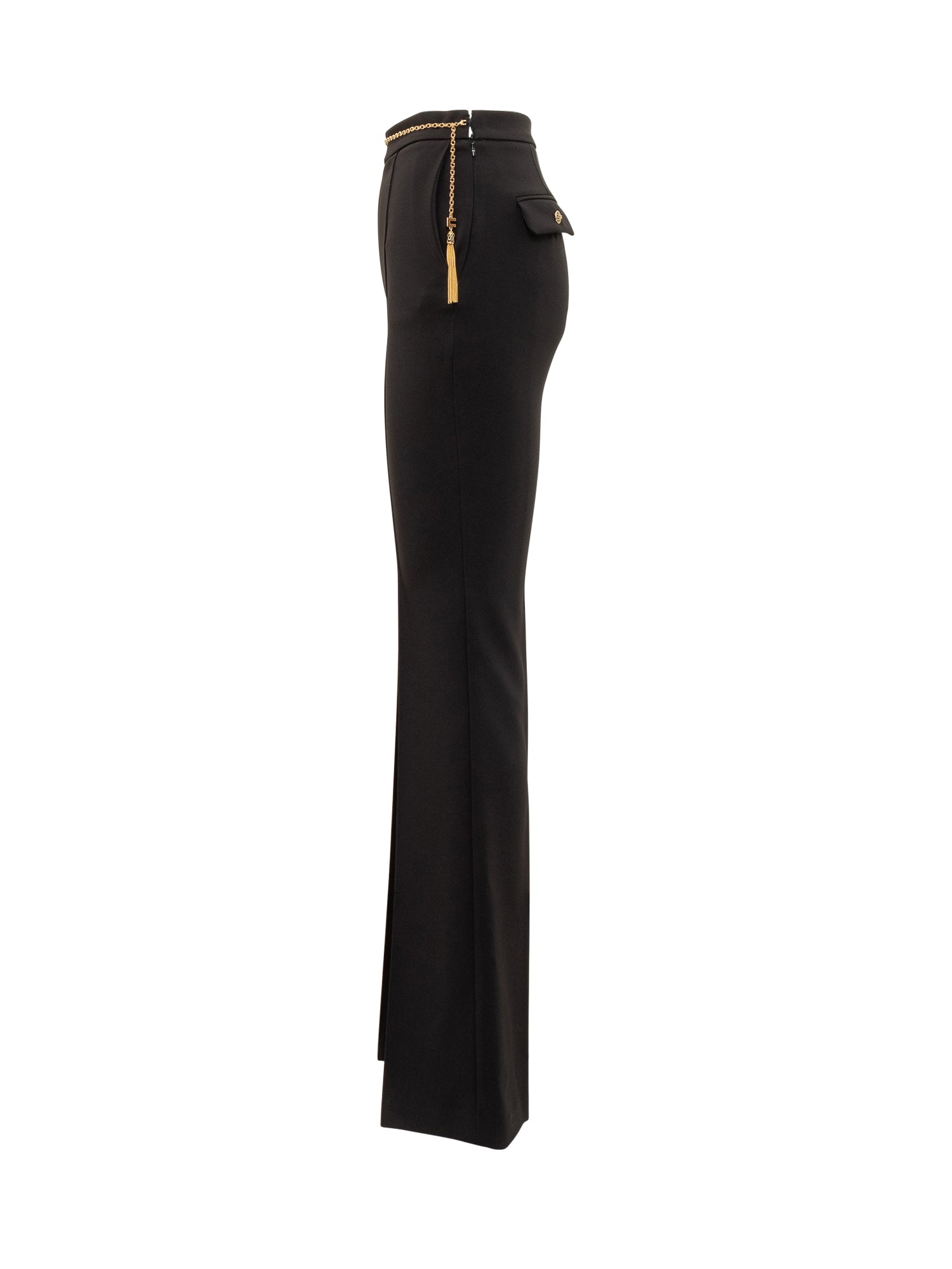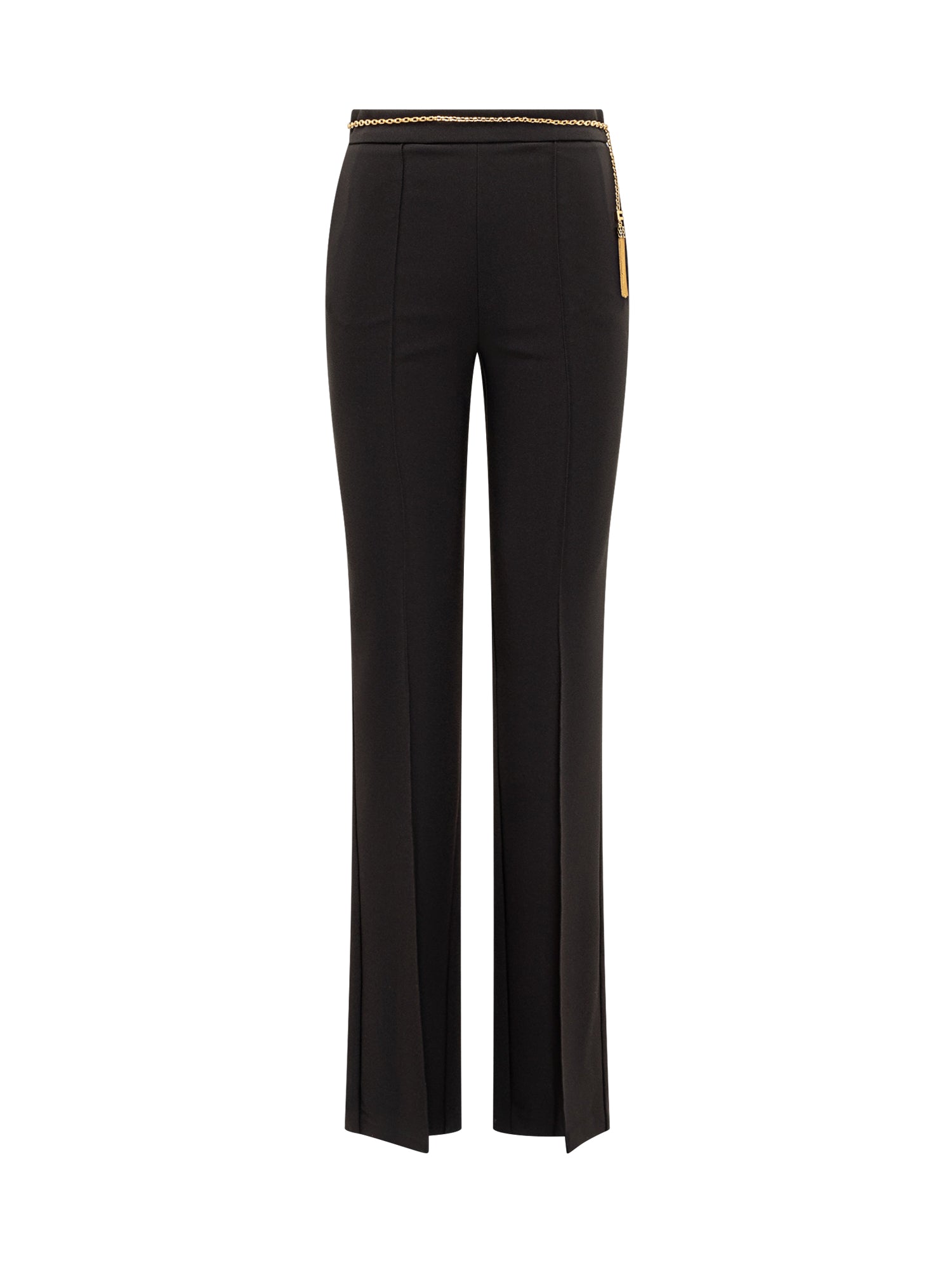 Pantaloni Elisabetta Franchi in tessuto nero con linea dritta, spacco frontale e cintura gioiello a catena dorata.