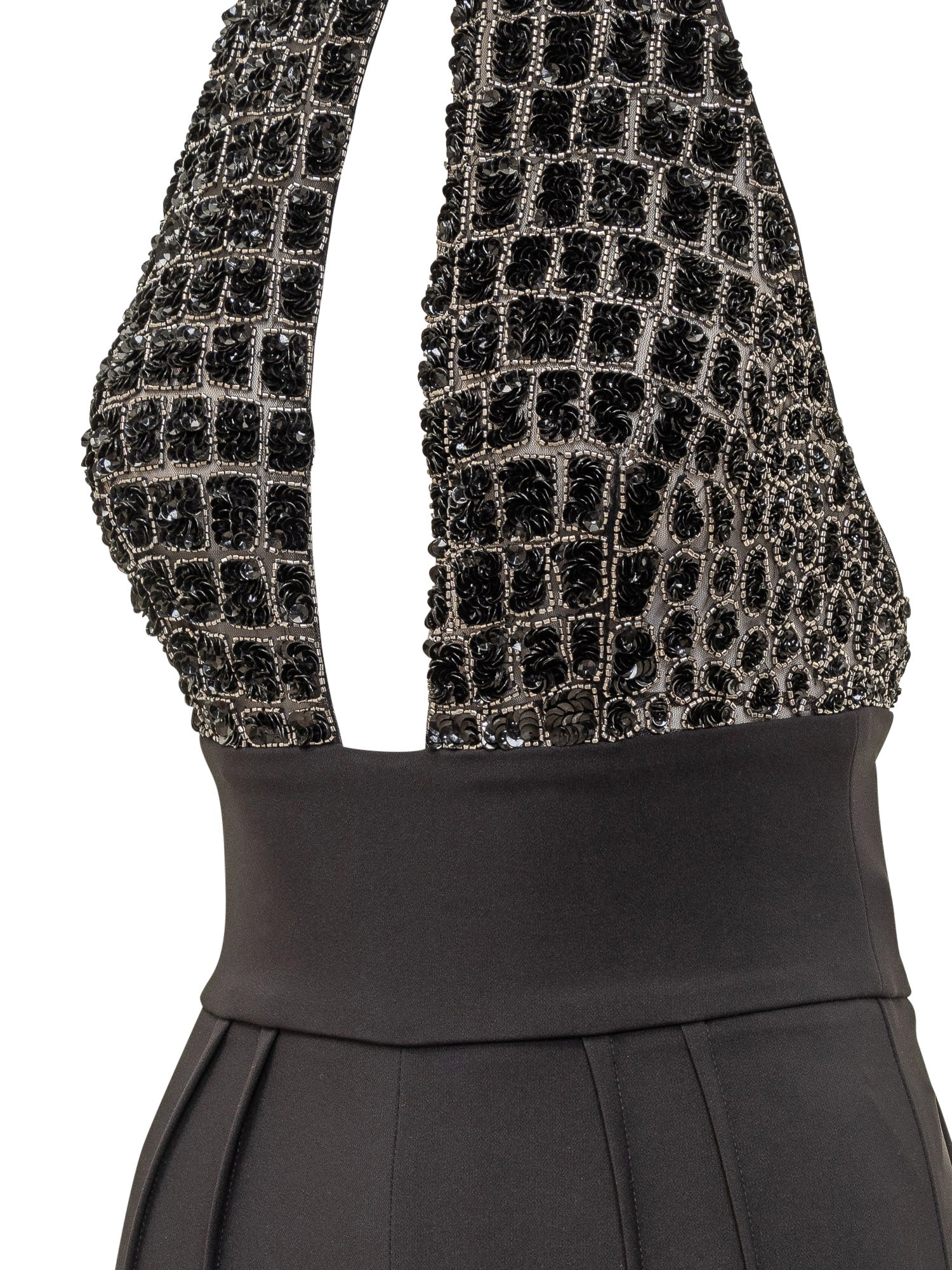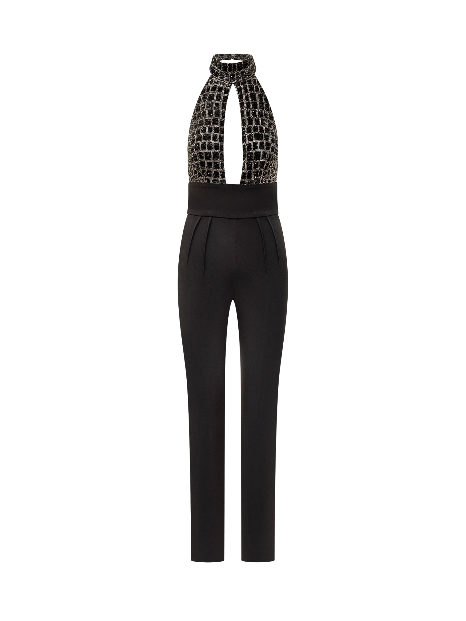 Tuta nera elegante con top ricamato e scollo profondo. Design a pantalone a sigaretta e vita alta.