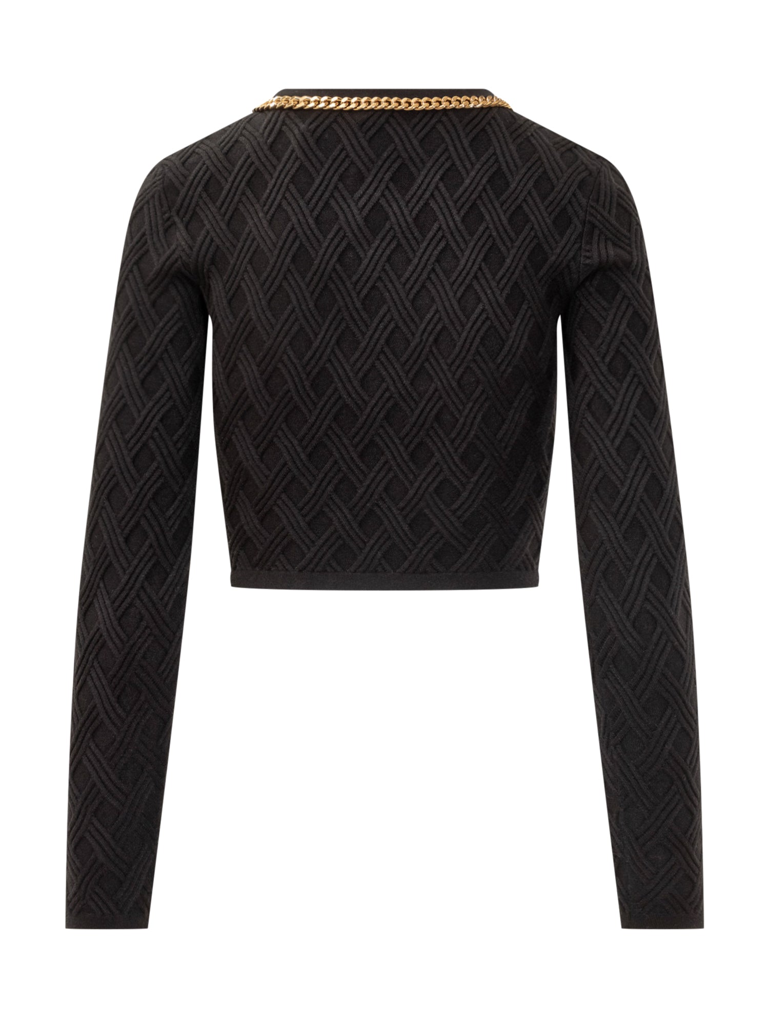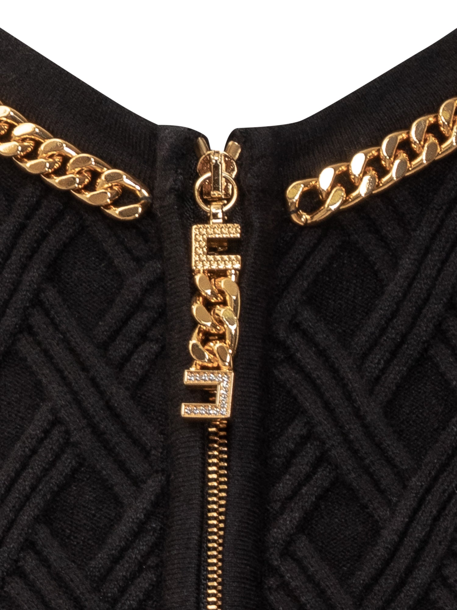 Giacca crop Elisabetta Franchi in tessuto jacquard nero con zip frontale e dettaglio catena oro sullo scollo.