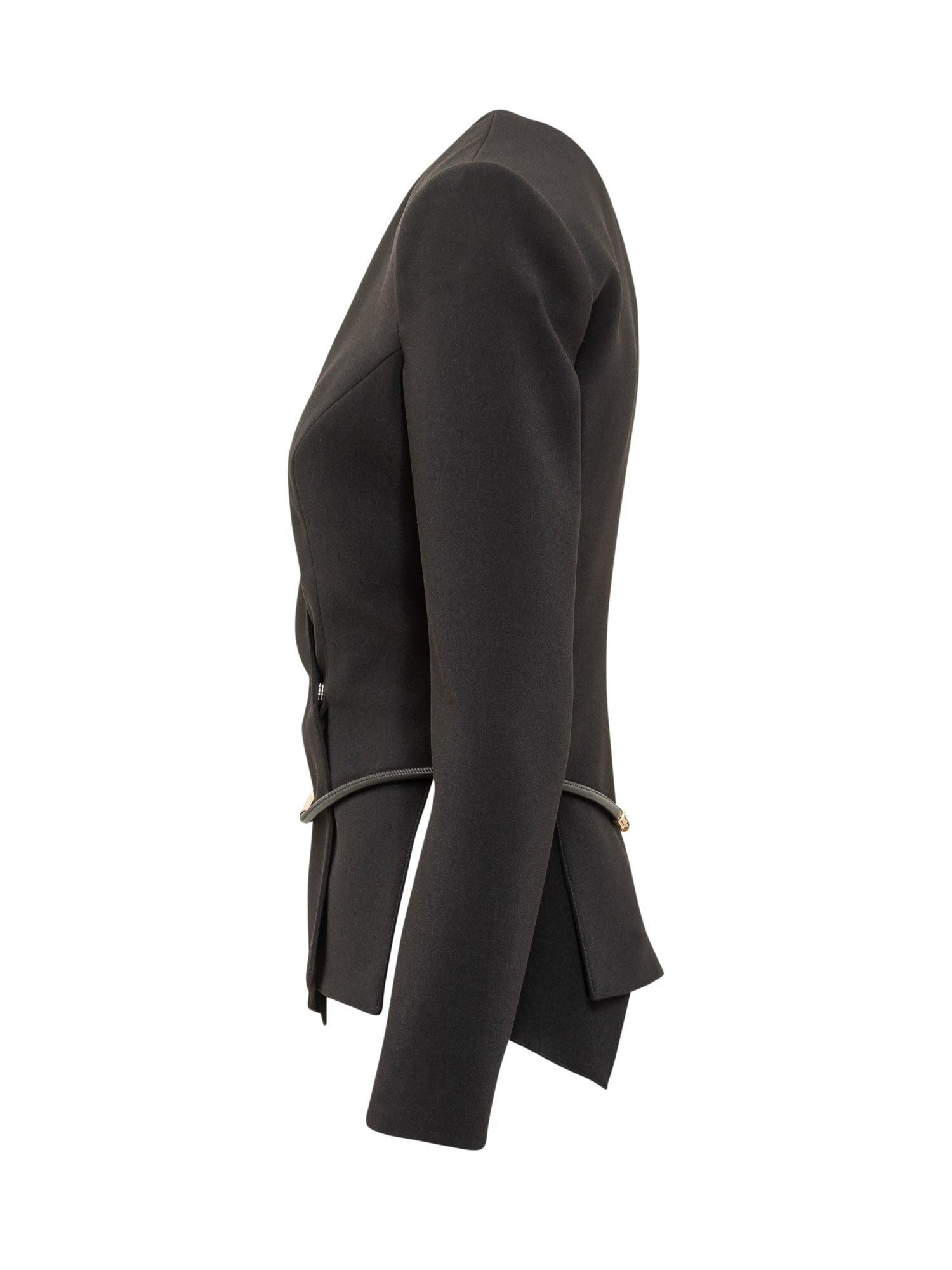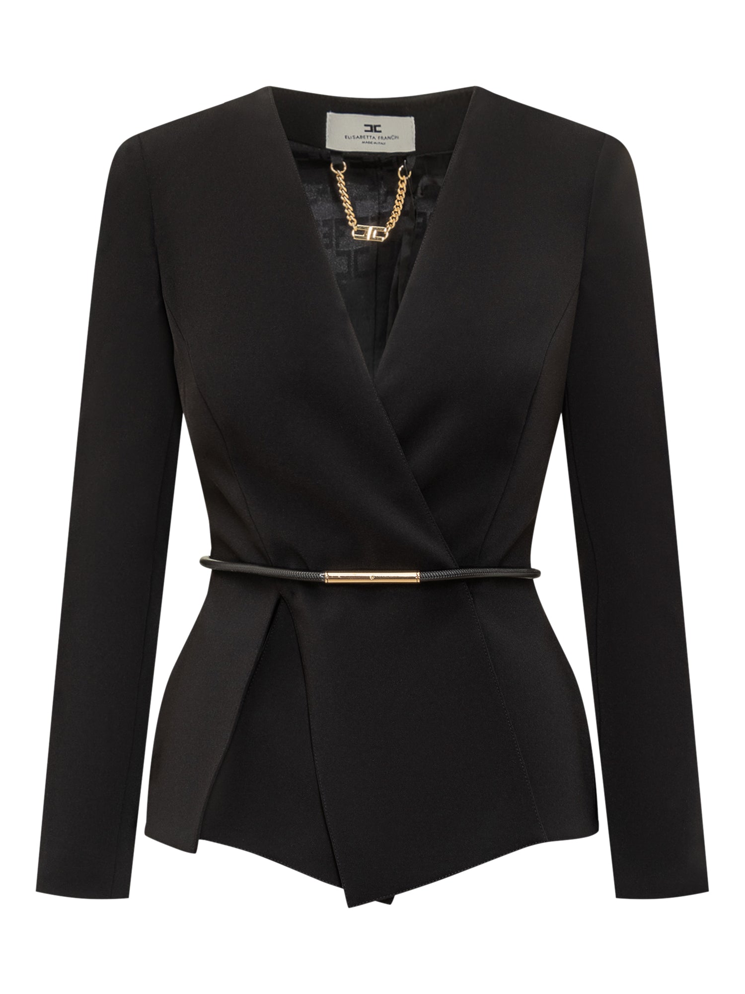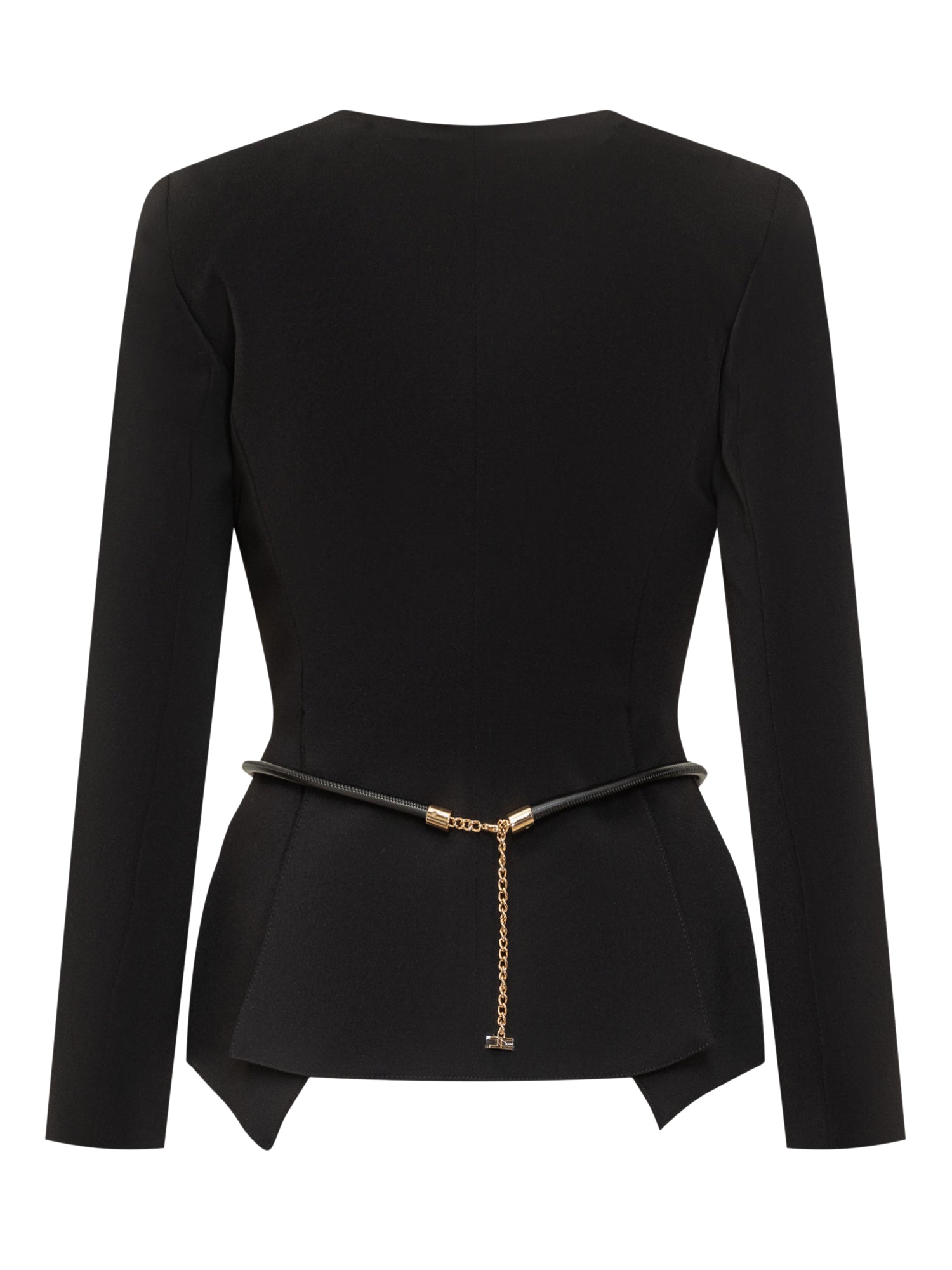 Giacca nera Elisabetta Franchi dal taglio sartoriale con scollo a V, catena dorata interna e cintura sottile con dettaglio metallico.