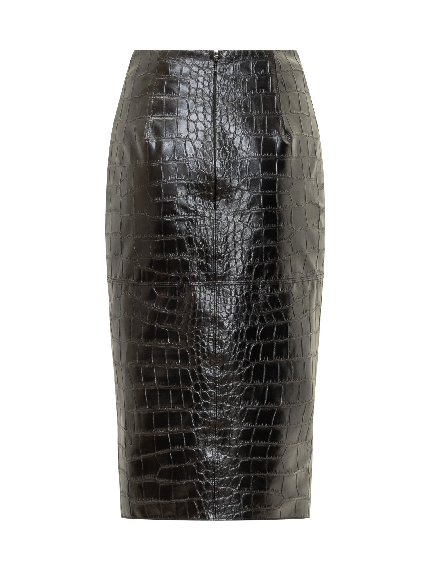 Gonna a tubino Elisabetta Franchi in eco-pelle effetto coccodrillo, con zip dorata frontale a tutta lunghezza.