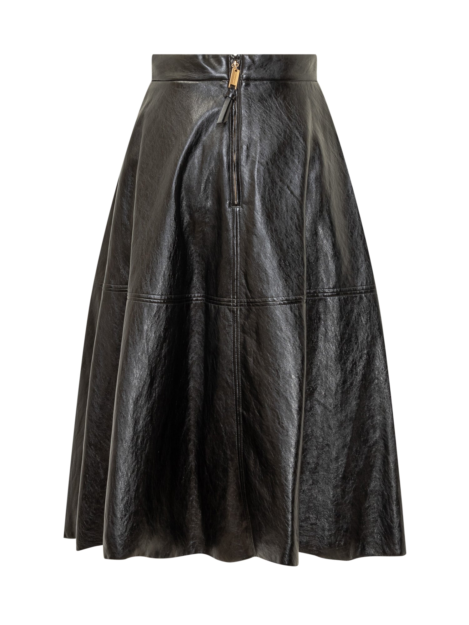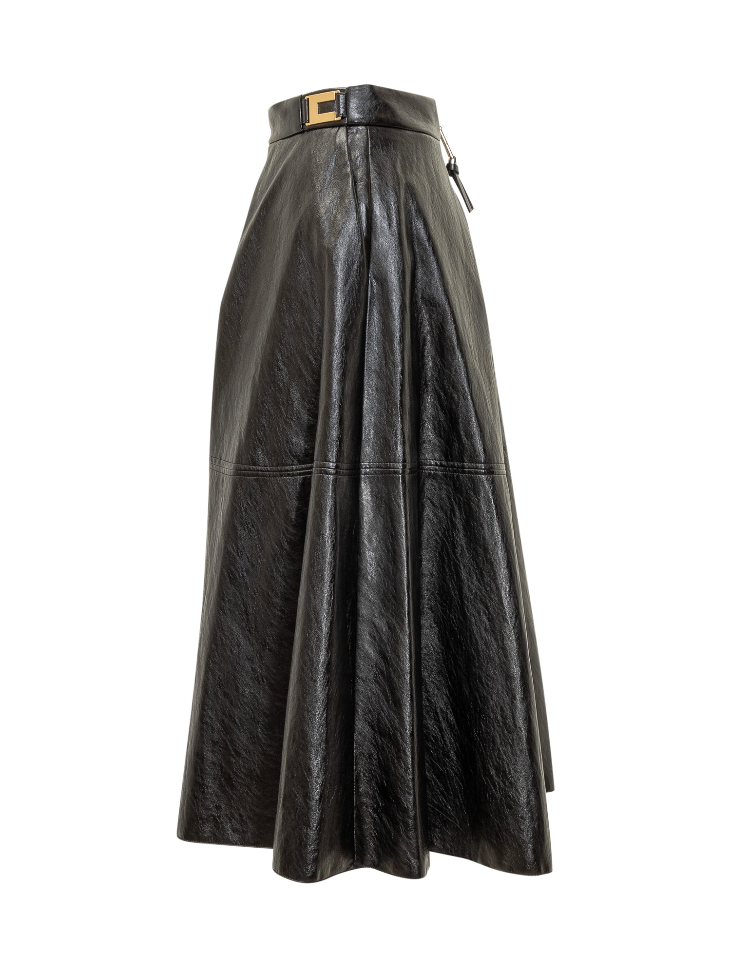 Gonna midi Elisabetta Franchi in ecopelle nera, a linea svasata con vita alta e cinturino decorato con maxi fibbie logo dorate.