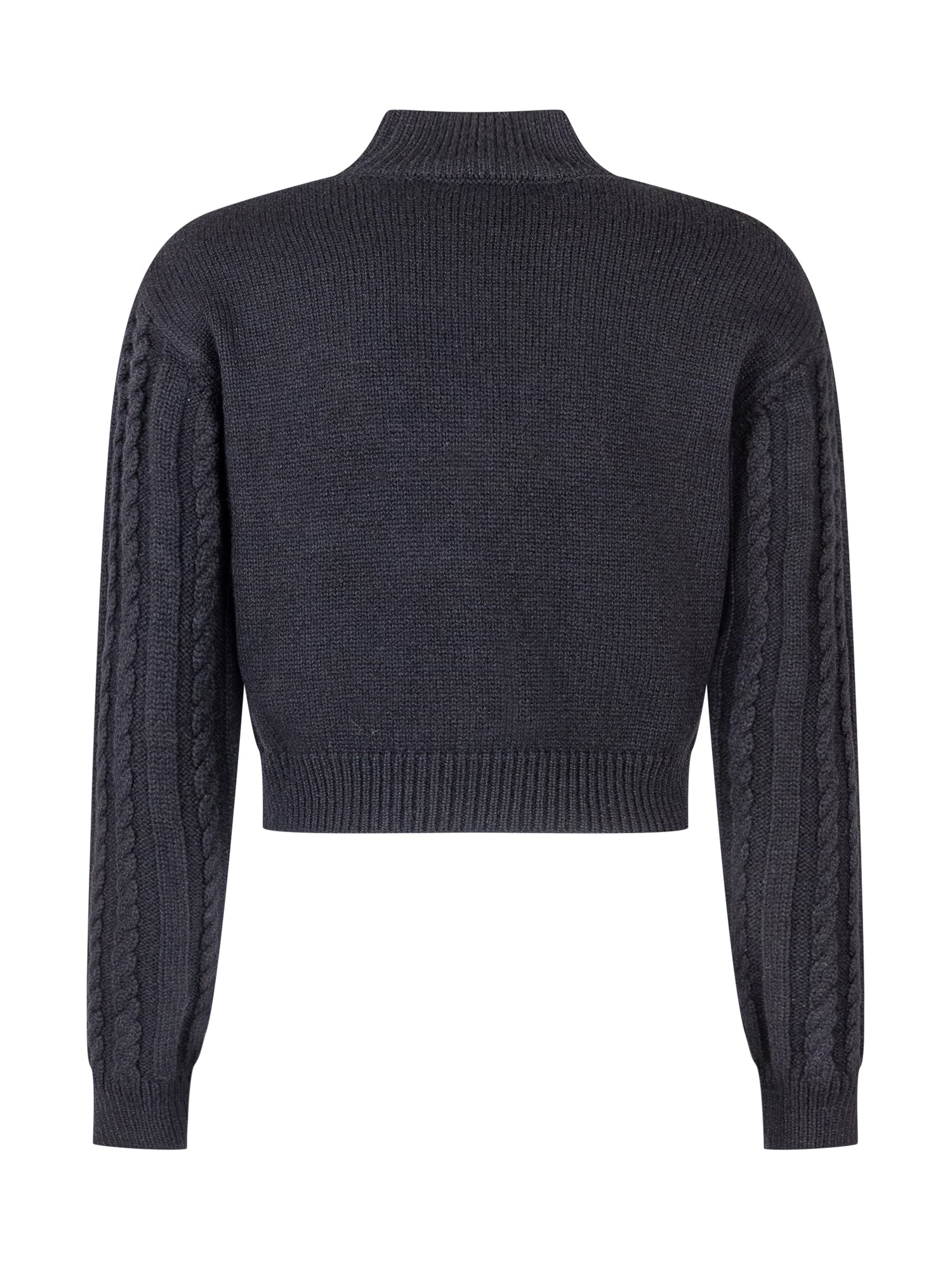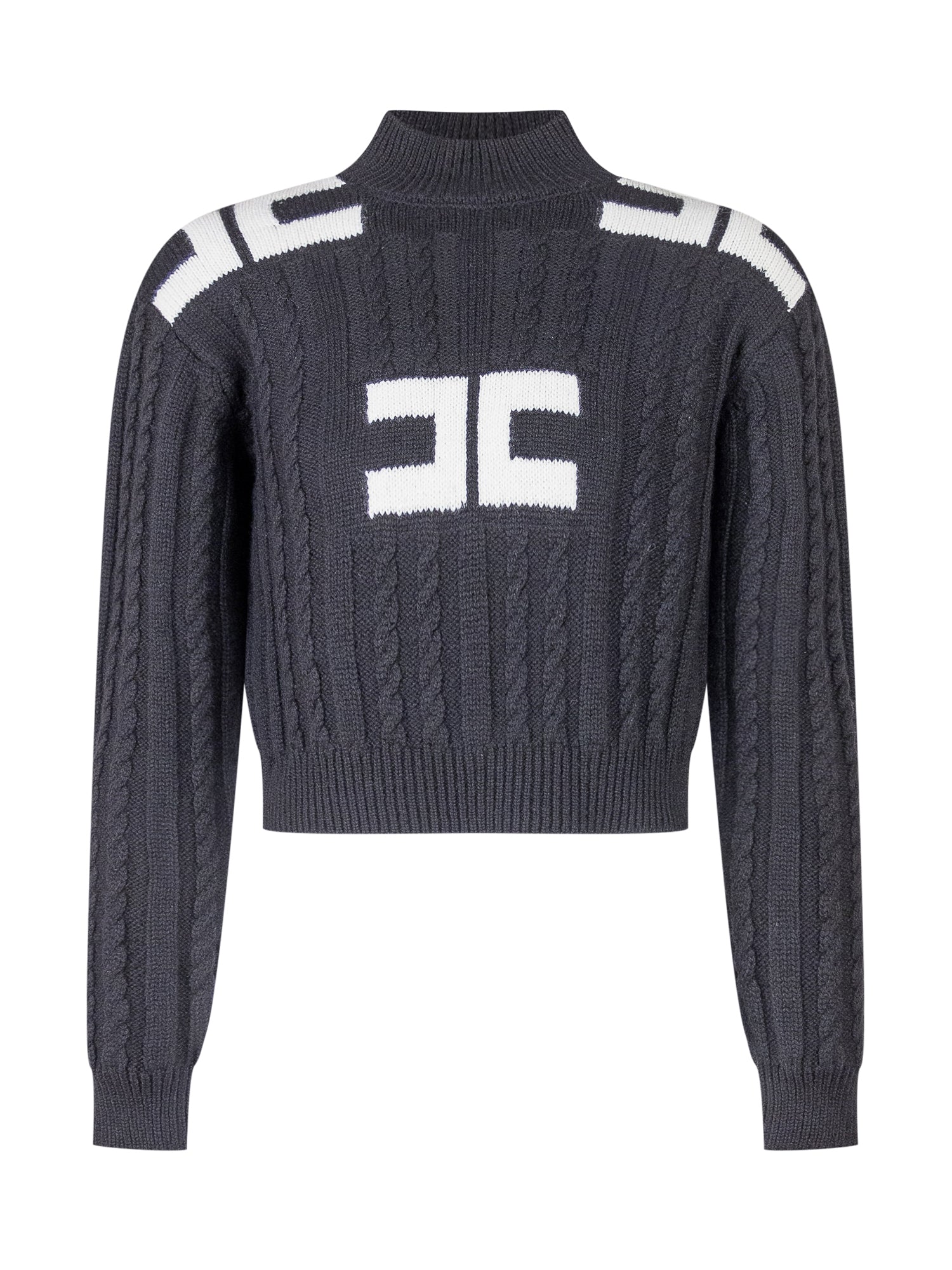 Maglione Elisabetta Franchi Kids in maglia a treccia grigia con maxi logo bianco sul petto e sulle spalle. Collo alto e taglio corto.
