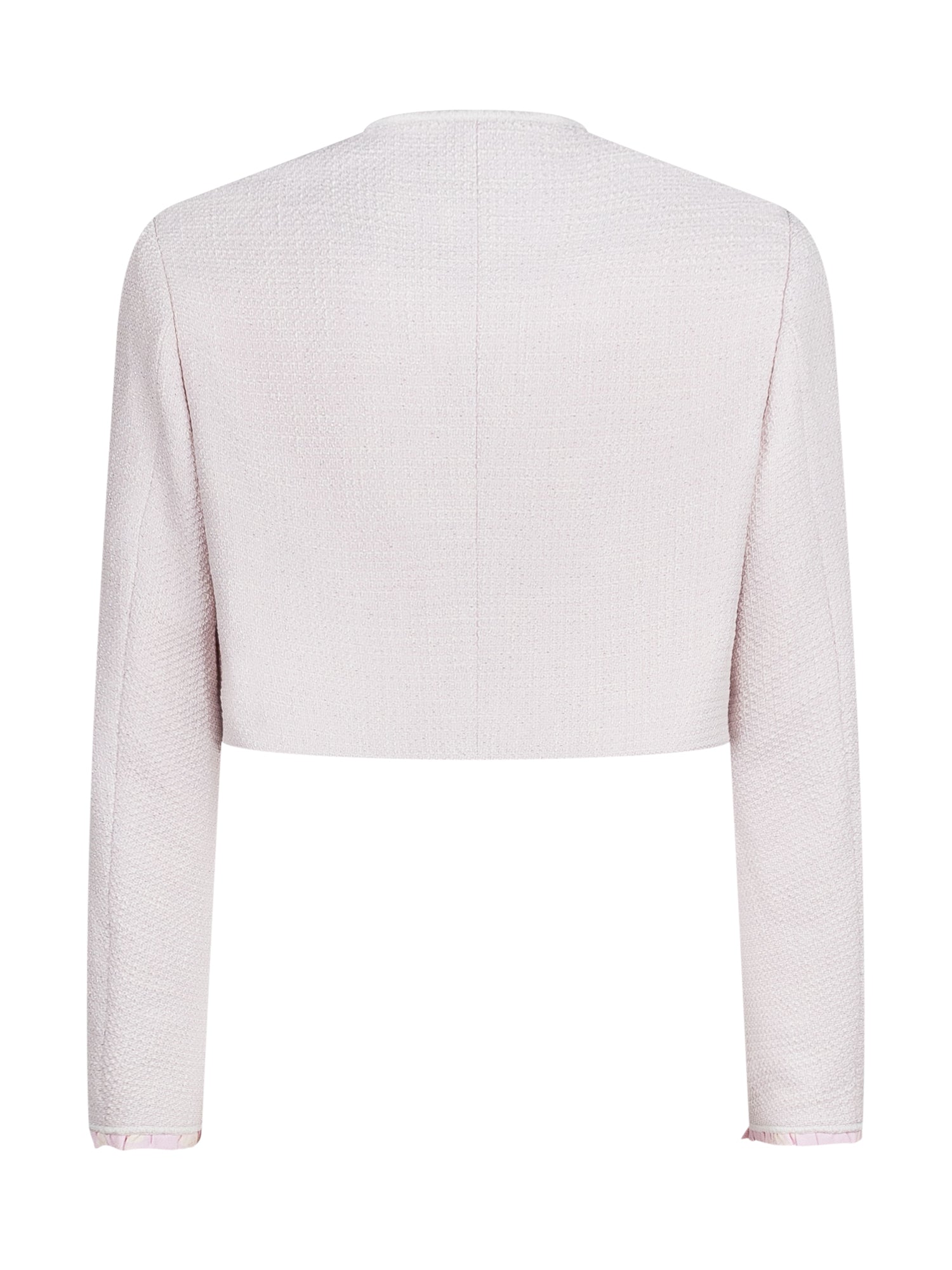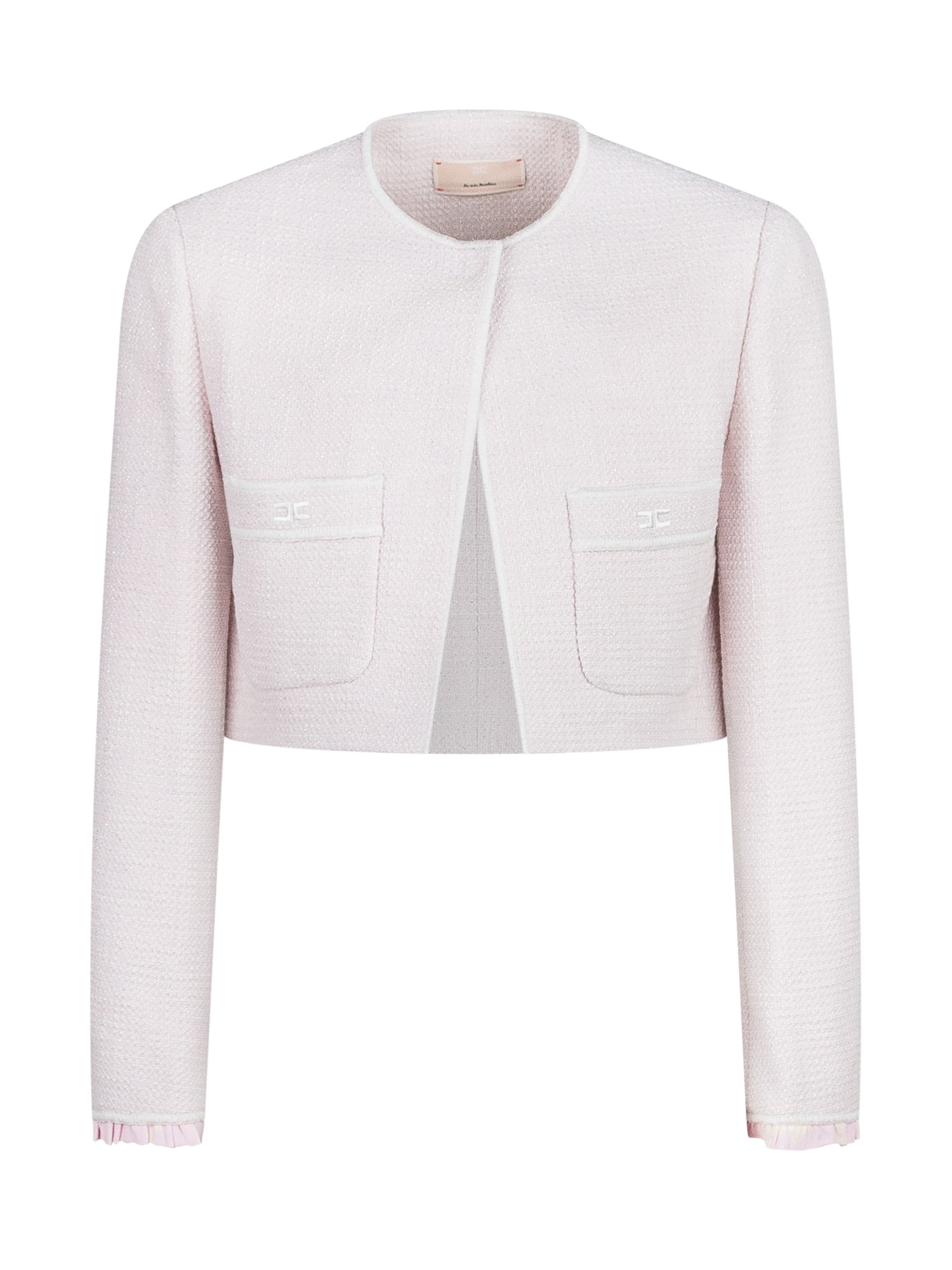 Giacca rosa in tweed. Tasche sul davanti. Chiusura con bottone in alto. Polsini plissettati.
