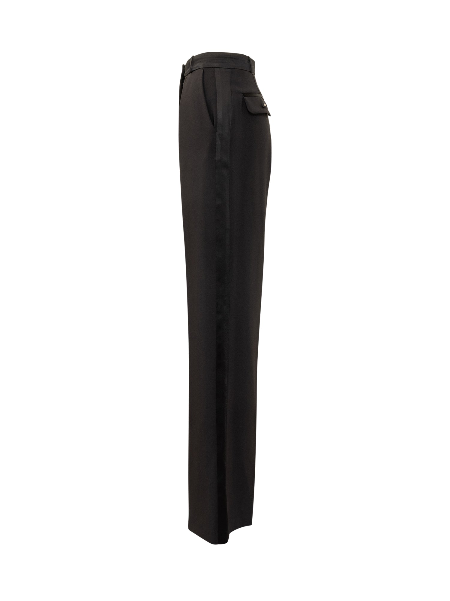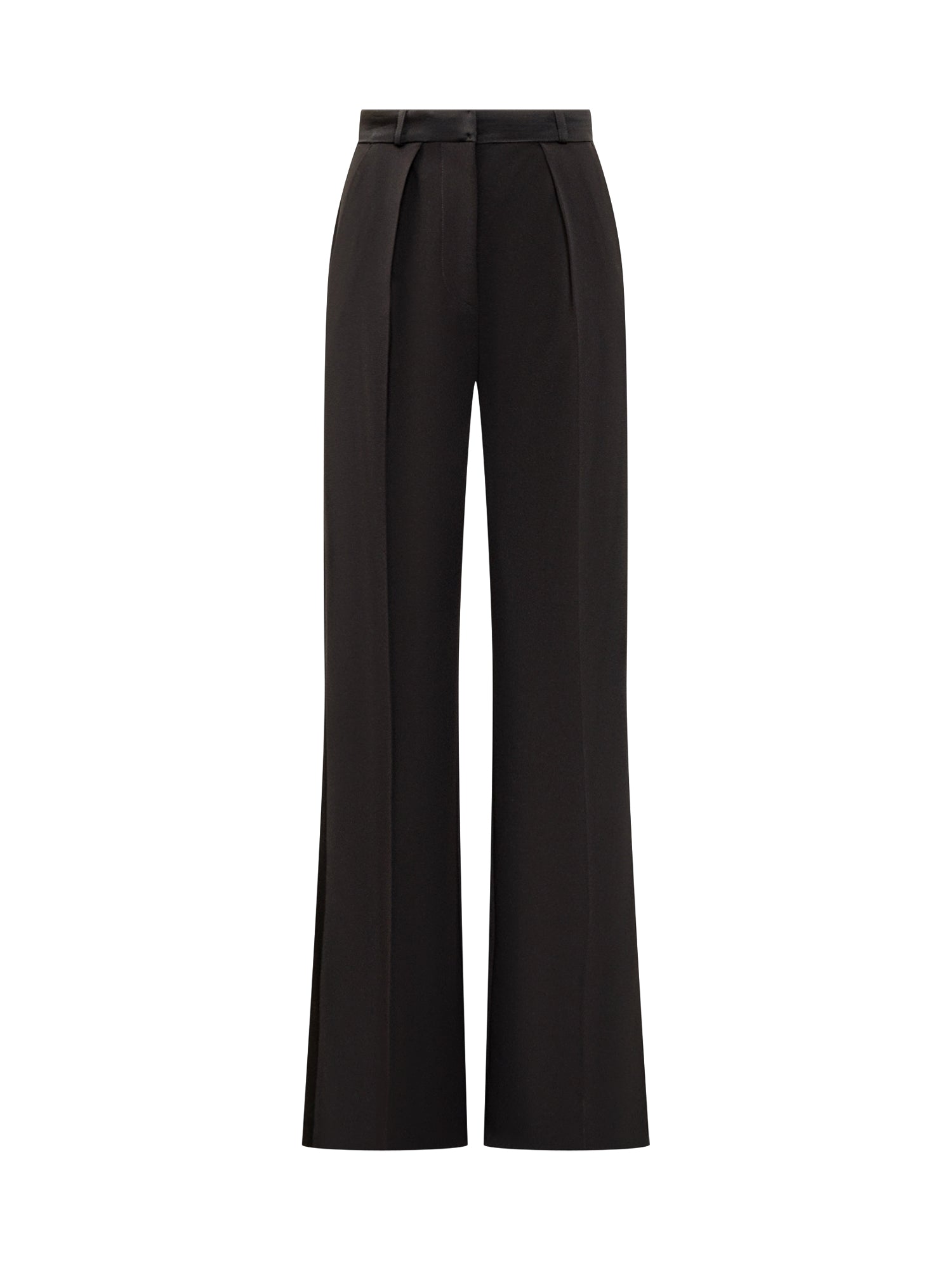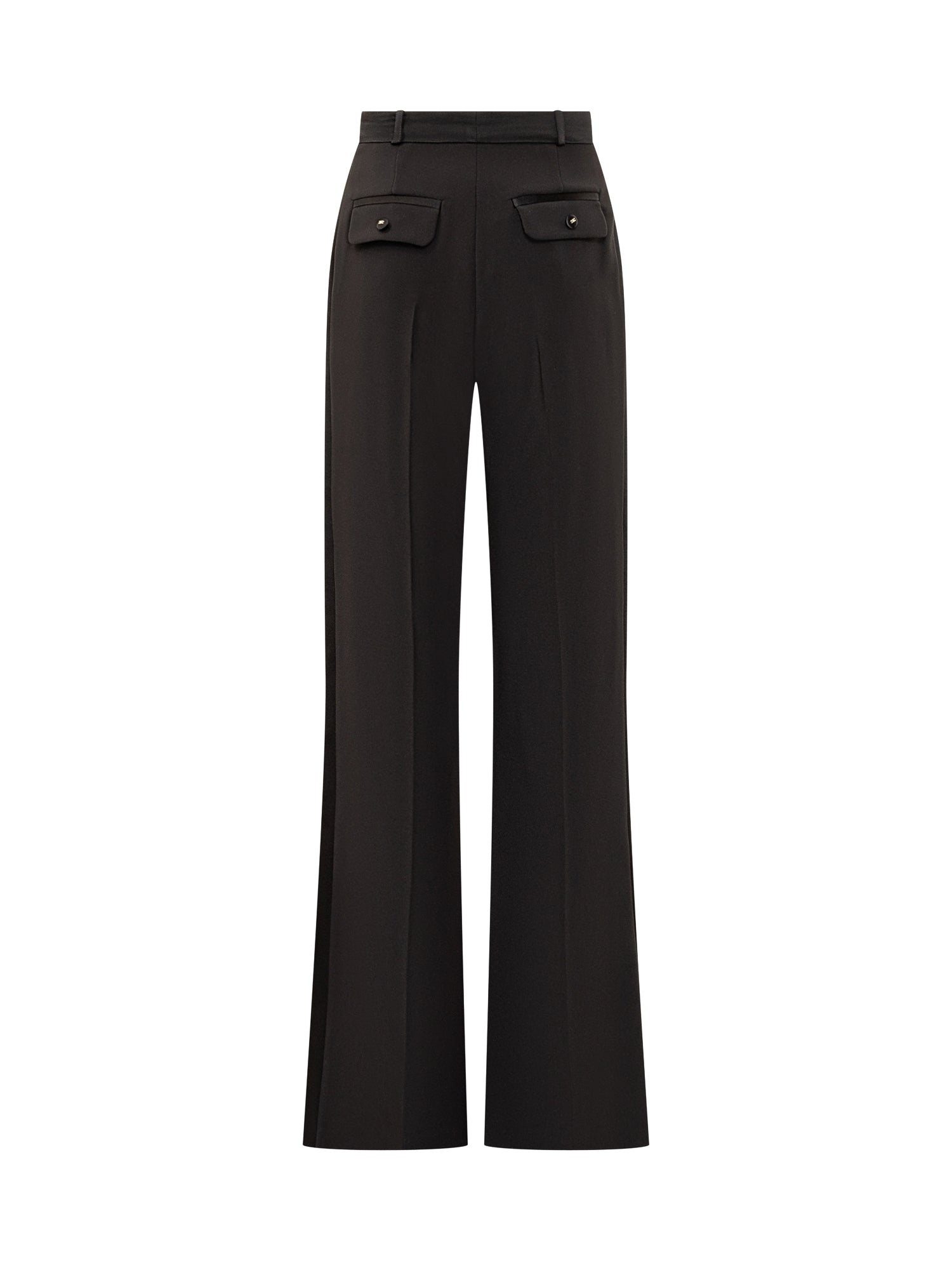 Pantaloni a palazzo neri Elisabetta Franchi con elegante cintura in raso. Linea fluida e sofisticata, ideali per look da sera o ufficio. Chiusura con zip e gancetti per una vestibilità raffinata e sicura.