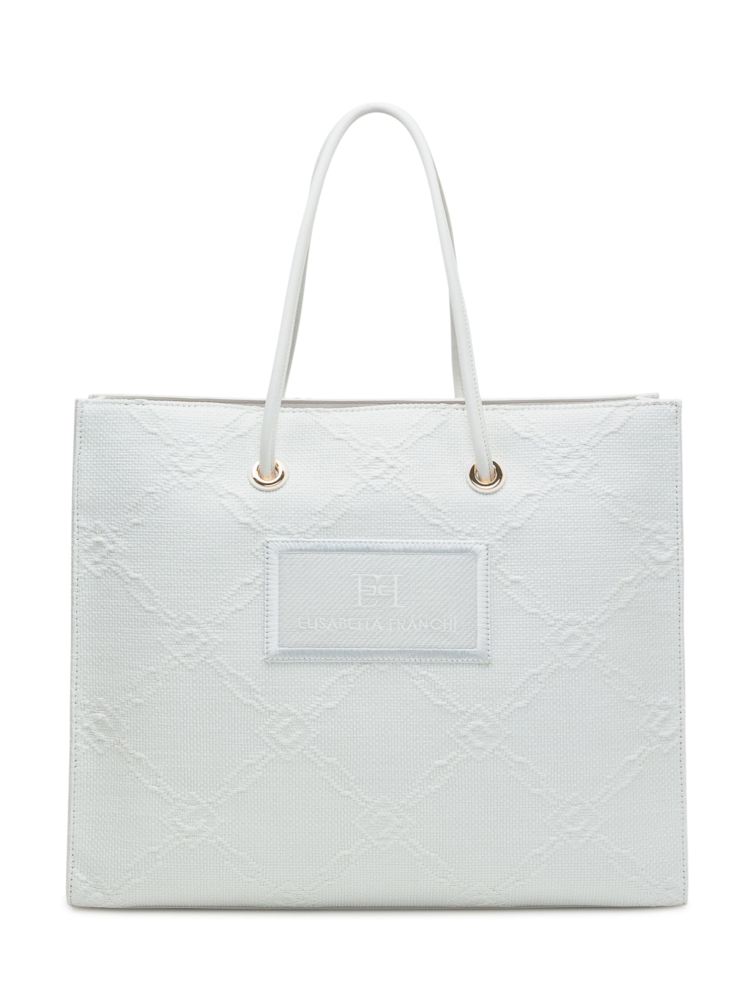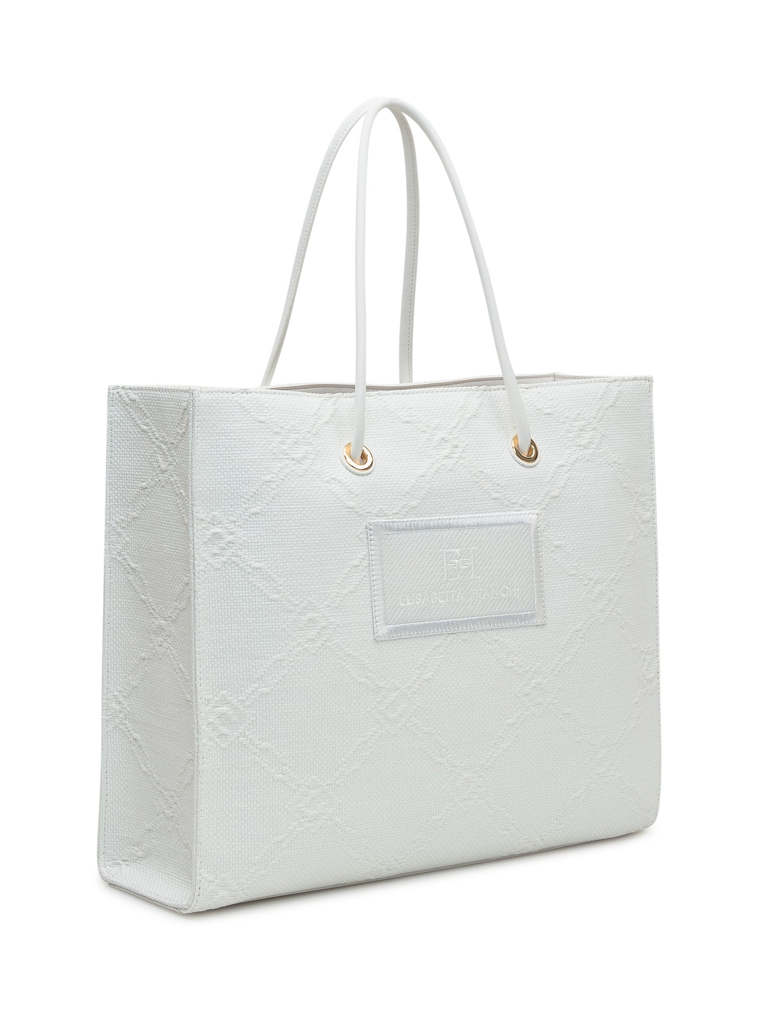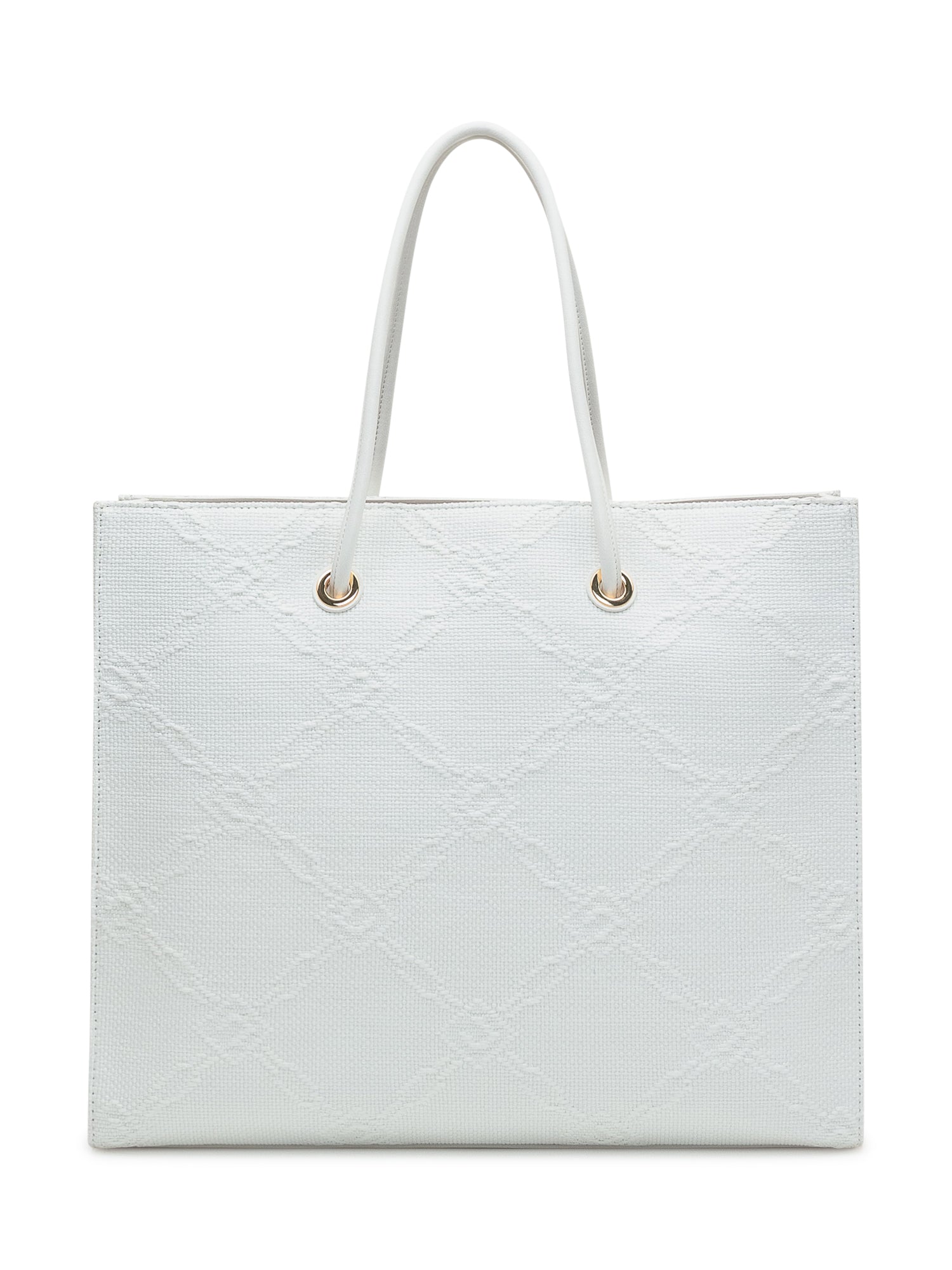 Borsa tote grande bianca realizzata in rafia jacquard con disegno a losanghe, impreziosita da dettagli in metallo dorato per una nota di luce. Una patch con logo ricamato completa l'accessorio.