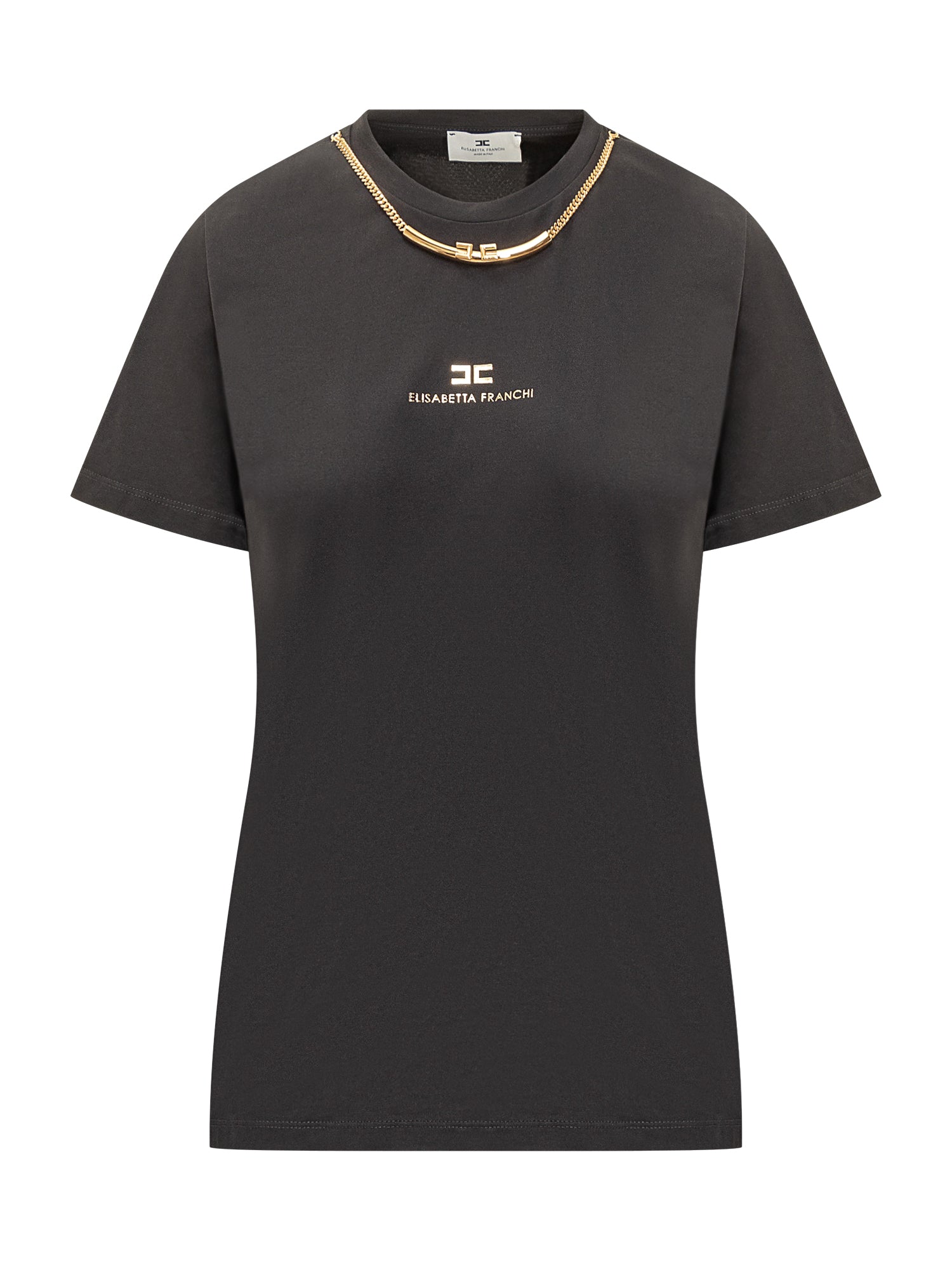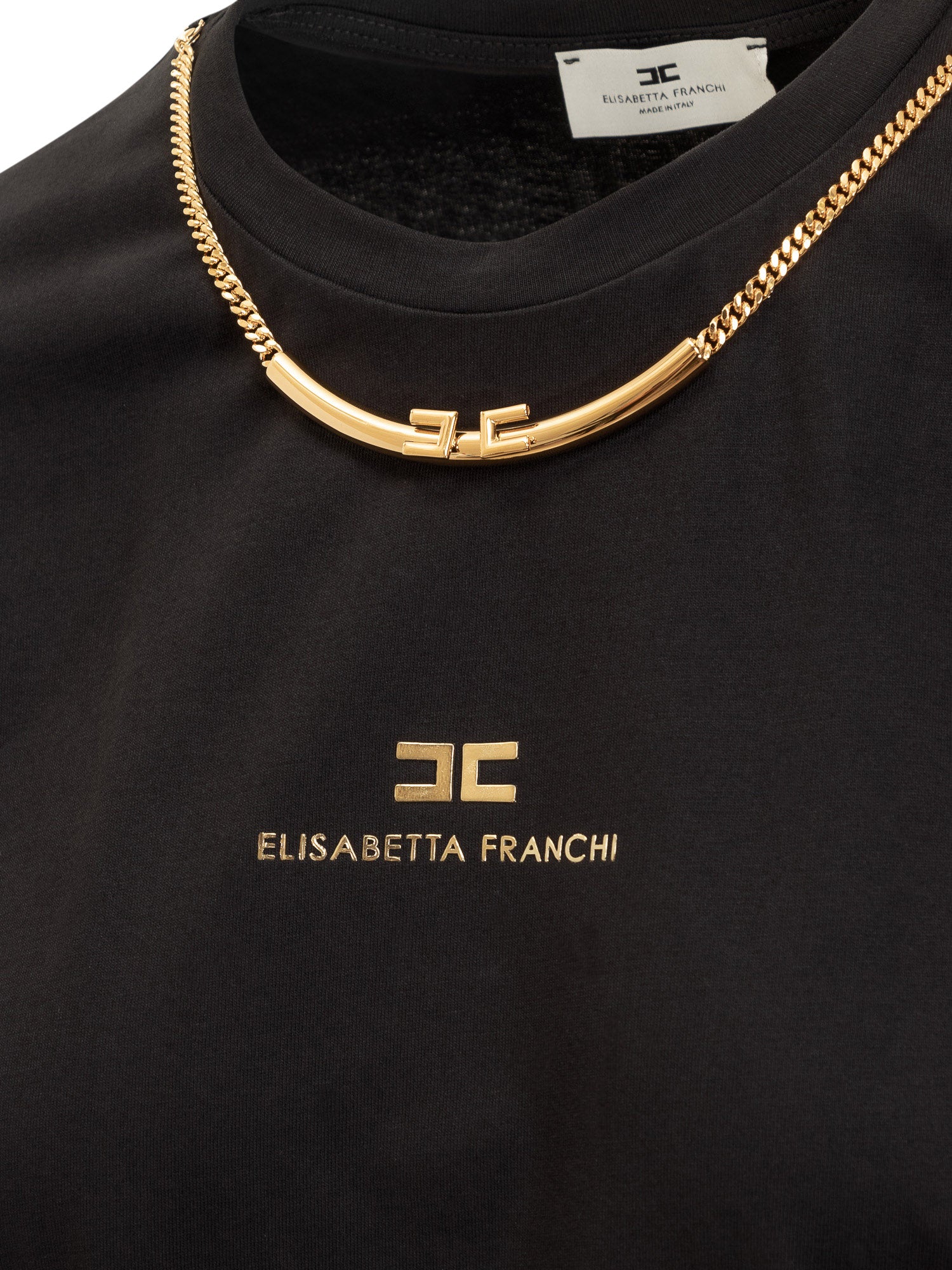 T-shirt nera Elisabetta Franchi con logo frontale e collier dorato integrato.