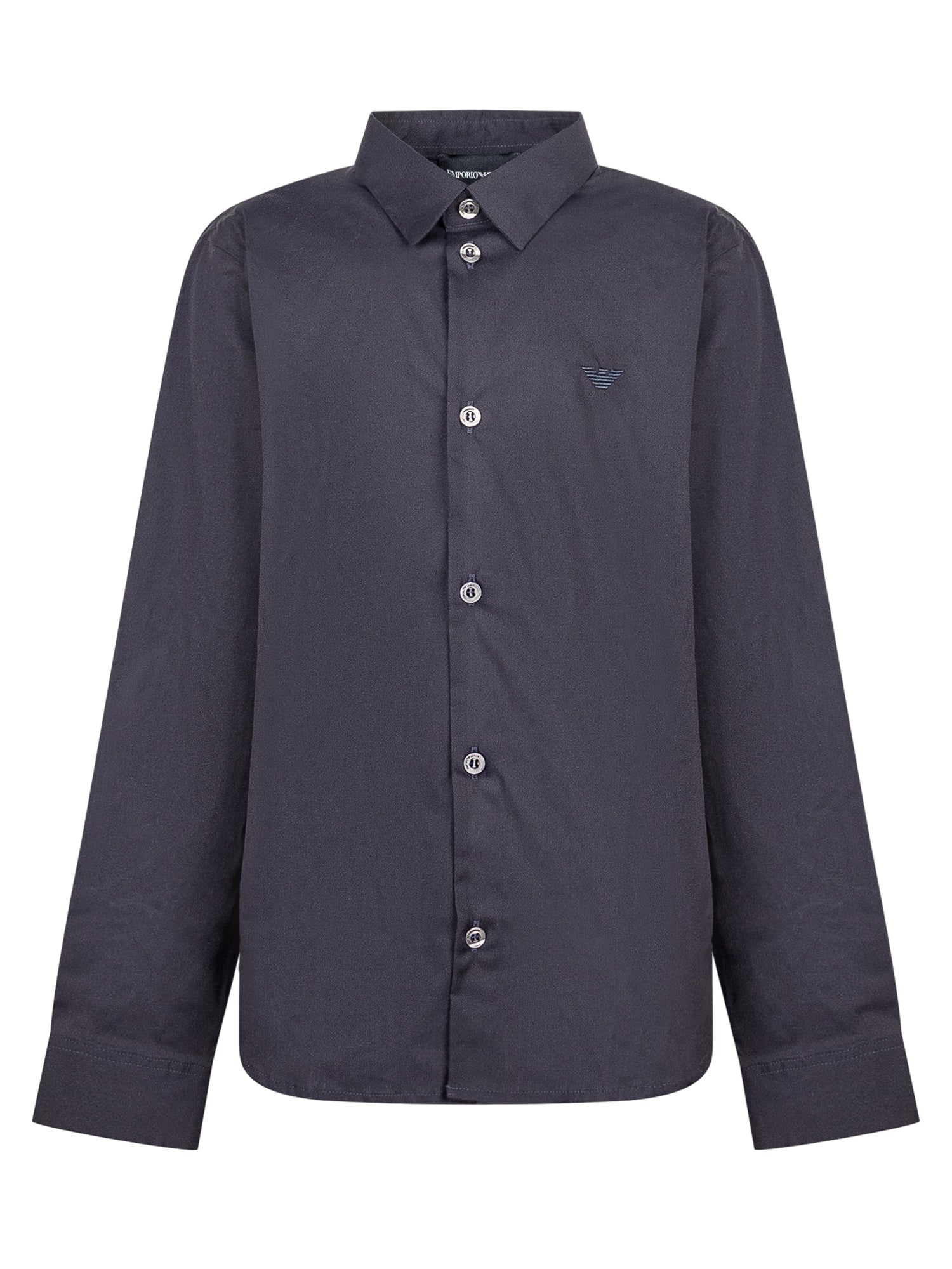 Camicia Emporio Armani da bambino in cotone nero con colletto classico e bottoni frontali. Rifinita con logo ricamato sul petto.