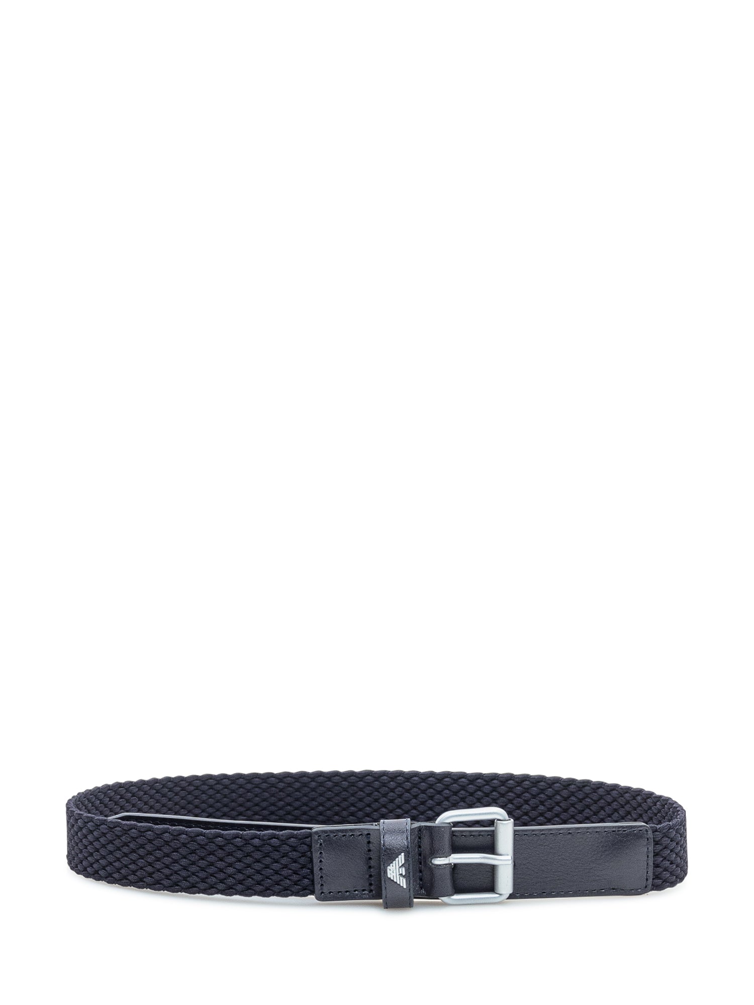 Cintura Emporio Armani in tessuto elasticizzato nero con inserti in pelle e fibbia in metallo.