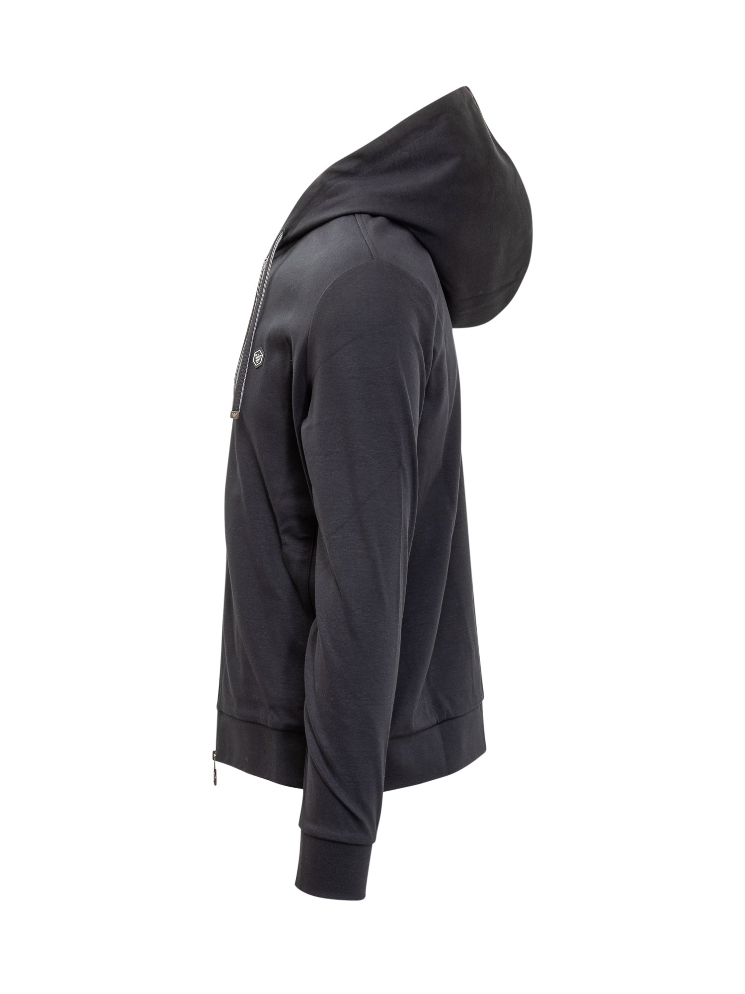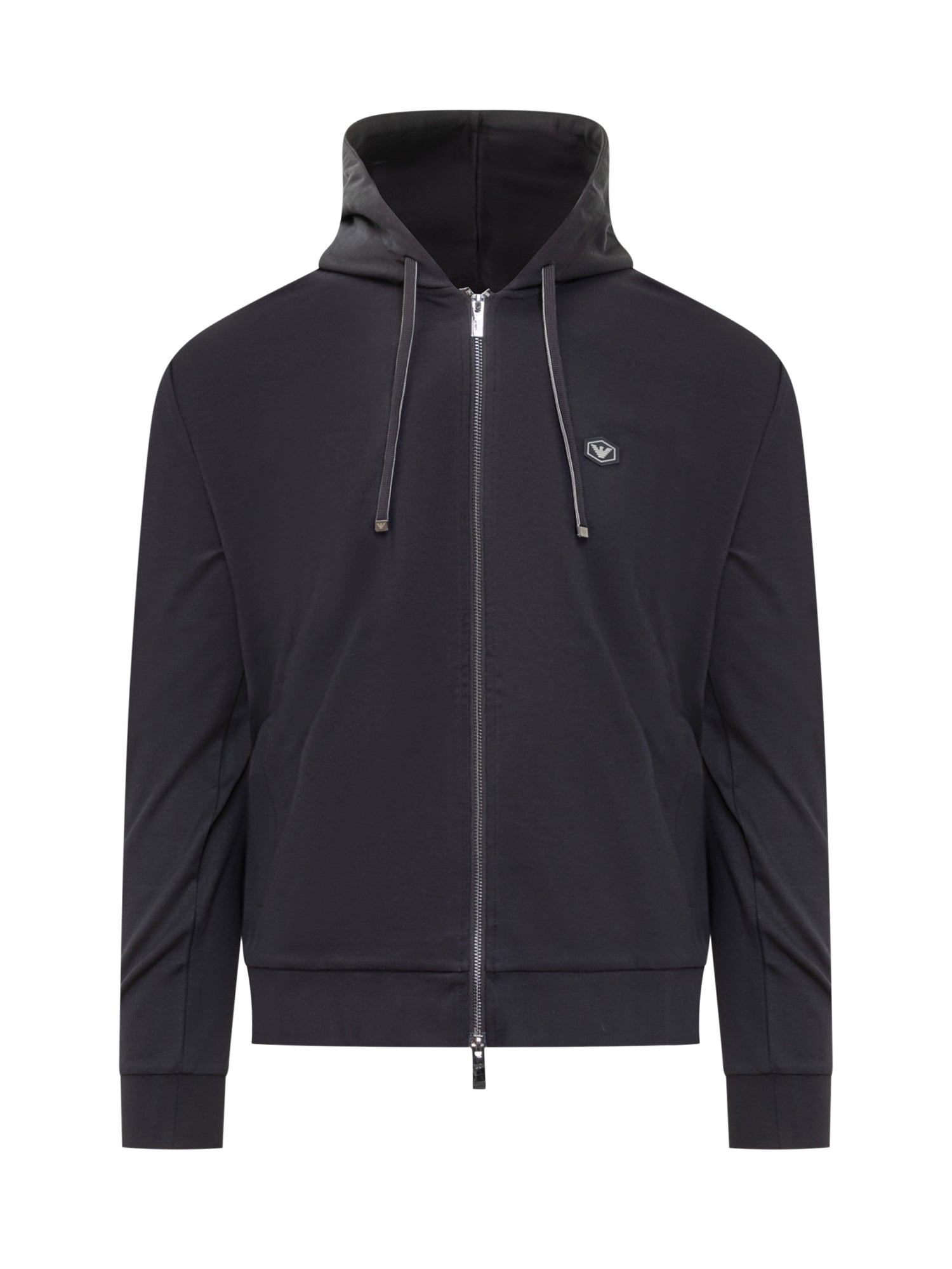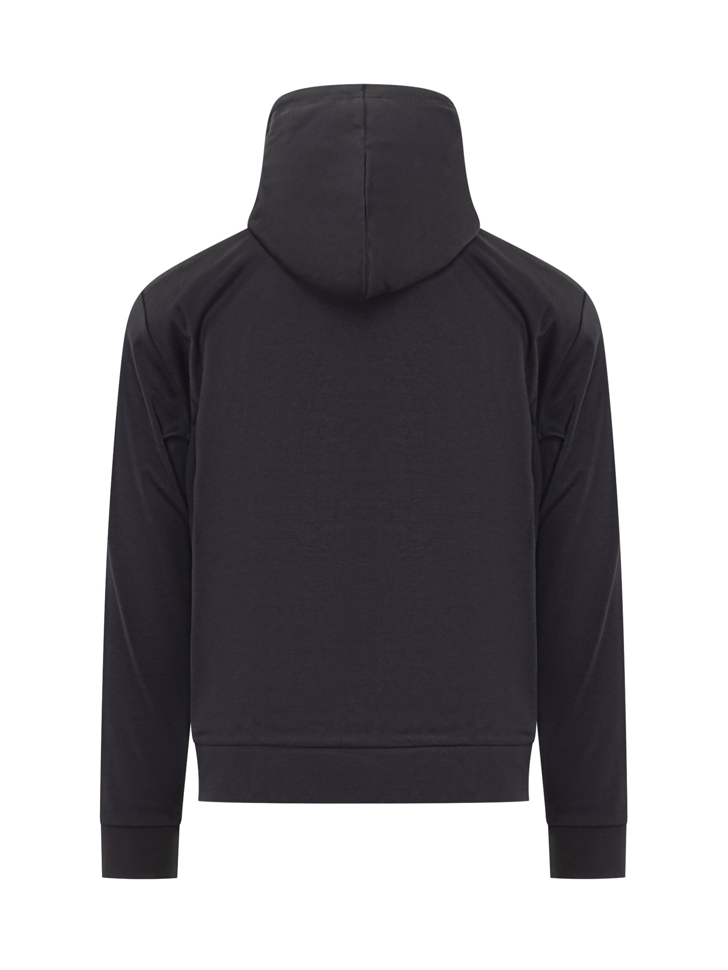 Felpa con cappuccio e zip integrale Emporio Armani in cotone stretch nero. Caratterizzata dal logo tono su tono applicato sul petto e dalla coulisse con finalini logati.