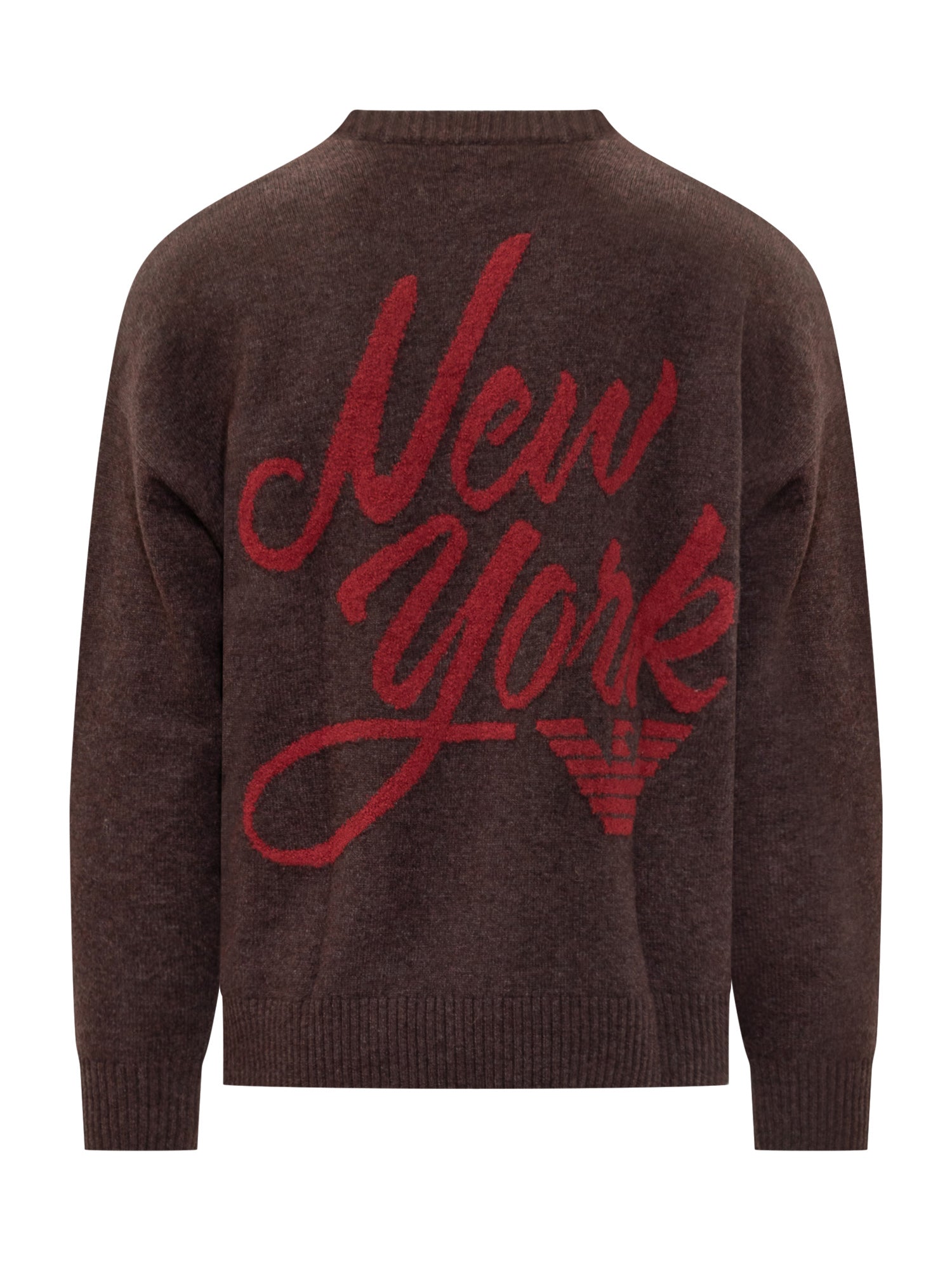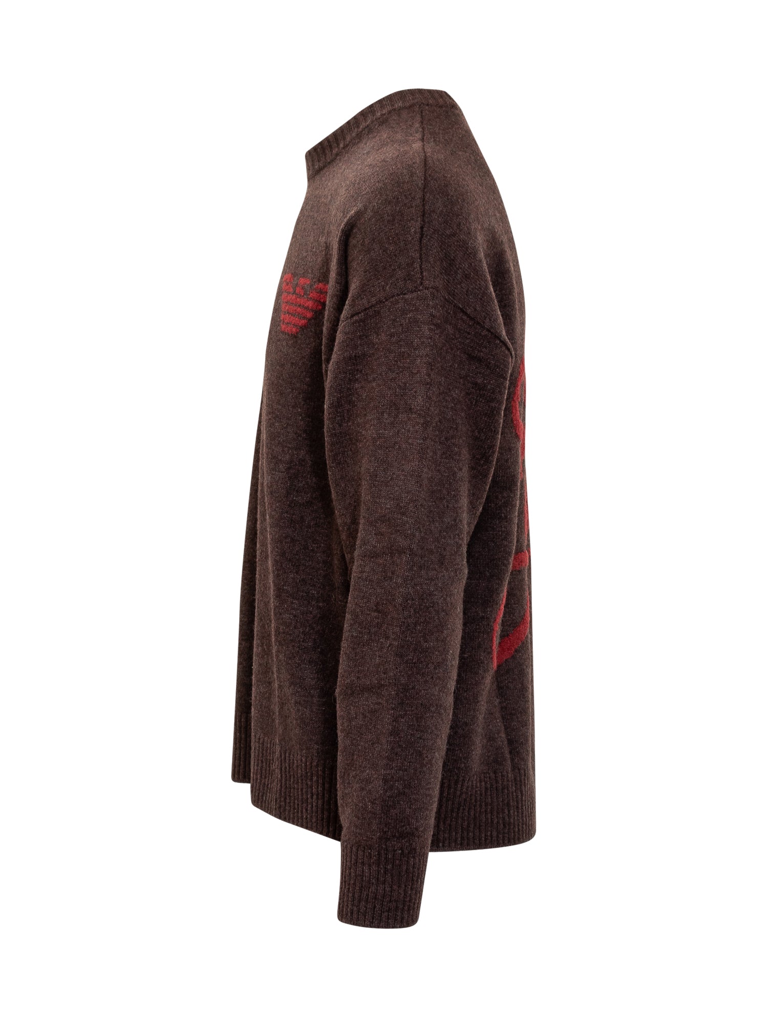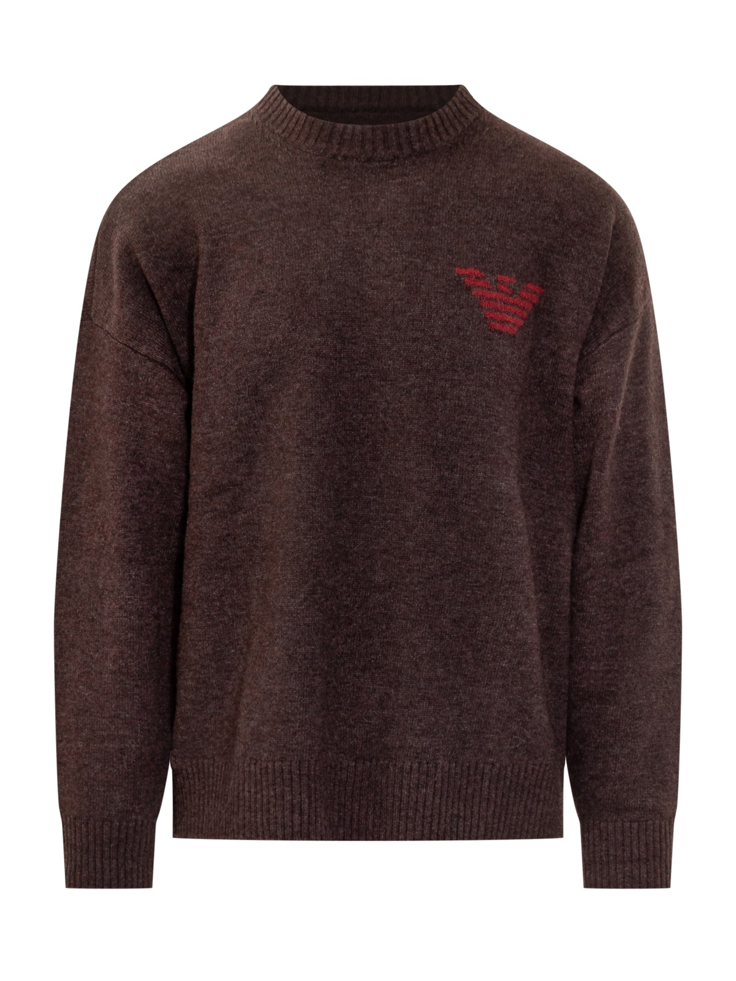 Maglione Emporio Armani in lana marrone con logo aquila rosso ricamato sul petto.