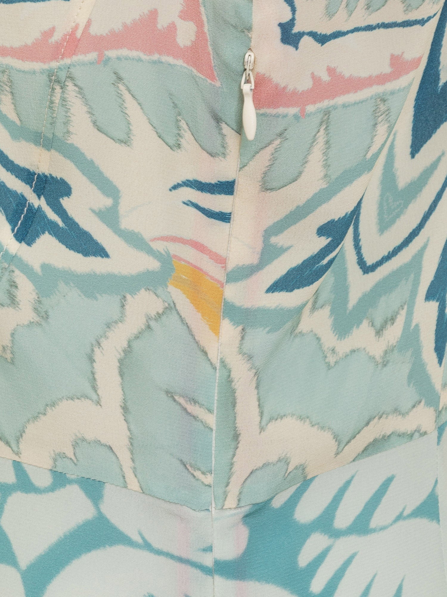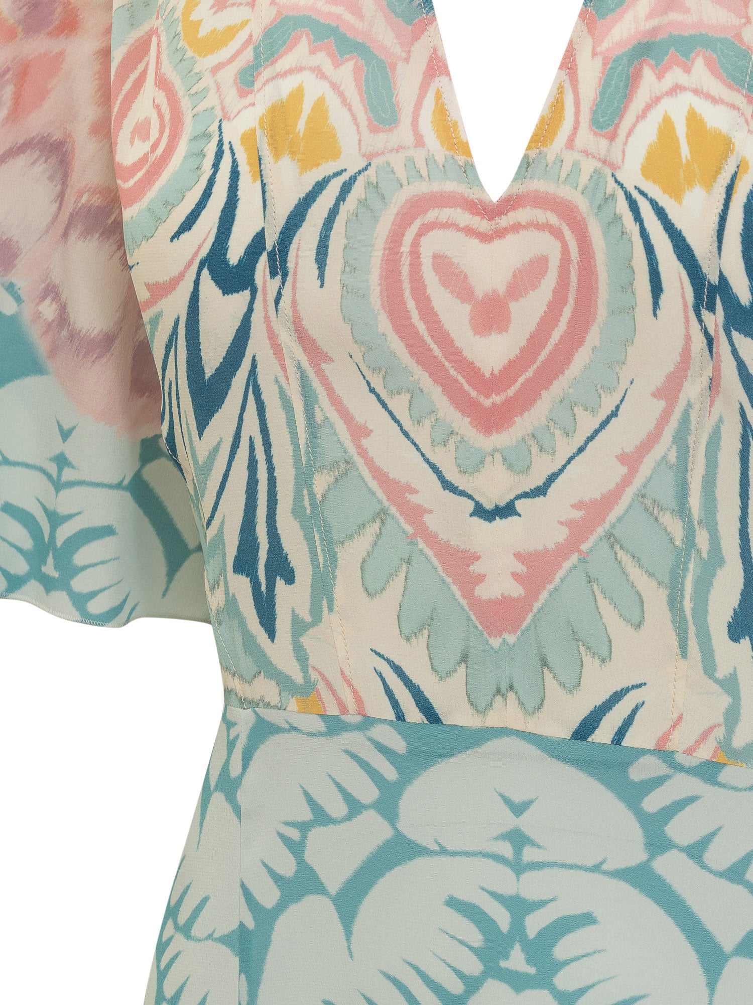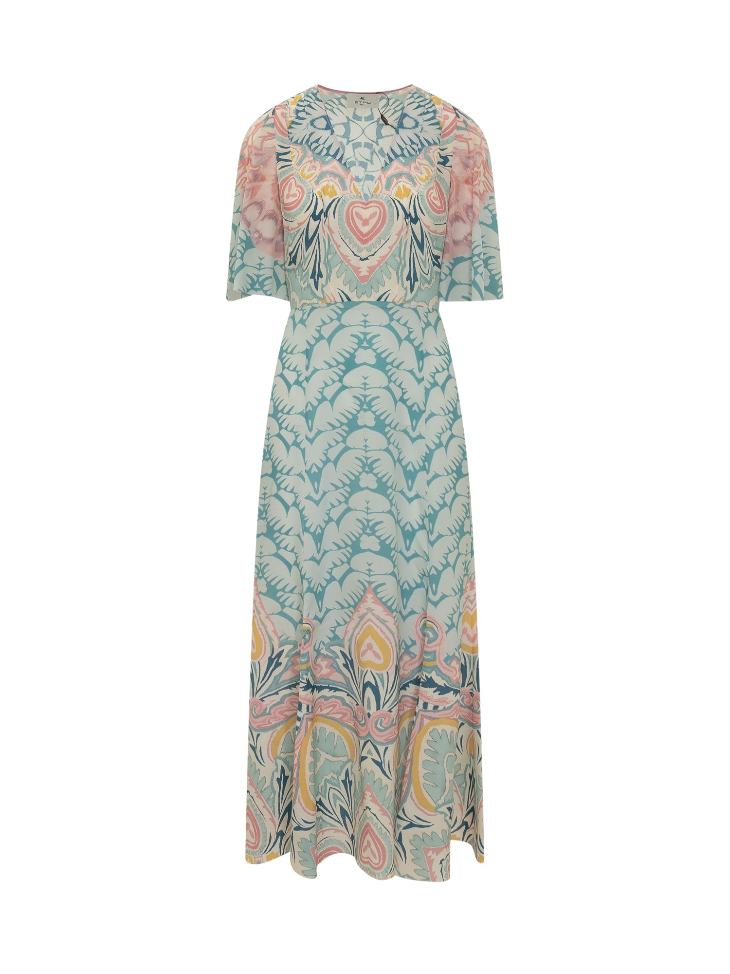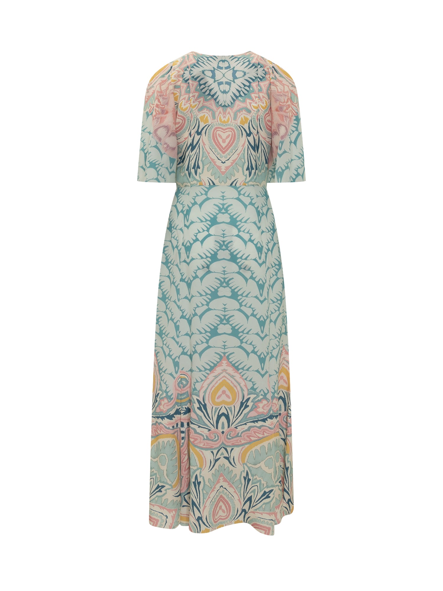 Abito lungo in seta a maniche corte. Scollo a V classico. Chiusura con zip laterale. Motivo fantasia multicolore all-over.