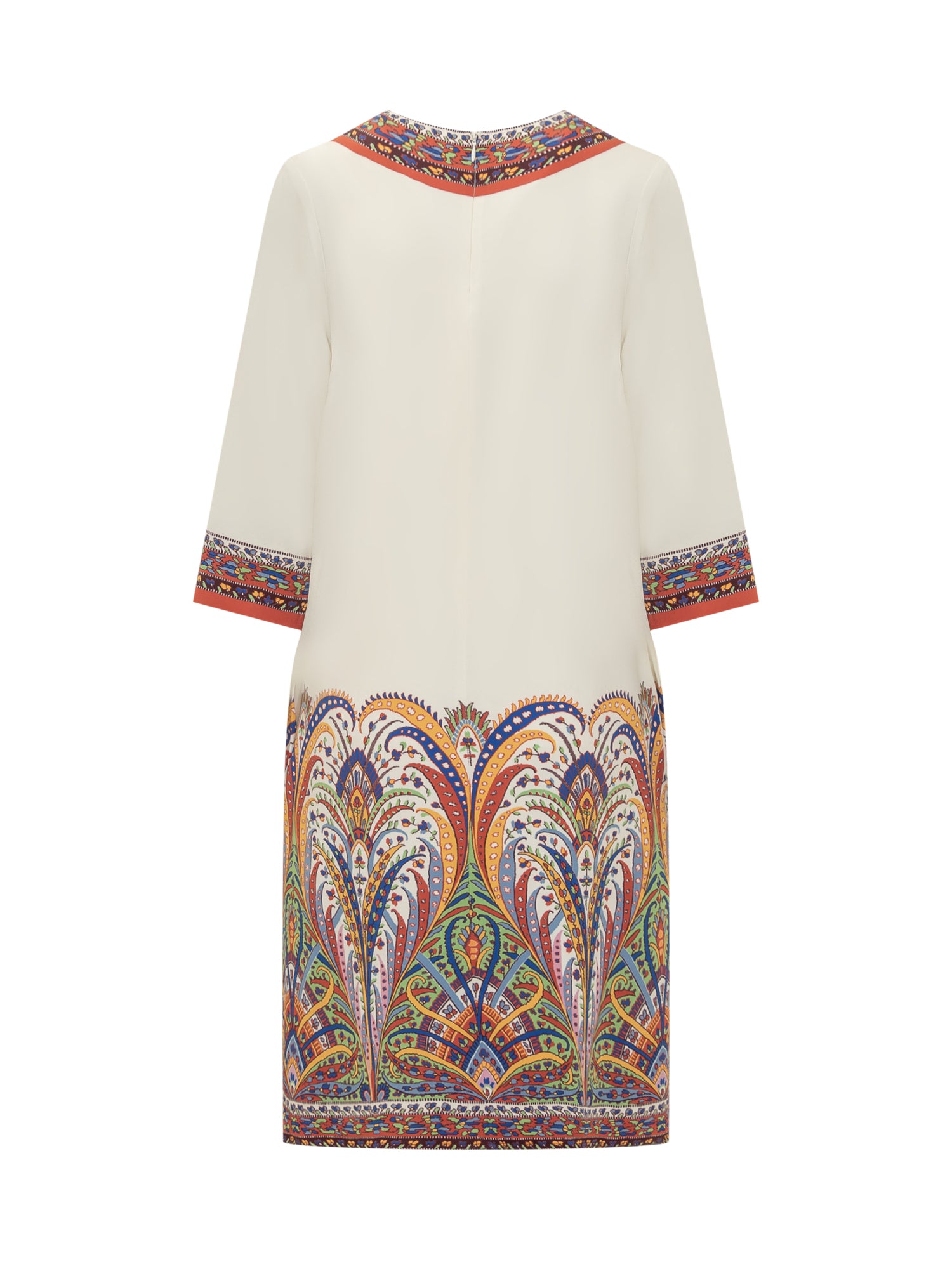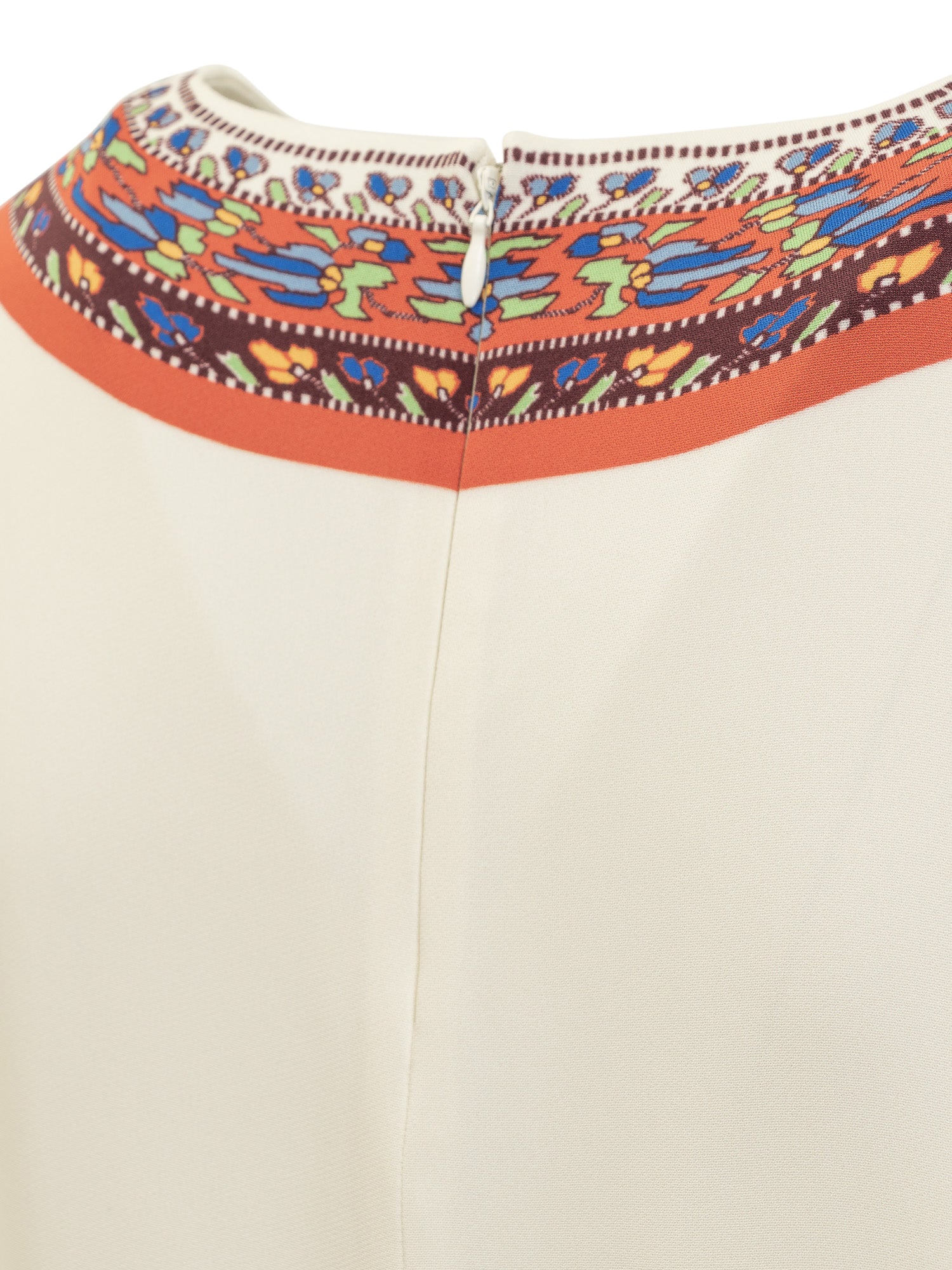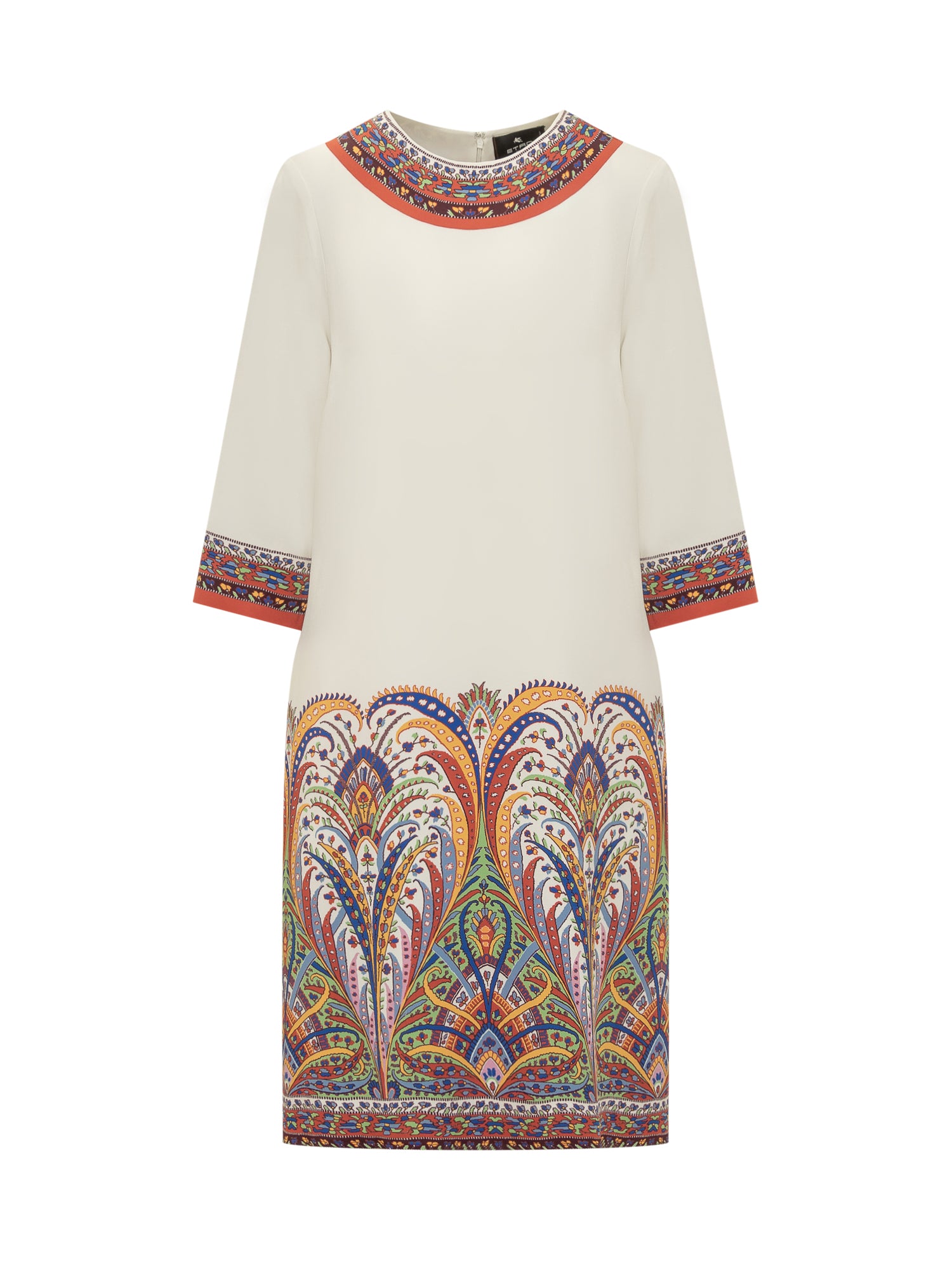 Abito medio in maglia. Stampa sul collo, polsi e fondo. Girocollo. Chiusura con zip sul retro. Tasche laterali.