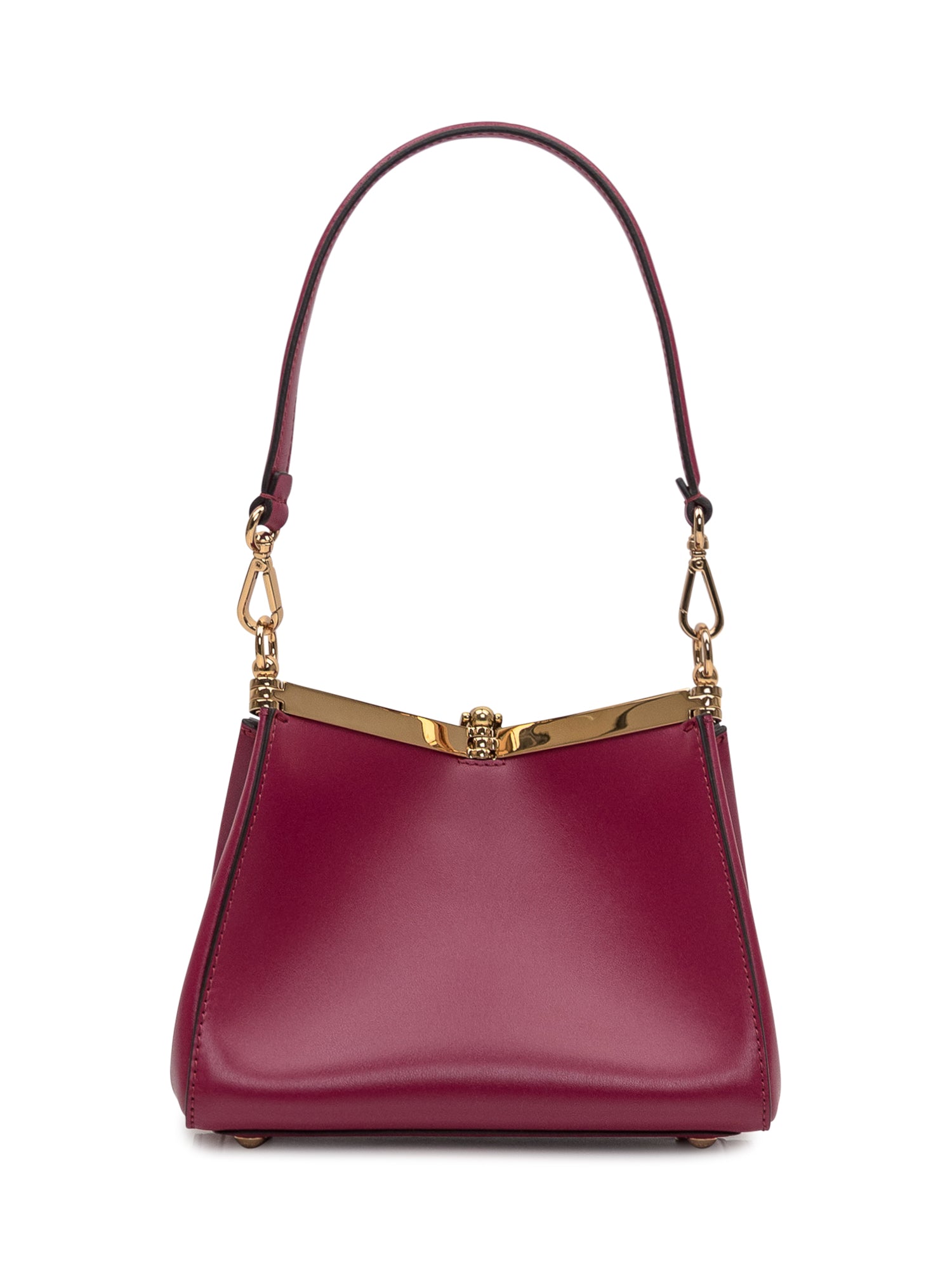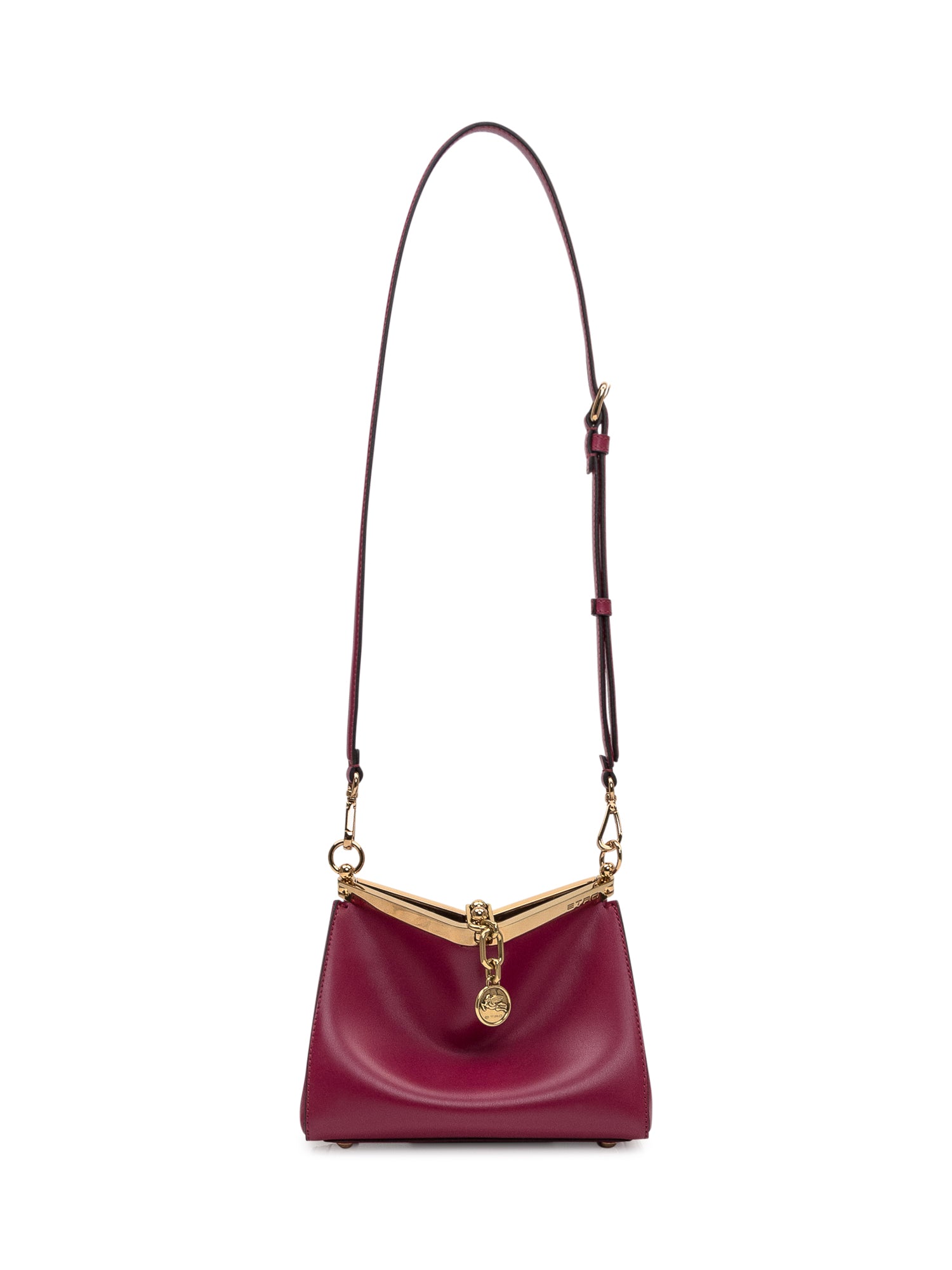 Compatta ed elegante, la borsa a spalla Etro è realizzata in pelle bordeaux con dettagli in metallo dorato e medaglione Pegaso. Perfetta da indossare a mano o a spalla.