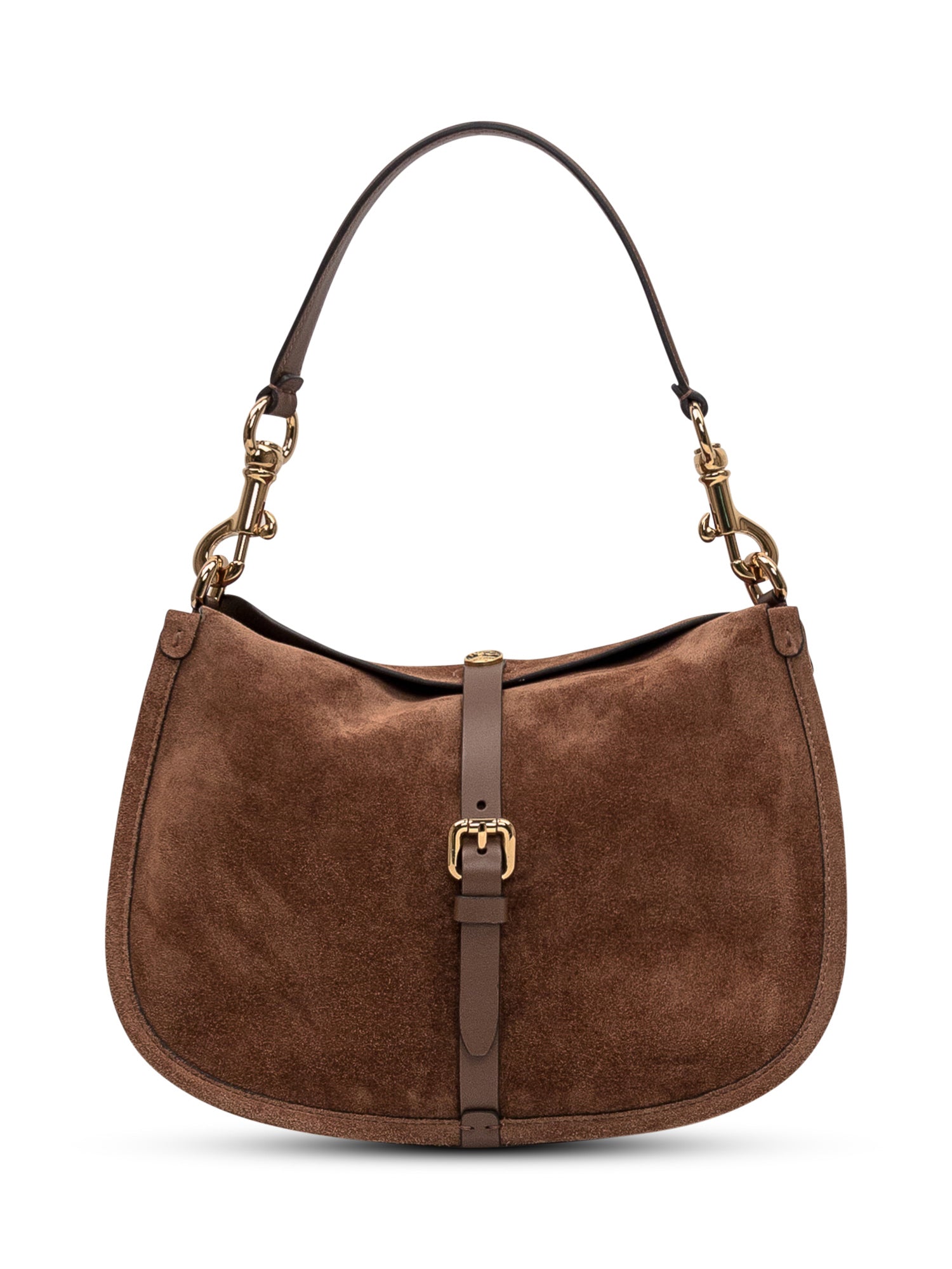 Borsa a spalla Etro in morbido suede marrone con dettagli in pelle liscia e fibbia dorata. Design curvo e raffinato.