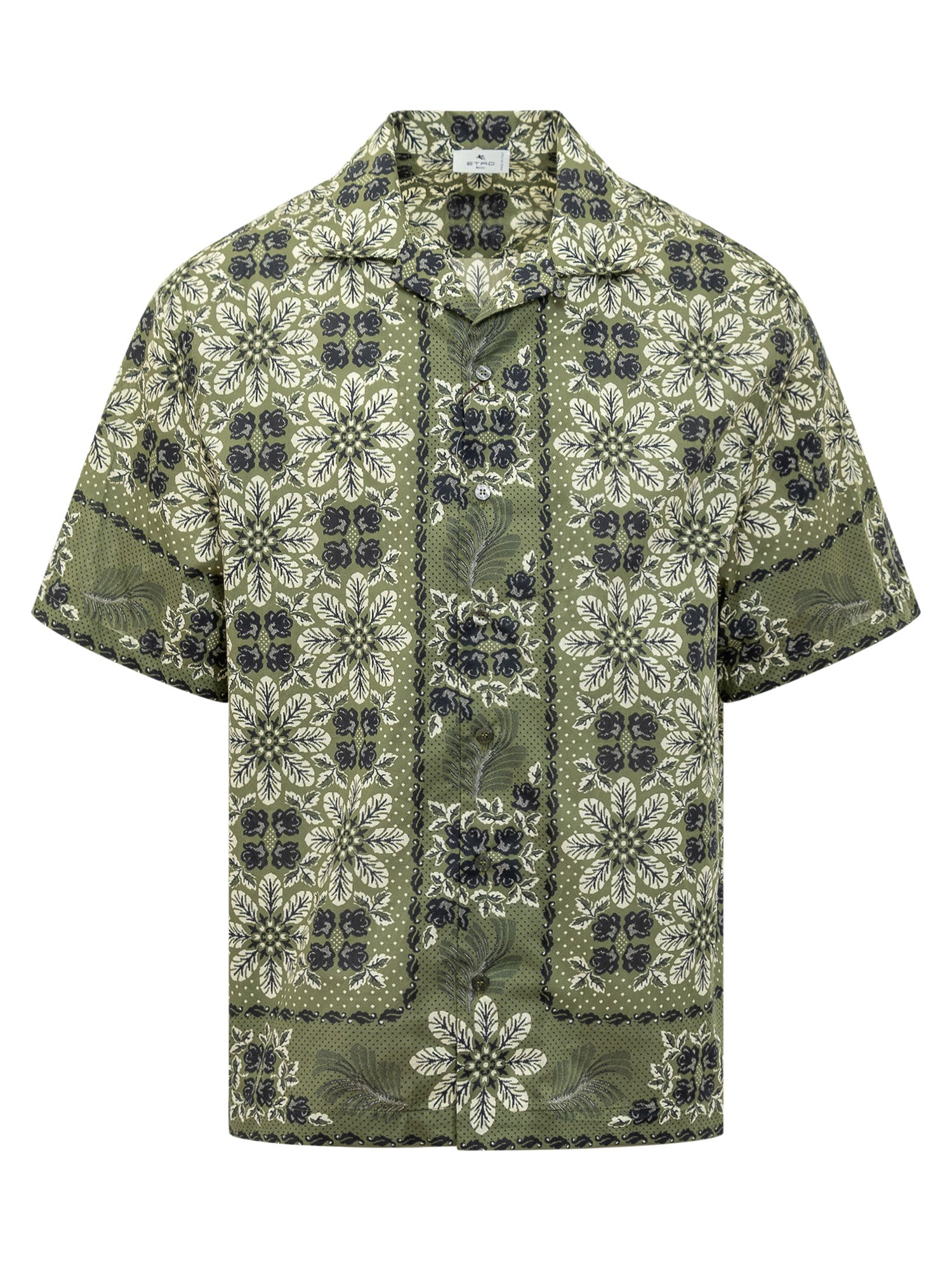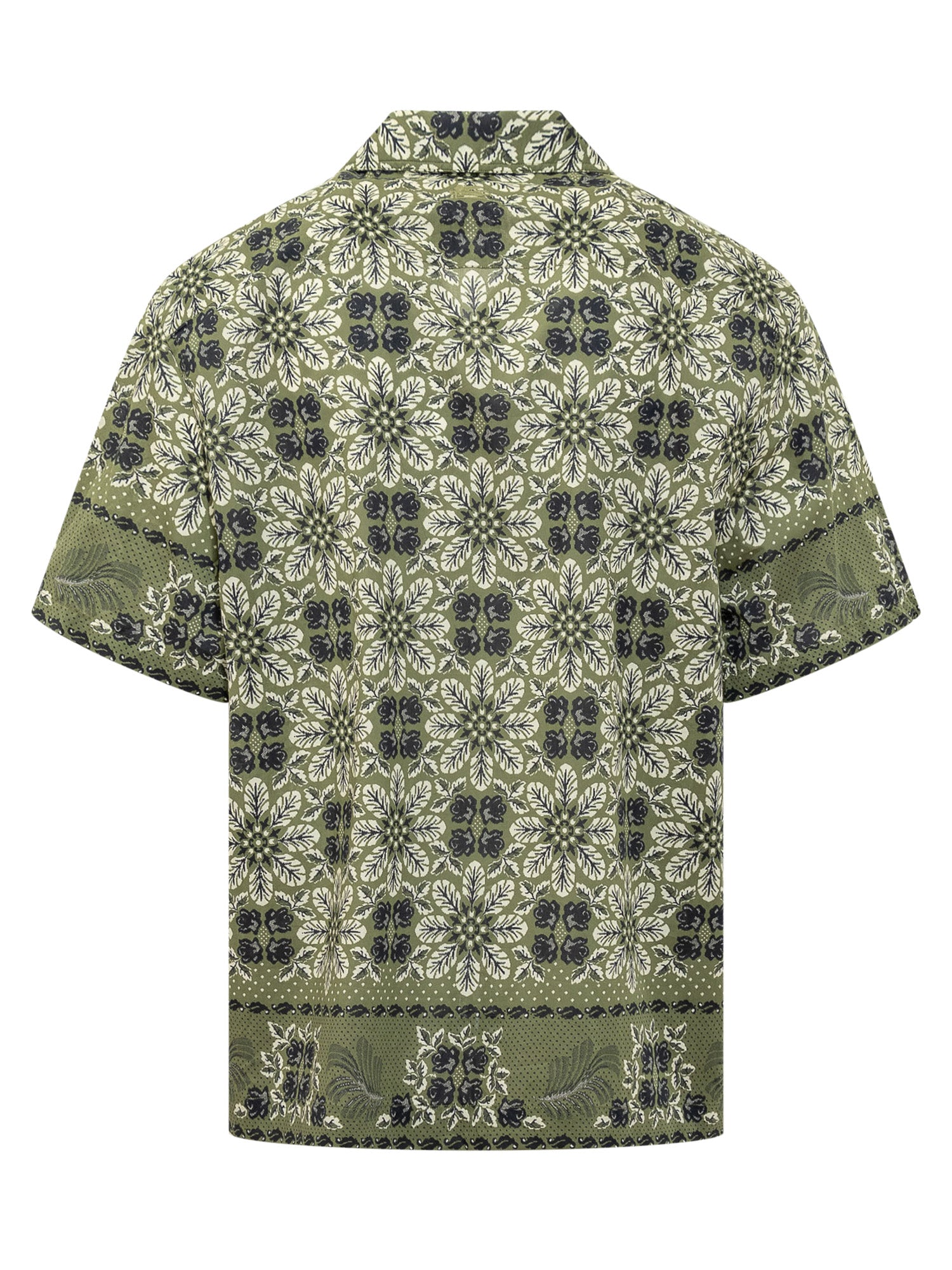 Camicia bowling realizzata in cotone. Colletto bowling. Chiusura con bottoni. Decorazione con stampa foliage floreale all over.