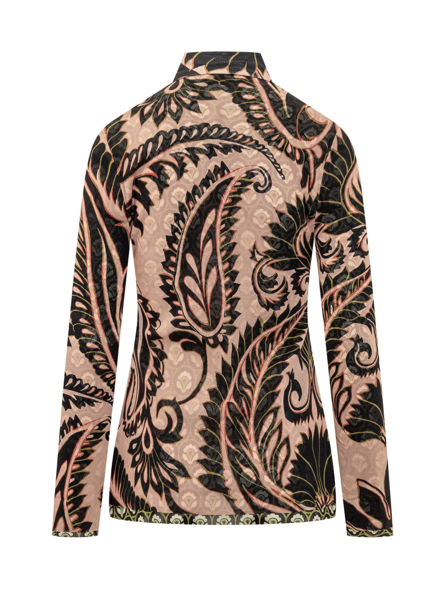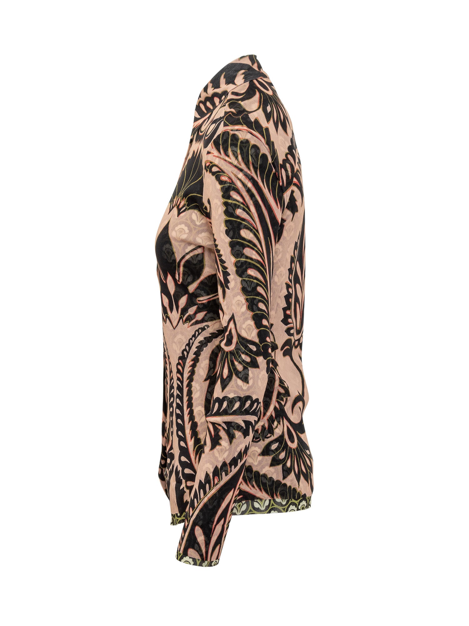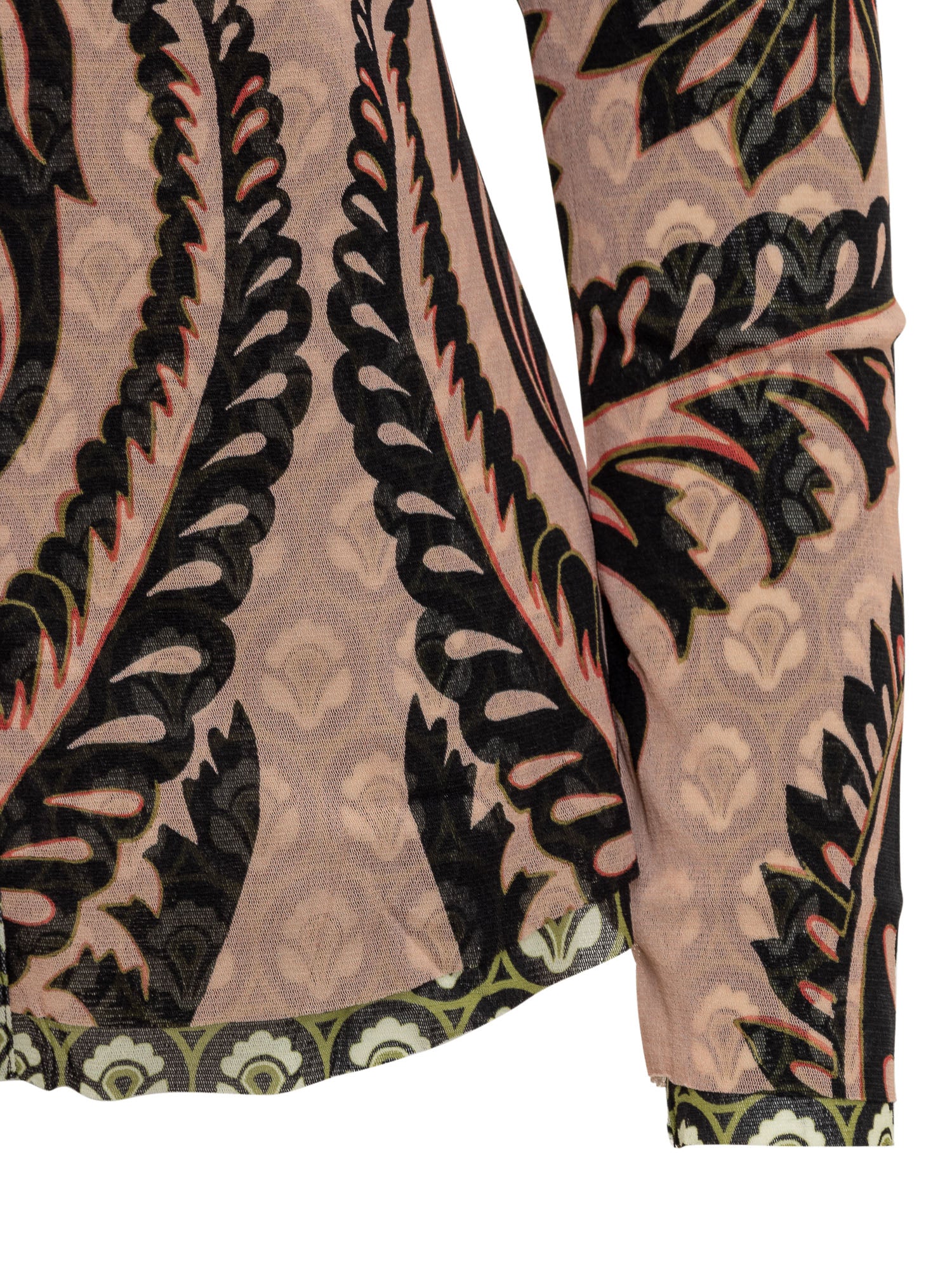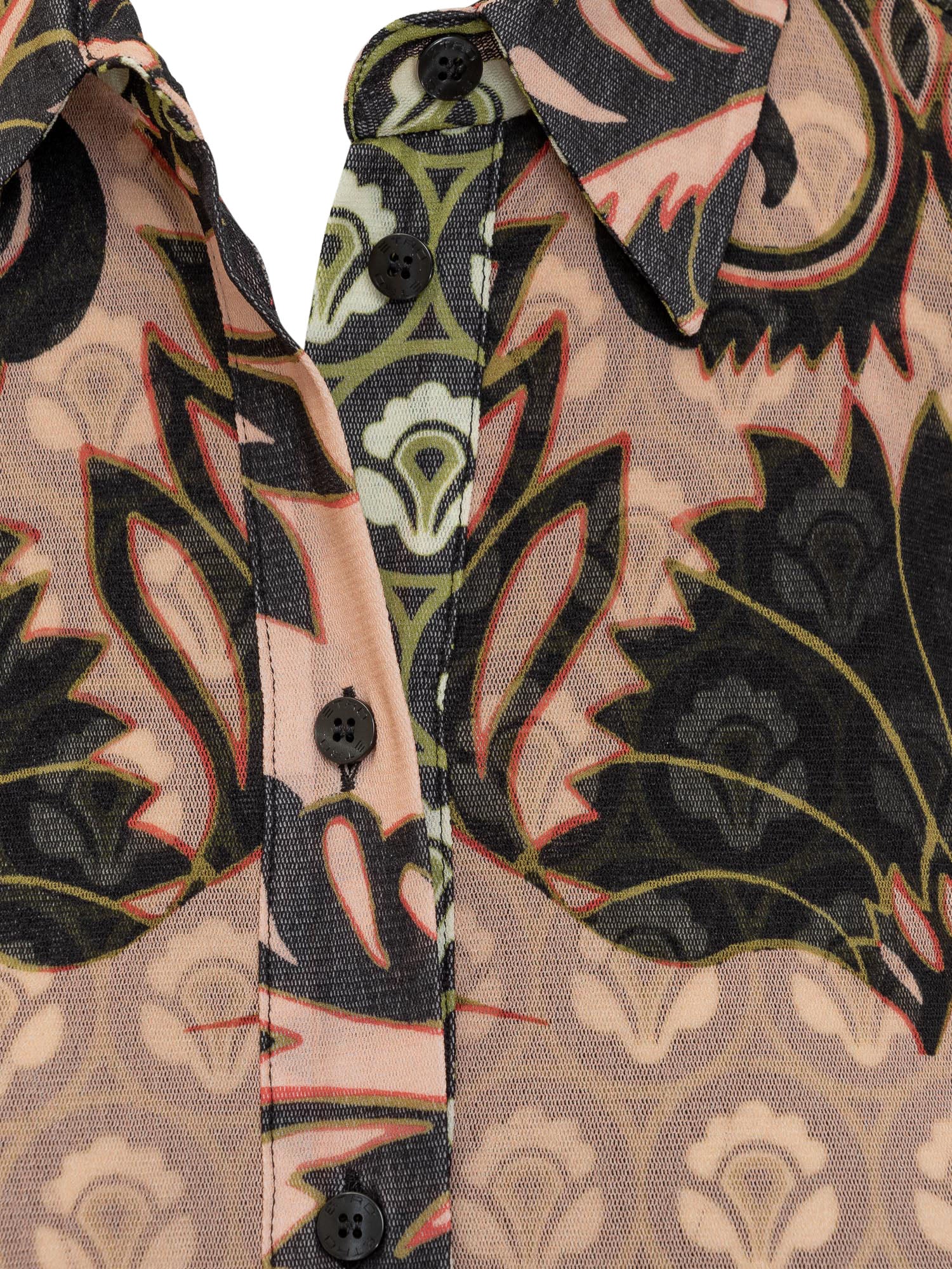 Camicia a maniche lunghe realizzata in tulle a doppio strato. Colletto classico. Chiusura con bottoni. Stampa con motivi Angkor e Aurea. Linea aderente.