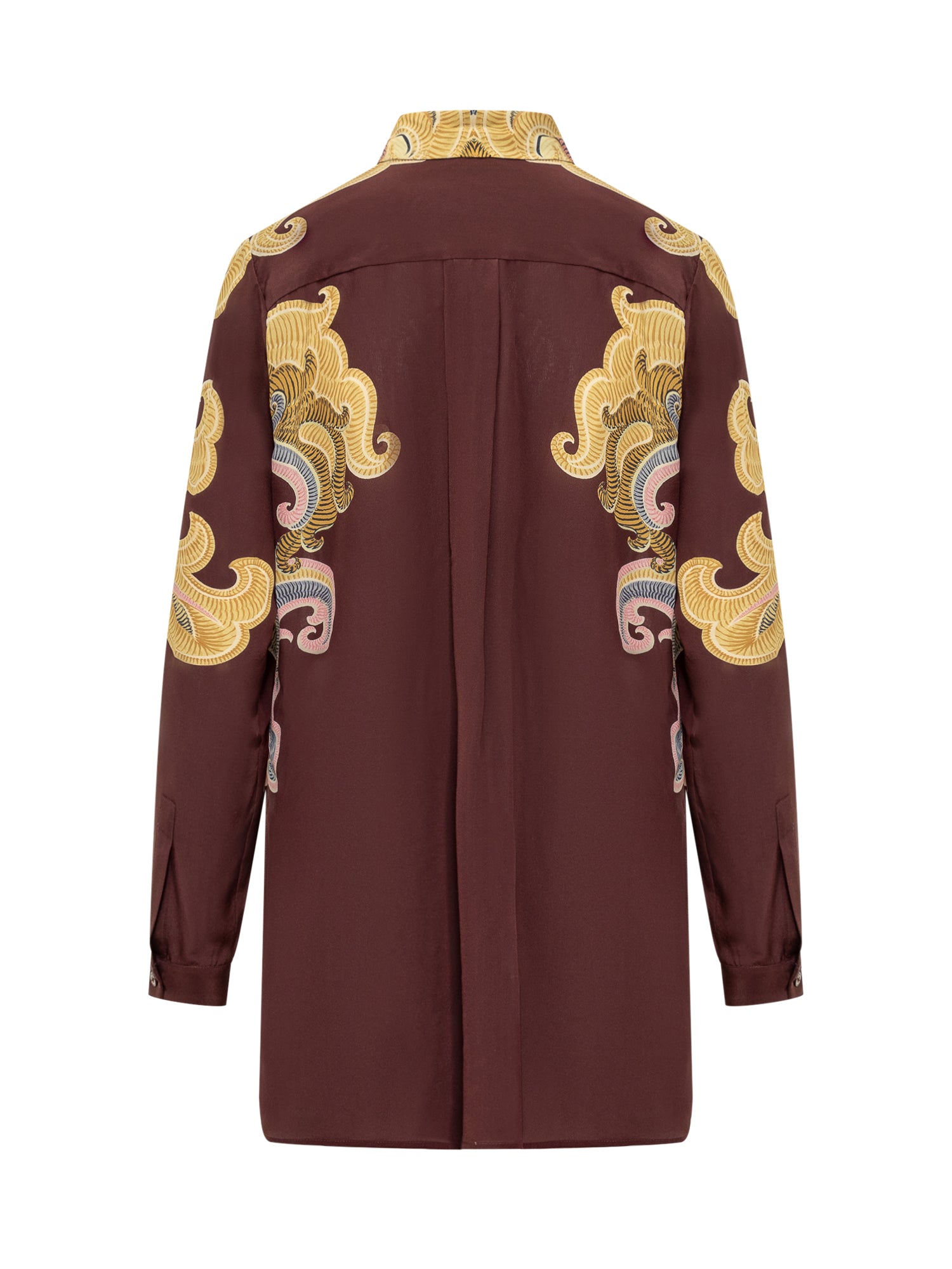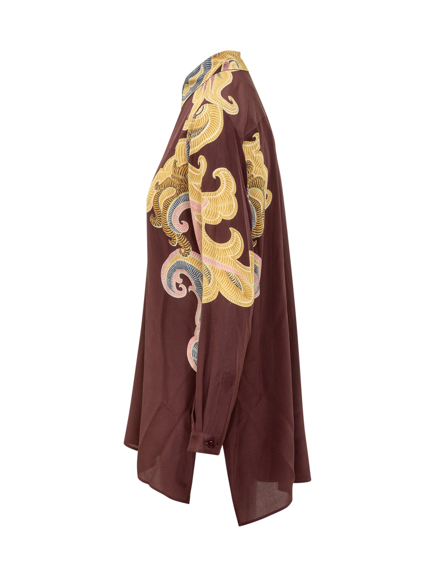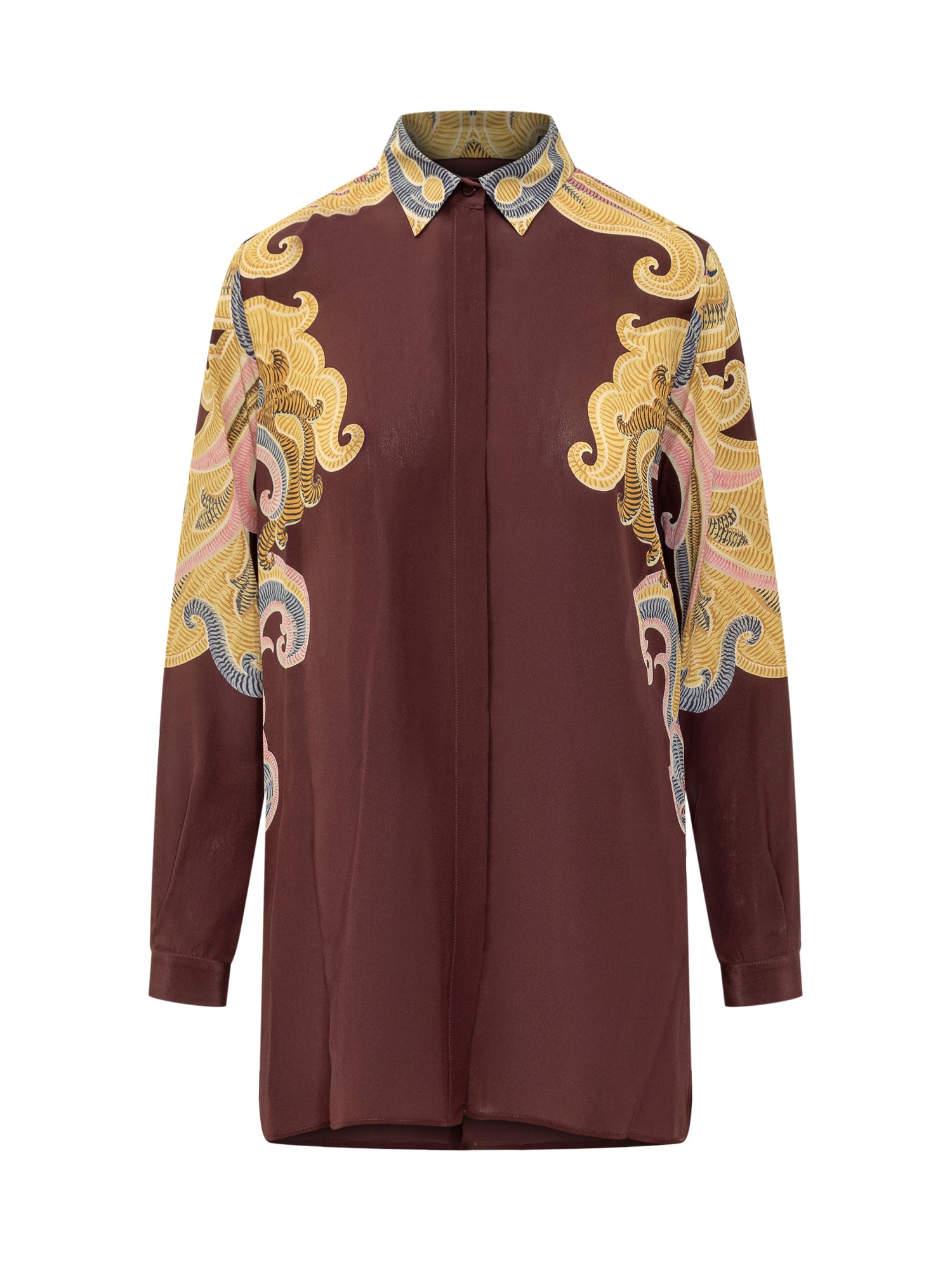 Camicia maxi a maniche lunghe in seta. Colletto a punta. Chiusura con bottoni nascosti. Polsini con bottone. Stampa piazzata foliage floreale. Spacchi laterali. Orlo asimmetrico.