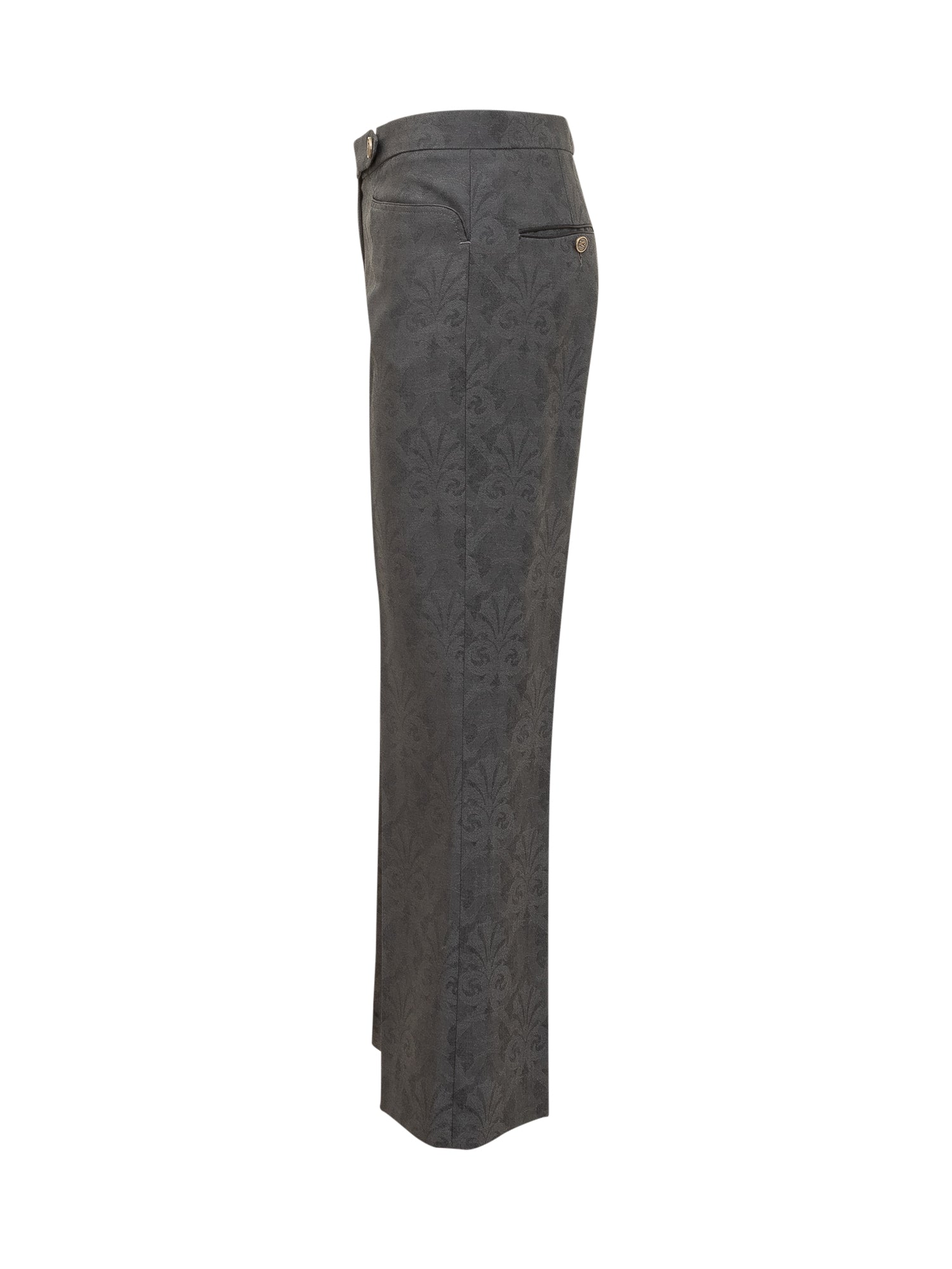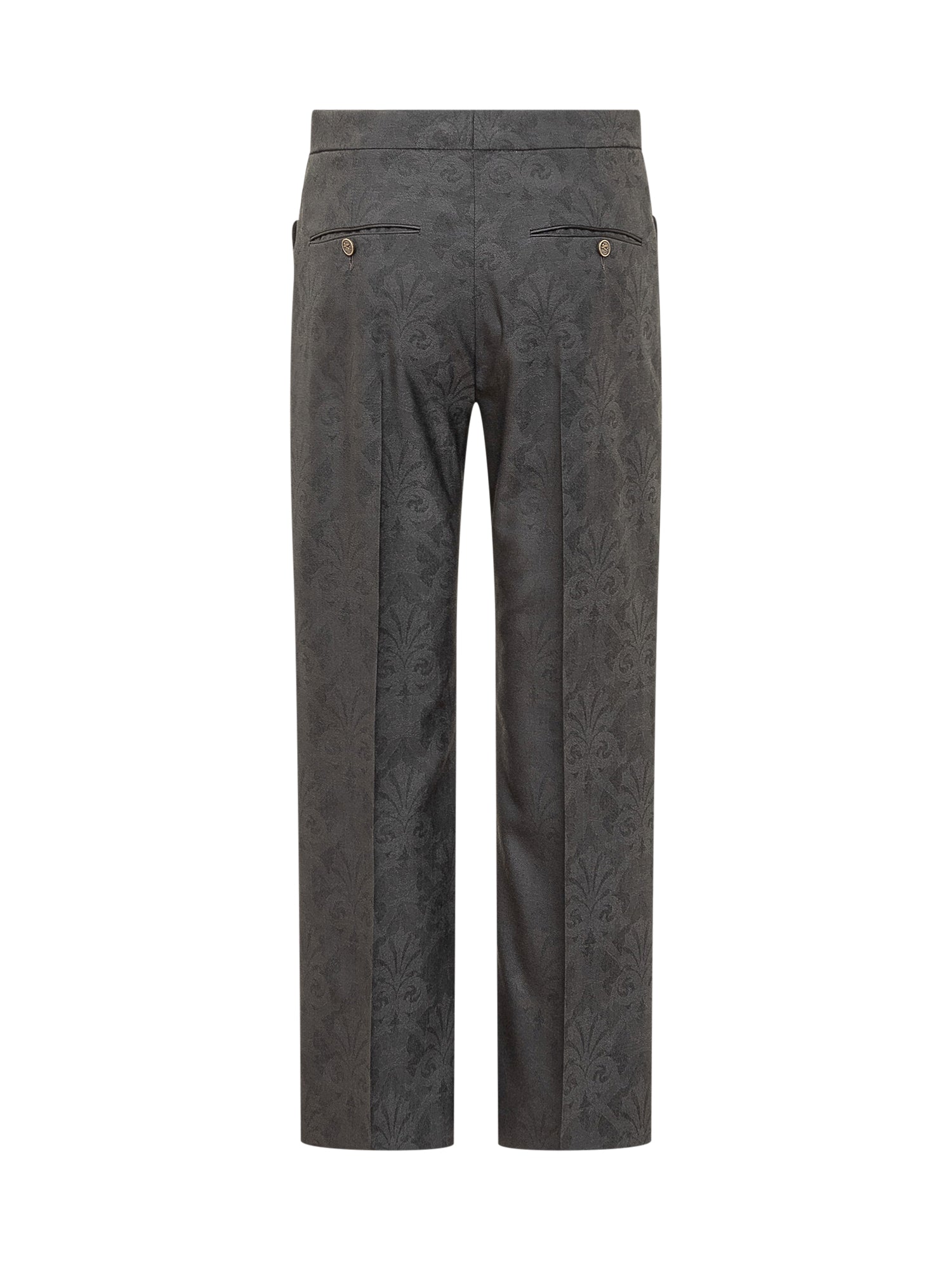 Pantalone nero in lana. Tasche sul davanti e sul retro. Chiusura con zip e bottone. Fantasia in jacquard all-over.