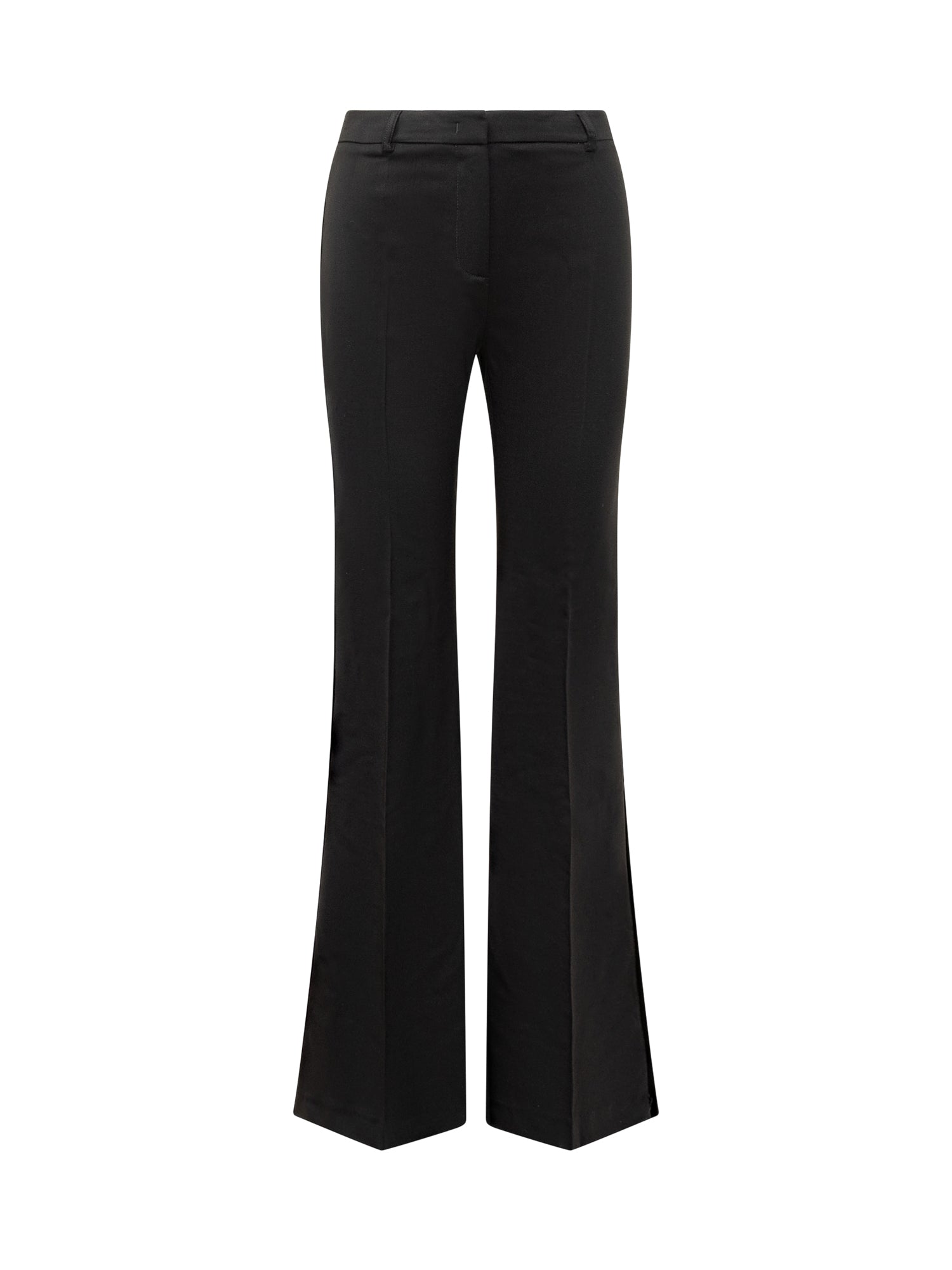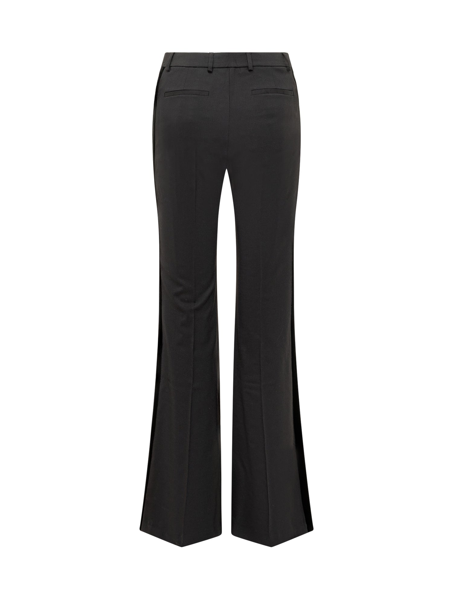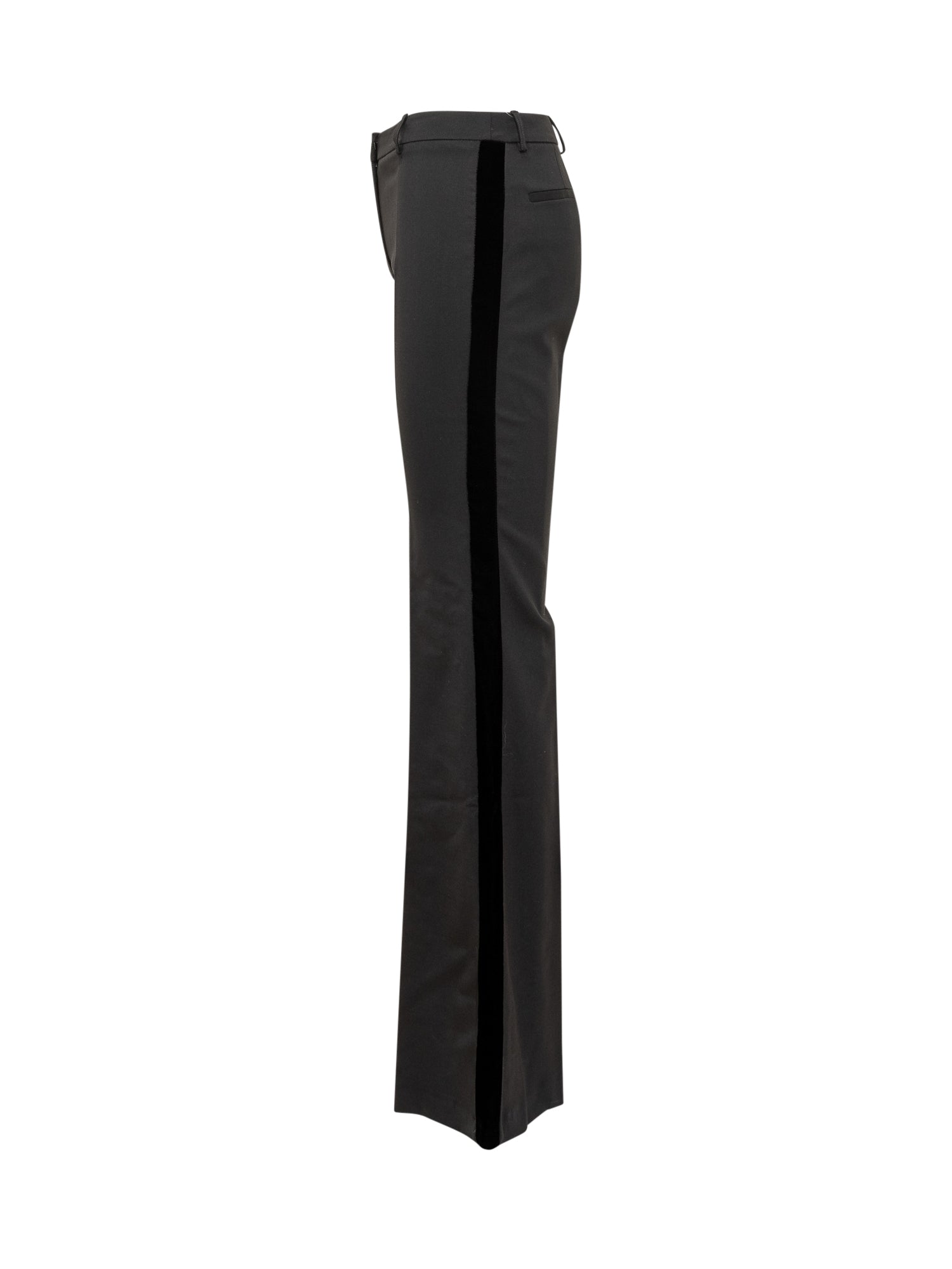Pantalone lungo svasato in misto lana. Chiusura con gancino e zip. Passanti per cintura. Bande nere laterali. Due tasche a filetto sul retro. Modello con piega stirata.