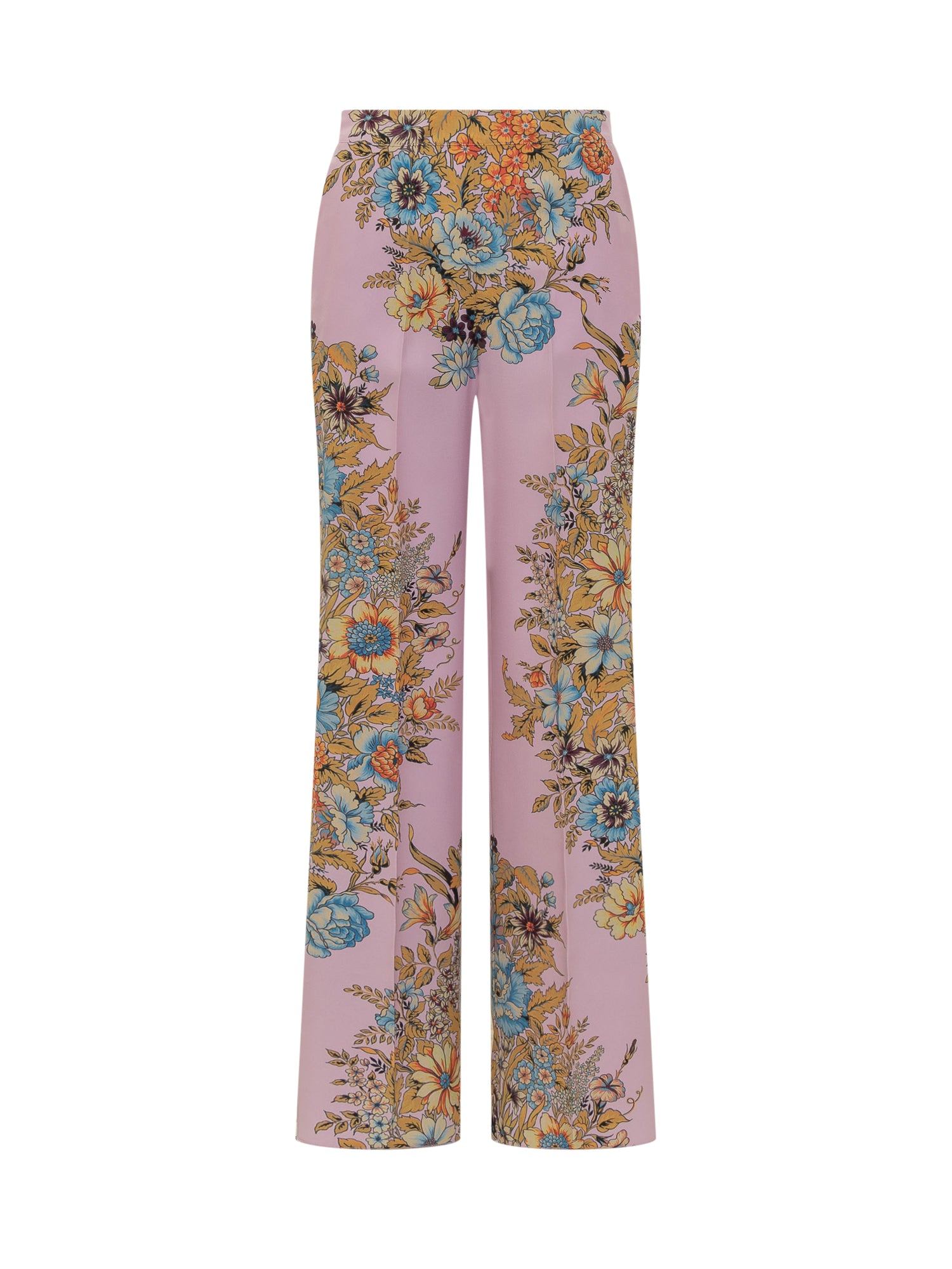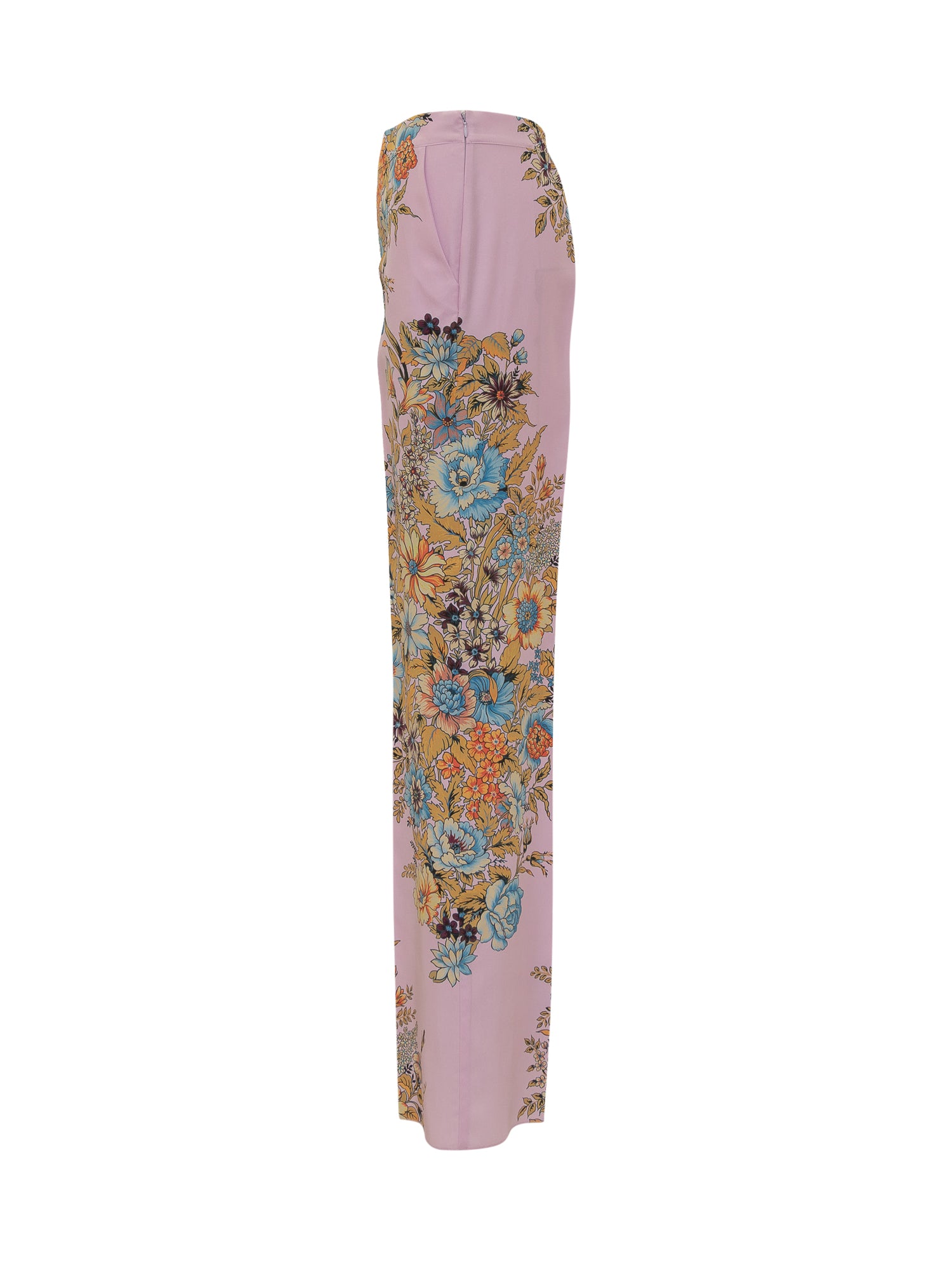 Pantalone lungo a palazzo. Chiusura con zip e gancino. Due tasche laterali. Motivo Bouquet Bandana.