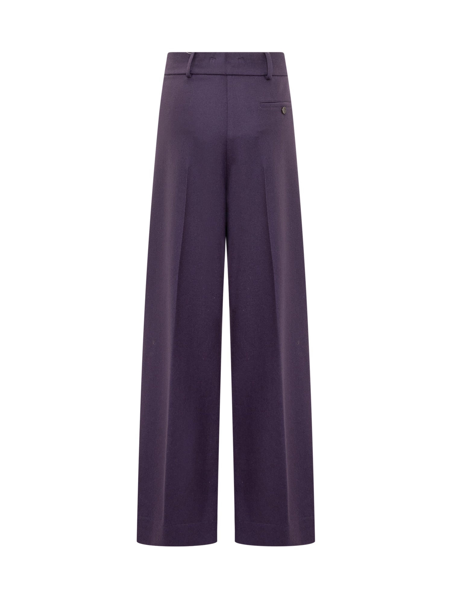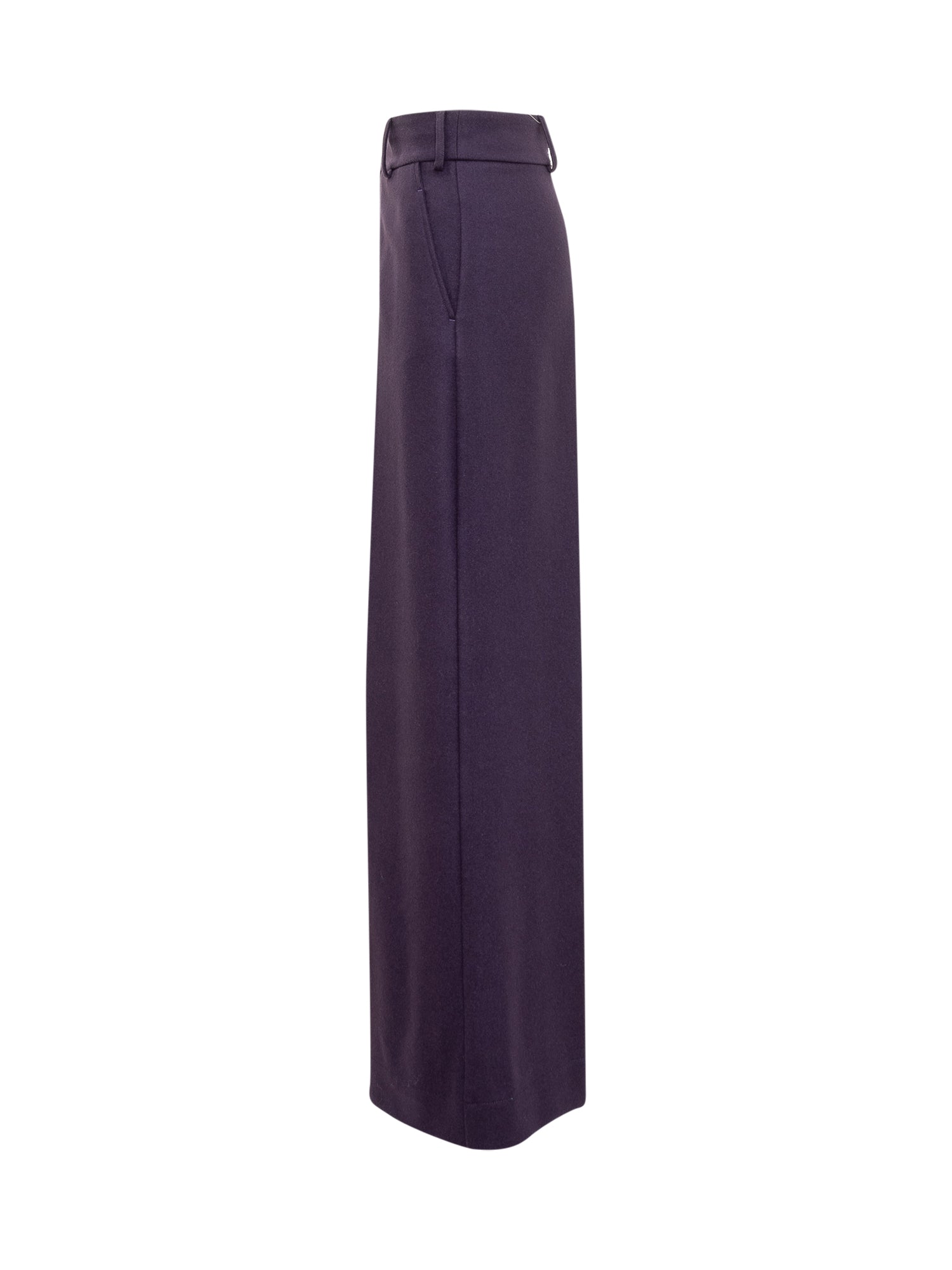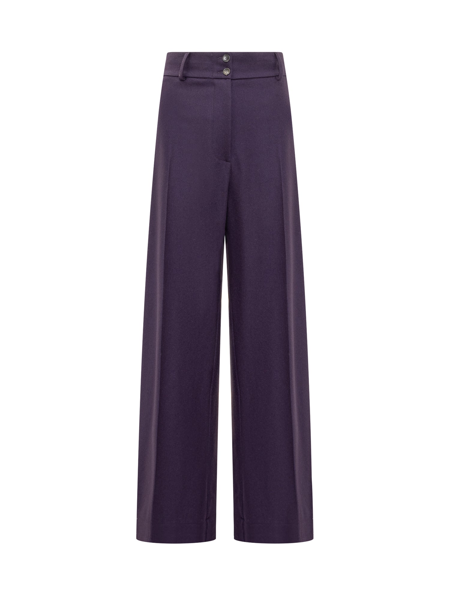 Pantalon lungo viola. Tasche laterali. Tasca sul retro. Passanti per cintura. Chiusura con zip e bottoni.