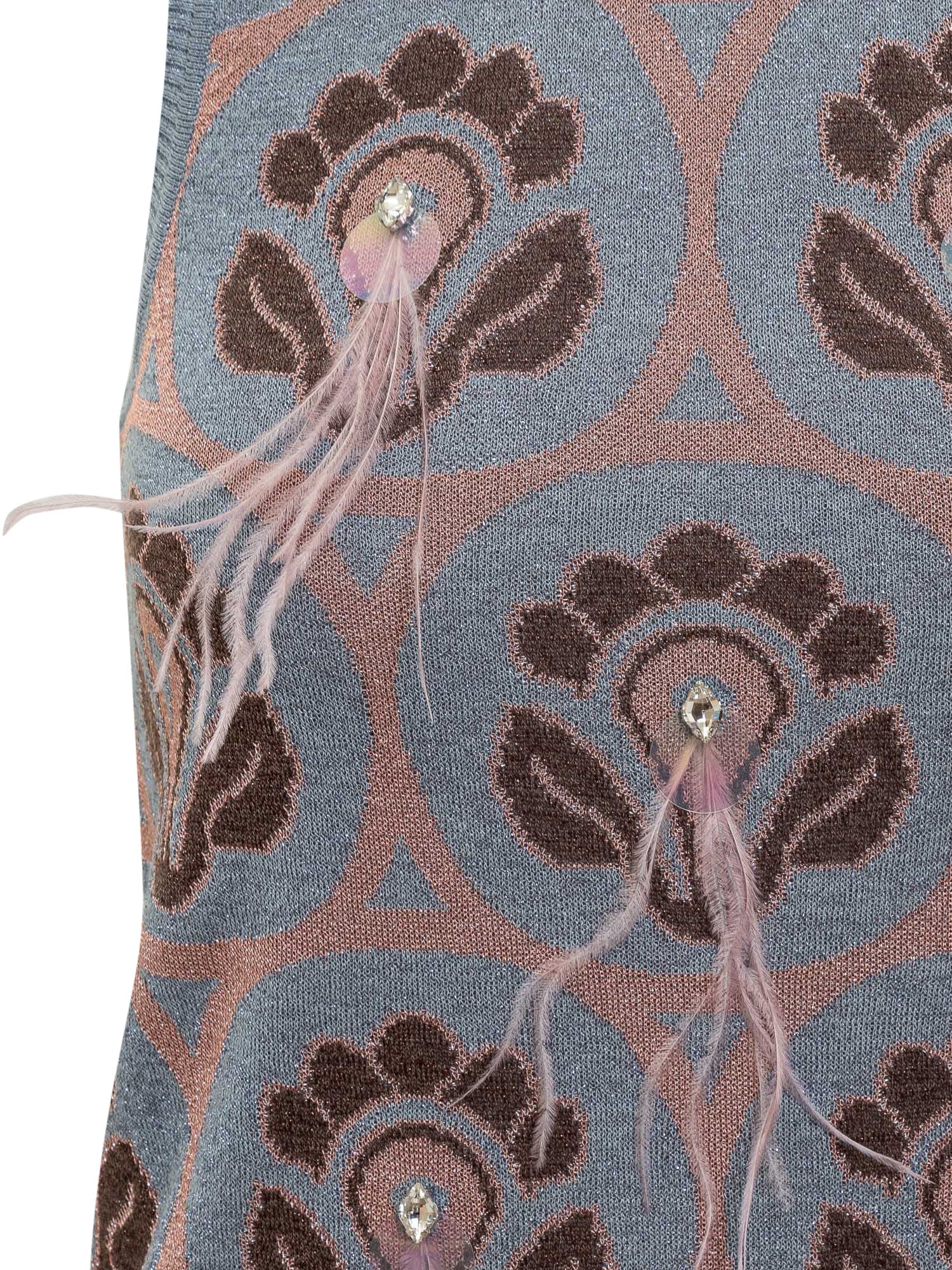 Top smanicato in maglia jacquard. Girocollo. Orli a costine. Motivo Aurea con piume e strass applicati.